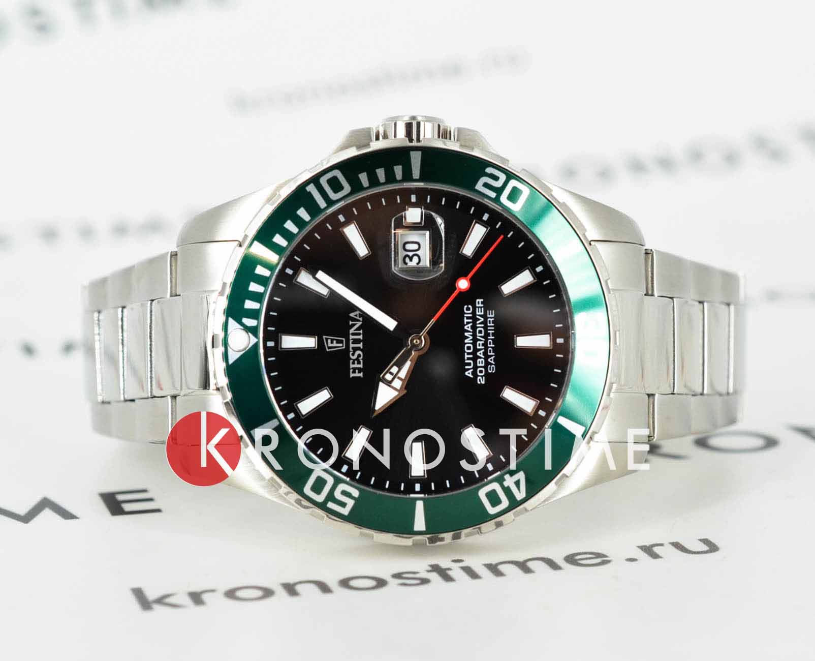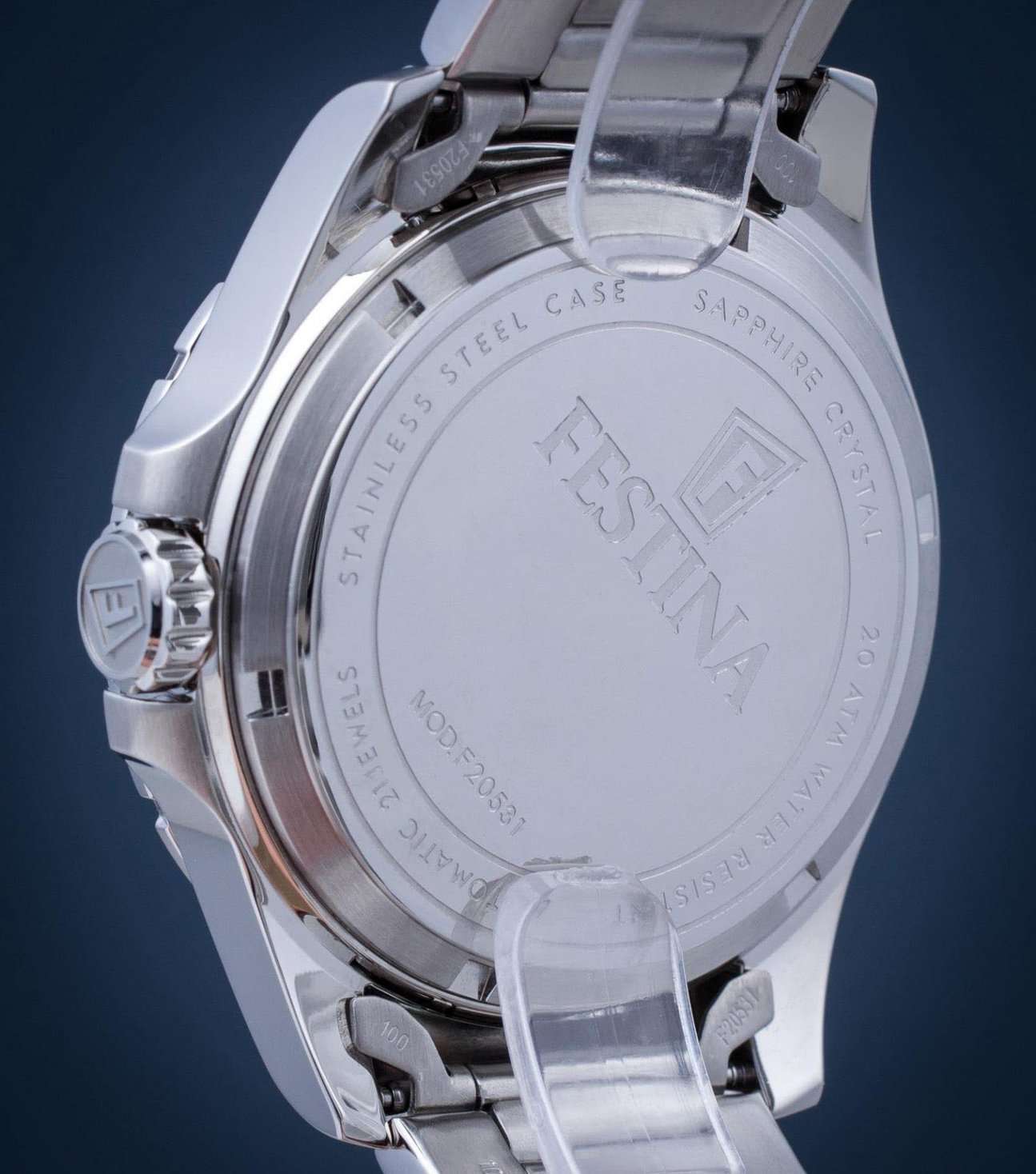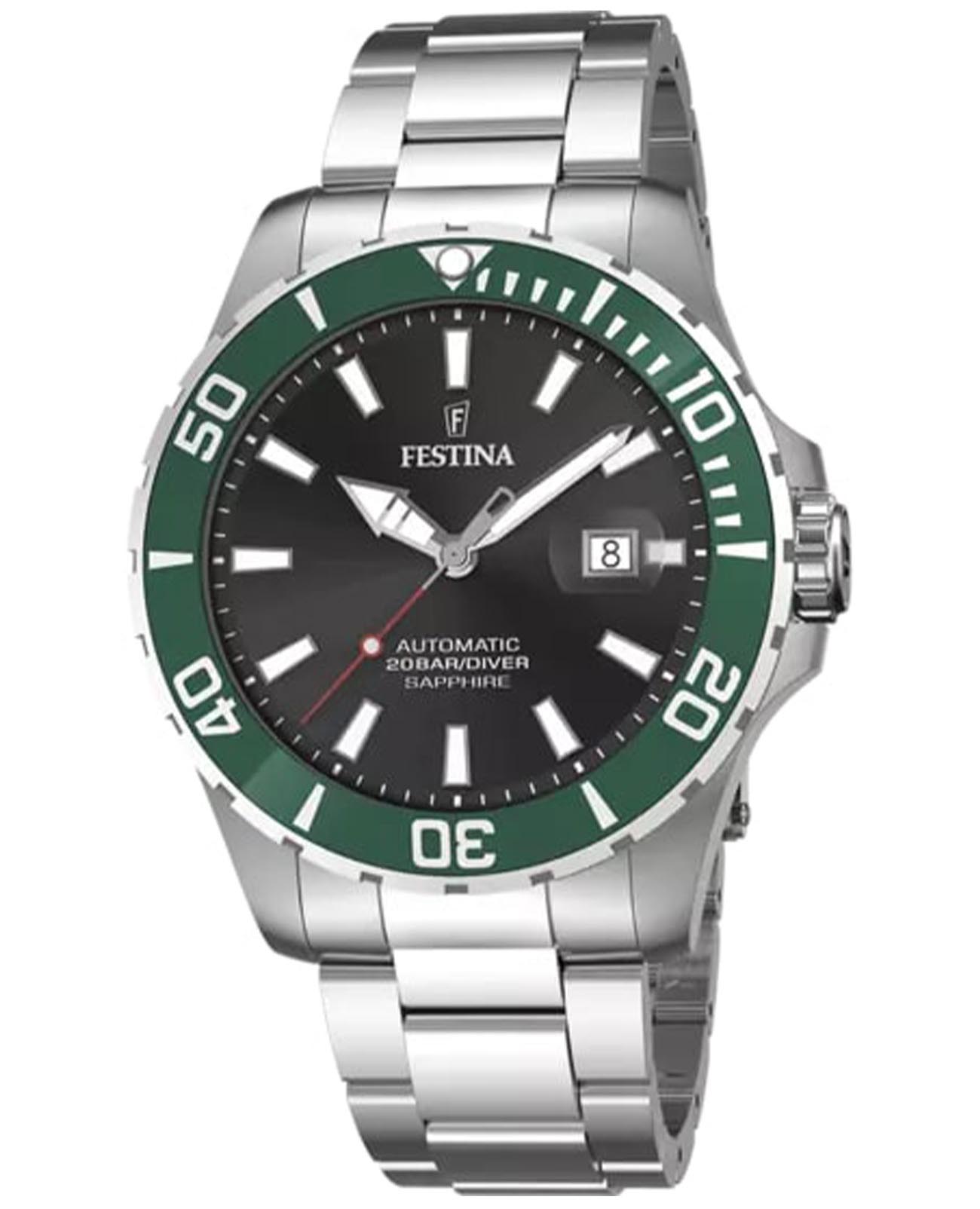 Мужские механические часы Festina Automatic F20531/2 — идеальный выбор для ценителей классики и современных технологий. Оснащены надежным механическим автоматическим калибром с высокой точностью, который не требует батарейки и подзаводится от движения вашей руки. Прочное сапфировое стеклоСапфировое стеклоПрочный и надёжный материал из кристалла сапфира синтетического происхождения, характеризующийся особой твёрдостью и устойчивостью к царапинам и повреждениям. гарантирует защиту от царапин и обладает отличной прозрачностью, благодаря чему циферблат всегда остается четким и легко читаемым. Водозащита 200 метров позволяет не только плавать, но и нырять, заниматься водными видами спорта, не опасаясь за сохранность часов. Корпус выполнен из стойкой к коррозии стали, а стальной браслет на раскладной застёжкеРаскладная застёжкаТакой тип застёжки используется только на браслетах из металла. Она никогда не раскрывается полностью, происходит разделение на 2 и более частей. Раскладывающая застёжка снизит вероятность потери часов к минимуму. обеспечивает удобную посадку на запястье. Окошко даты расположено в позиции «3 часа» и дополнено увеличительным стеклом для лучшей читаемости. Стрелки и метки с люминесцентным покрытиемЛюминесцентное покрытиеПозволяет считывать показания времени в темноте. Производители наносят на стрелки, часовые индексы, безель или поверхность циферблата светонакопительный состав, дающий холодное свечение., которое светится в темноте после небольшой зарядки на свету. Рифленая заводная головка облегчает подзавод. БезельБезельВнешний ободок, закрепляющий стекло. В спортивных часах так называется поворотное кольцо с делениями на циферблате, выполняет роль таймера – замеряет отрезки времени на шкале. Неподвижный безель – элемент декора. Однонаправленно вращающийся безель на дайверских часах позволяет фиксировать моменты погружения и выныривания на поверхность. с PVD-покрытиемPVDУльтратонкое покрытие наносится в технике вакуумного напыления, сочетает в себе нитрид титана особой прочности со слоем золота или оксида хрома. Несёт в себе декоративную или защитную функцию. придает часам особую износостойкость и стильный вид.