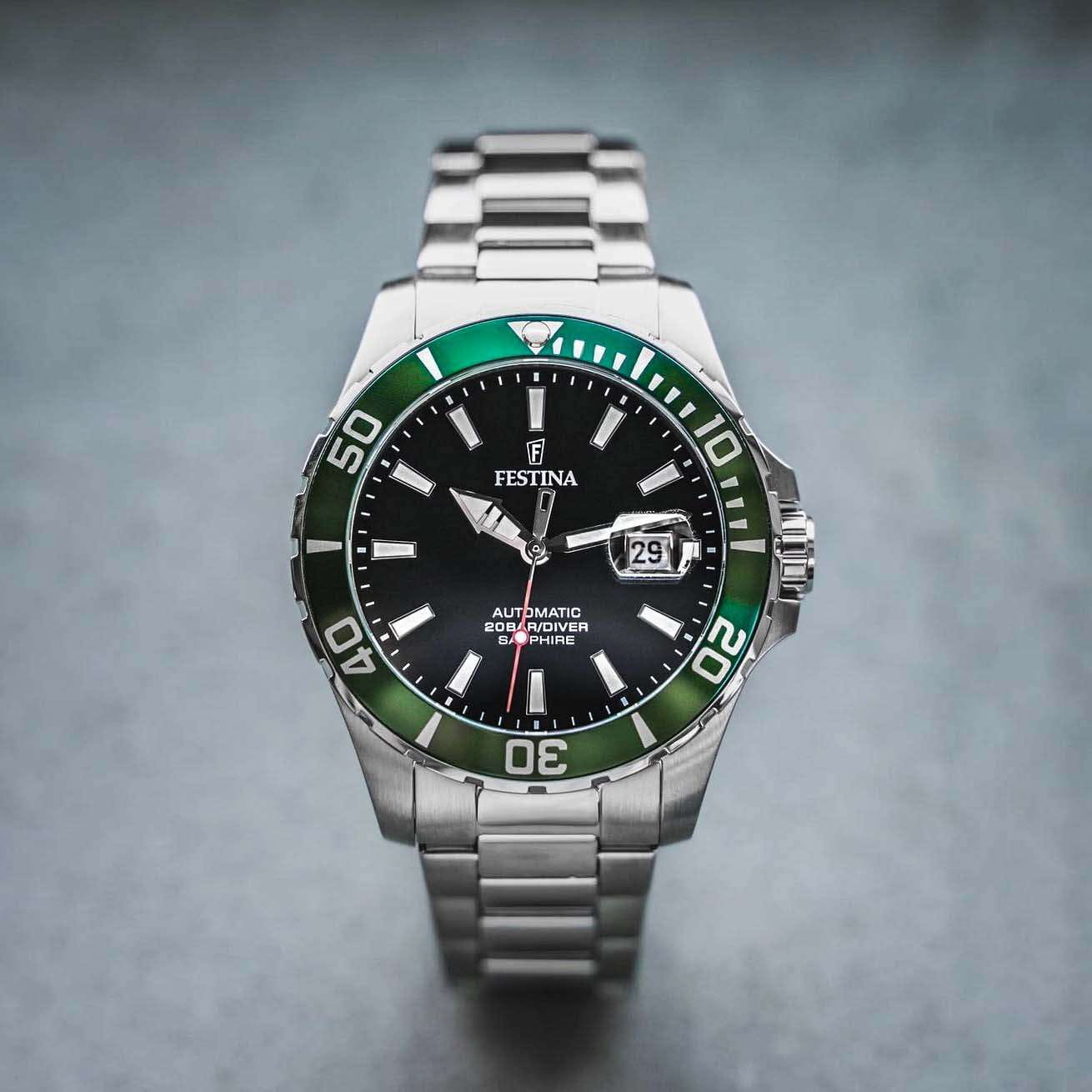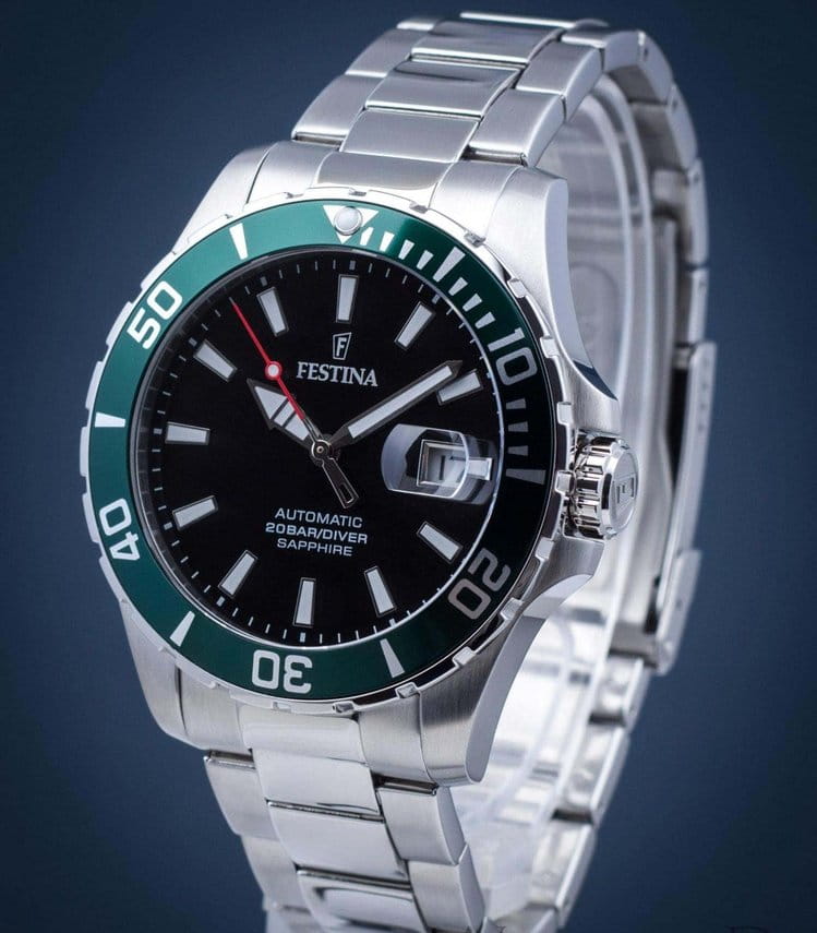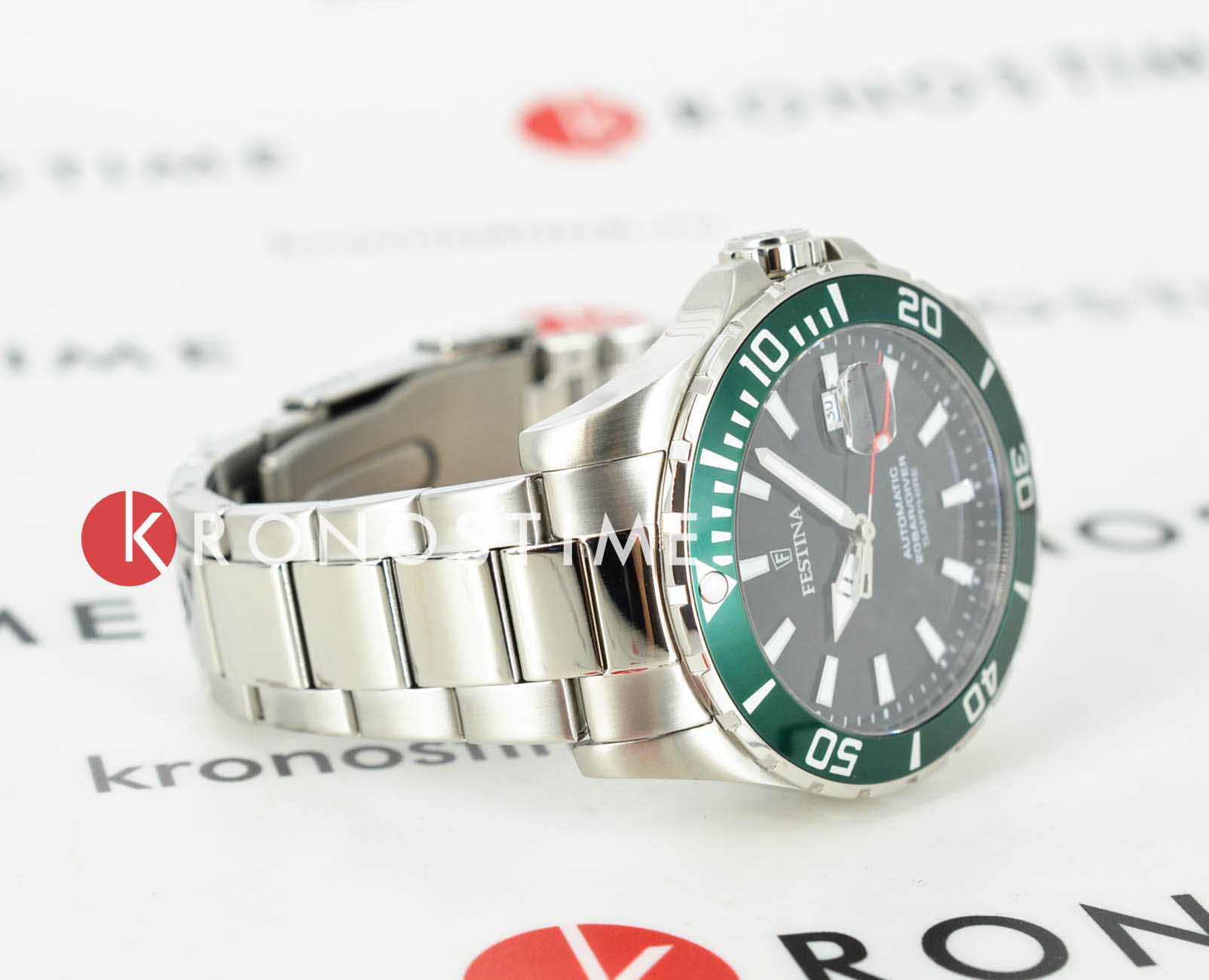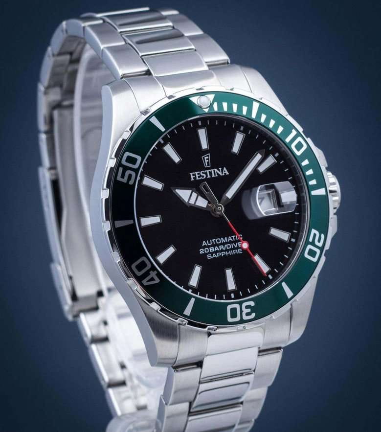 Мужские механические часы Festina Automatic F20531/2 — идеальный выбор для ценителей классики и современных технологий. Оснащены надежным механическим автоматическим калибром с высокой точностью, который не требует батарейки и подзаводится от движения вашей руки. Прочное сапфировое стеклоСапфировое стеклоПрочный и надёжный материал из кристалла сапфира синтетического происхождения, характеризующийся особой твёрдостью и устойчивостью к царапинам и повреждениям. гарантирует защиту от царапин и обладает отличной прозрачностью, благодаря чему циферблат всегда остается четким и легко читаемым. Водозащита 200 метров позволяет не только плавать, но и нырять, заниматься водными видами спорта, не опасаясь за сохранность часов. Корпус выполнен из стойкой к коррозии стали, а стальной браслет на раскладной застёжкеРаскладная застёжкаТакой тип застёжки используется только на браслетах из металла. Она никогда не раскрывается полностью, происходит разделение на 2 и более частей. Раскладывающая застёжка снизит вероятность потери часов к минимуму. обеспечивает удобную посадку на запястье. Окошко даты расположено в позиции «3 часа» и дополнено увеличительным стеклом для лучшей читаемости. Стрелки и метки с люминесцентным покрытиемЛюминесцентное покрытиеПозволяет считывать показания времени в темноте. Производители наносят на стрелки, часовые индексы, безель или поверхность циферблата светонакопительный состав, дающий холодное свечение., которое светится в темноте после небольшой зарядки на свету. Рифленая заводная головка облегчает подзавод. БезельБезельВнешний ободок, закрепляющий стекло. В спортивных часах так называется поворотное кольцо с делениями на циферблате, выполняет роль таймера – замеряет отрезки времени на шкале. Неподвижный безель – элемент декора. Однонаправленно вращающийся безель на дайверских часах позволяет фиксировать моменты погружения и выныривания на поверхность. с PVD-покрытиемPVDУльтратонкое покрытие наносится в технике вакуумного напыления, сочетает в себе нитрид титана особой прочности со слоем золота или оксида хрома. Несёт в себе декоративную или защитную функцию. придает часам особую износостойкость и стильный вид.