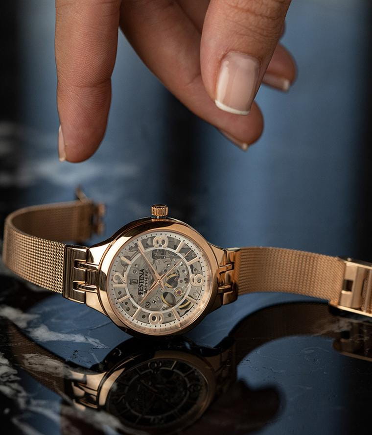 Женские механические часы-скелетоны Festina Automatic F20580/1, механический механизм (автоматический калибр) с высокой точностью. Сапфировое стеклоСапфировое стеклоПрочный и надёжный материал из кристалла сапфира синтетического происхождения, характеризующийся особой твёрдостью и устойчивостью к царапинам и повреждениям. устойчивое к появлению царапин, обладающее высокой прозрачностью. Класс водозащиты: 50 метров, позволит защитить корпус от случайных брызг или капель дождя. Корпус часов изготовлен из стали с PVD-покрытиемPVDУльтратонкое покрытие наносится в технике вакуумного напыления, сочетает в себе нитрид титана особой прочности со слоем золота или оксида хрома. Несёт в себе декоративную или защитную функцию.. Стальной миланского плетения браслет на раскладной застёжкеРаскладная застёжкаТакой тип застёжки используется только на браслетах из металла. Она никогда не раскрывается полностью, происходит разделение на 2 и более частей. Раскладывающая застёжка снизит вероятность потери часов к минимуму. с PVD-покрытиемPVDУльтратонкое покрытие наносится в технике вакуумного напыления, сочетает в себе нитрид титана особой прочности со слоем золота или оксида хрома. Несёт в себе декоративную или защитную функцию.. БезельБезельВнешний ободок, закрепляющий стекло. В спортивных часах так называется поворотное кольцо с делениями на циферблате, выполняет роль таймера – замеряет отрезки времени на шкале. Неподвижный безель – элемент декора. Однонаправленно вращающийся безель на дайверских часах позволяет фиксировать моменты погружения и выныривания на поверхность. с PVD-покрытиемPVDУльтратонкое покрытие наносится в технике вакуумного напыления, сочетает в себе нитрид титана особой прочности со слоем золота или оксида хрома. Несёт в себе декоративную или защитную функцию.. Циферблат с метками в виде штрихов и арабских цифр. Рифленая заводная головка.