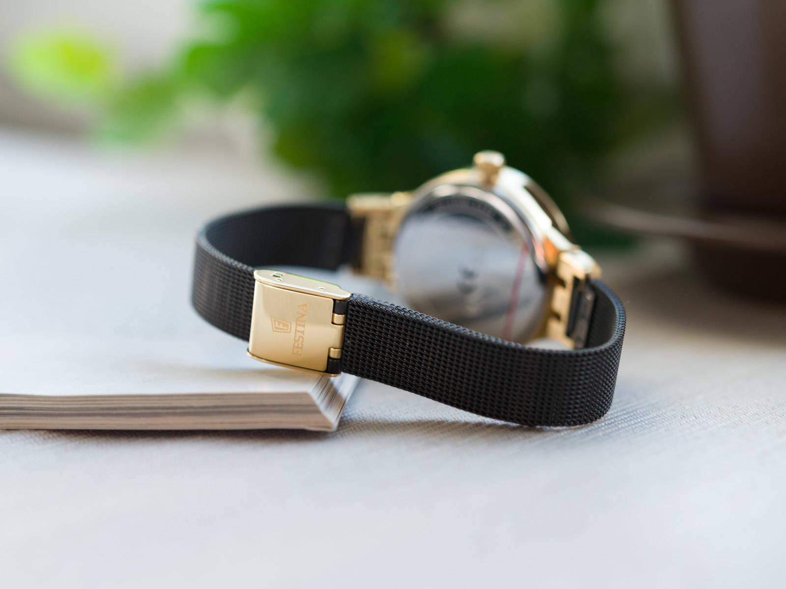 Женские механические часы-скелетоны Festina Automatic F20580/2, механический механизм (автоматический калибр) с высокой точностью. Сапфировое стеклоСапфировое стеклоПрочный и надёжный материал из кристалла сапфира синтетического происхождения, характеризующийся особой твёрдостью и устойчивостью к царапинам и повреждениям. устойчивое к появлению царапин, обладающее высокой прозрачностью. Класс водозащиты: 50 метров, позволит защитить корпус от случайных брызг или капель дождя. Корпус часов изготовлен из стали с PVD-покрытиемPVDУльтратонкое покрытие наносится в технике вакуумного напыления, сочетает в себе нитрид титана особой прочности со слоем золота или оксида хрома. Несёт в себе декоративную или защитную функцию.. Стальной миланского плетения браслет на раскладной застёжкеРаскладная застёжкаТакой тип застёжки используется только на браслетах из металла. Она никогда не раскрывается полностью, происходит разделение на 2 и более частей. Раскладывающая застёжка снизит вероятность потери часов к минимуму. с PVD-покрытиемPVDУльтратонкое покрытие наносится в технике вакуумного напыления, сочетает в себе нитрид титана особой прочности со слоем золота или оксида хрома. Несёт в себе декоративную или защитную функцию.. БезельБезельВнешний ободок, закрепляющий стекло. В спортивных часах так называется поворотное кольцо с делениями на циферблате, выполняет роль таймера – замеряет отрезки времени на шкале. Неподвижный безель – элемент декора. Однонаправленно вращающийся безель на дайверских часах позволяет фиксировать моменты погружения и выныривания на поверхность. с PVD-покрытиемPVDУльтратонкое покрытие наносится в технике вакуумного напыления, сочетает в себе нитрид титана особой прочности со слоем золота или оксида хрома. Несёт в себе декоративную или защитную функцию.. Циферблат с метками в виде штрихов и арабских цифр. Рифленая заводная головка.