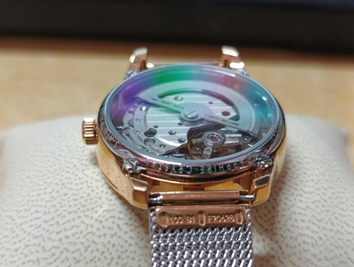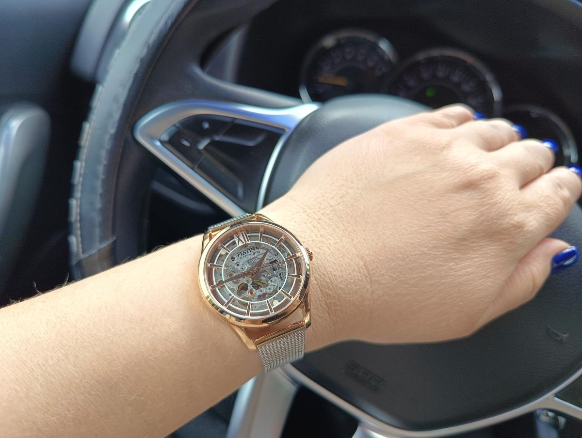 Женские механические часы-скелетоны Festina Automatic F20628/1, механический механизм (автоматический калибр) с высокой точностью. Сапфировое стеклоСапфировое стеклоПрочный и надёжный материал из кристалла сапфира синтетического происхождения, характеризующийся особой твёрдостью и устойчивостью к царапинам и повреждениям. устойчивое к появлению царапин, обладающее высокой прозрачностью. Класс водозащиты: 30 метров, позволит защитить корпус от случайных брызг или капель дождя. Корпус часов изготовлен из стали с PVD-покрытиемPVDУльтратонкое покрытие наносится в технике вакуумного напыления, сочетает в себе нитрид титана особой прочности со слоем золота или оксида хрома. Несёт в себе декоративную или защитную функцию.. Стальной браслет на раскладной застёжкеРаскладная застёжкаТакой тип застёжки используется только на браслетах из металла. Она никогда не раскрывается полностью, происходит разделение на 2 и более частей. Раскладывающая застёжка снизит вероятность потери часов к минимуму.. Циферблат с метками в виде штрихов и римской цифры 12. Рифленая заводная головка.