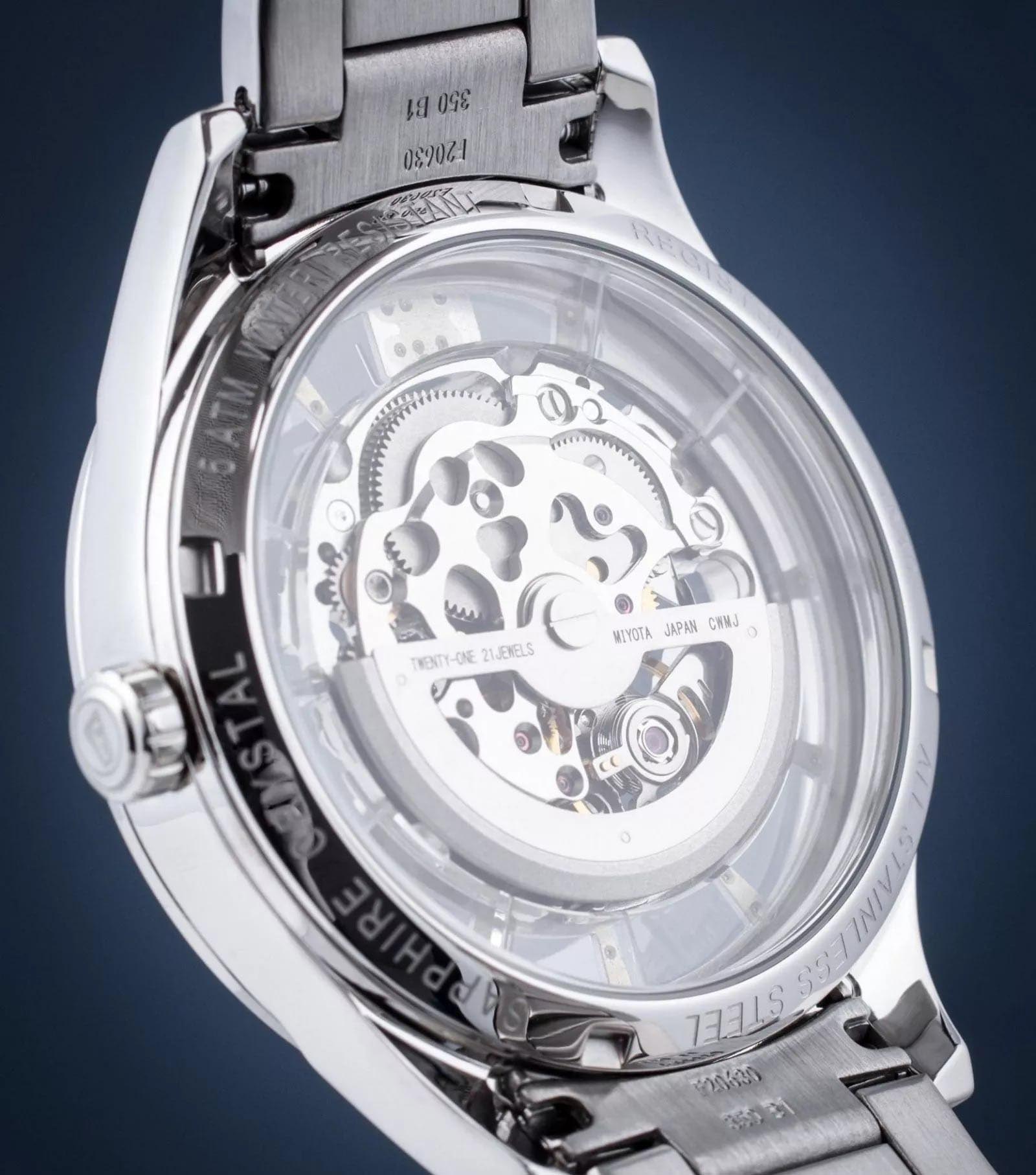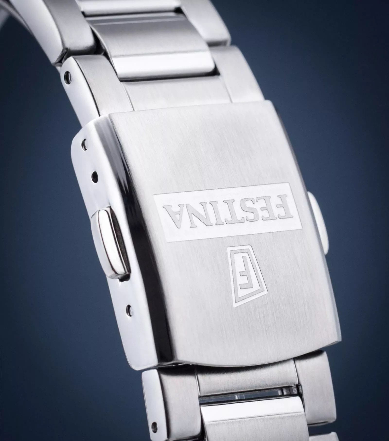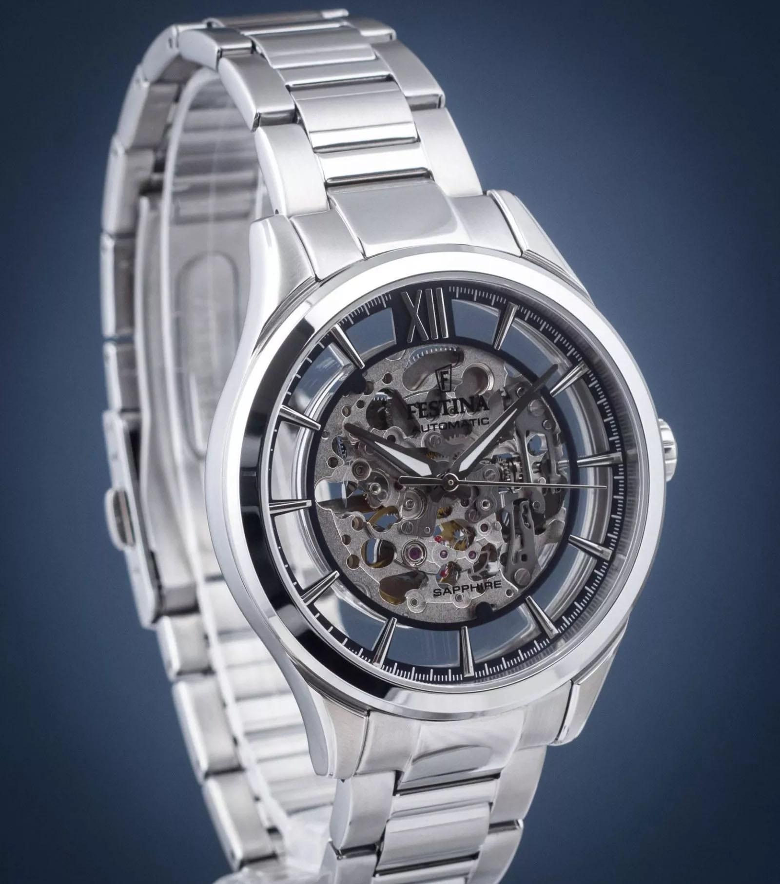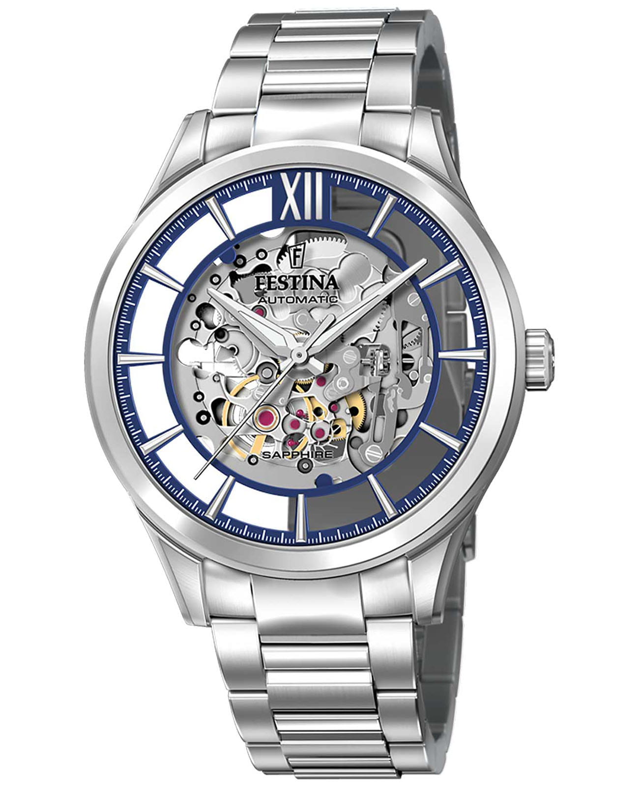 Мужские механические часы-скелетоны Festina Automatic F20630/3, механический механизм (автоматический калибр) с высокой точностью. Сапфировое стеклоСапфировое стеклоПрочный и надёжный материал из кристалла сапфира синтетического происхождения, характеризующийся особой твёрдостью и устойчивостью к царапинам и повреждениям. устойчивое к появлению царапин, обладающее высокой прозрачностью. Класс водозащиты: 50 метров, позволит защитить корпус от случайных брызг или капель дождя. Корпус часов изготовлен из стали. Стальной браслет на раскладной застёжкеРаскладная застёжкаТакой тип застёжки используется только на браслетах из металла. Она никогда не раскрывается полностью, происходит разделение на 2 и более частей. Раскладывающая застёжка снизит вероятность потери часов к минимуму.. Циферблат с метками в виде штрихов и римской цифры 12. Рифленая заводная головка. Стрелки и метки с люминесцентным покрытиемЛюминесцентное покрытиеПозволяет считывать показания времени в темноте. Производители наносят на стрелки, часовые индексы, безель или поверхность циферблата светонакопительный состав, дающий холодное свечение..