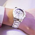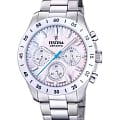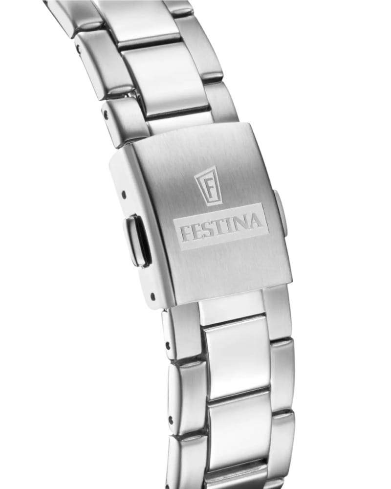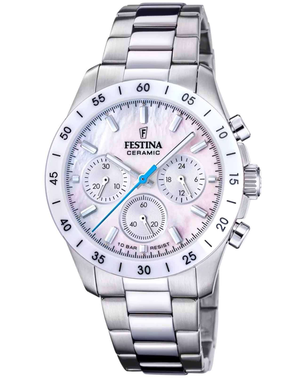 Часы Festina Ceramic Chrono F20693/1 — элегантная модель хронографаХронографФункция позволяет измерять отрезки времени с особой точностью: часы, минуты, секунды. Верным признаком хронографа является наличие на циферблате 3 дополнительных окошек-счётчиков. с секундомеромСекундомерСекундоме́р — прибор, способный измерять интервалы времени с точностью до долей секунды., сочетающая стиль и функциональность. Корпус диаметром 39 мм выполнен из нержавеющей стали с керамическим безелемБезельВнешний ободок, закрепляющий стекло. В спортивных часах так называется поворотное кольцо с делениями на циферблате, выполняет роль таймера – замеряет отрезки времени на шкале. Неподвижный безель – элемент декора. Однонаправленно вращающийся безель на дайверских часах позволяет фиксировать моменты погружения и выныривания на поверхность. белого цвета. Перламутровый белый циферблат с хронографическими субциферблатами и индикатором даты защищён минеральным стекломМинеральное стеклоМинеральное стекло представляет собой искусственно выращенный минерал кварца. Такое стекло отличается особой устойчивостью к повреждениям и царапинам. Уступает по некоторым качествам сапфировому стеклу.. Модель оснащена кварцевым механизмом, обеспечивающим высокую точность хода. Водозащита до 100 метров позволяет использовать часы для плавания и сноркелинга. Браслет из нержавеющей стали с раскладной застёжкойРаскладная застёжкаТакой тип застёжки используется только на браслетах из металла. Она никогда не раскрывается полностью, происходит разделение на 2 и более частей. Раскладывающая застёжка снизит вероятность потери часов к минимуму. обеспечивает надёжную фиксацию и комфортное ношение. Стрелки и метки с люминесцентным покрытиемЛюминесцентное покрытиеПозволяет считывать показания времени в темноте. Производители наносят на стрелки, часовые индексы, безель или поверхность циферблата светонакопительный состав, дающий холодное свечение. обеспечивают удобное считывание времени в темноте после кратковременного пребывания на свету, что делает эти часы практичными в любых условиях. Эти часы подчёркивают изысканный вкус своей обладательницы, идеально подходя для повседневного ношения и особых случаев.