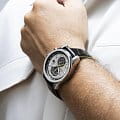 Кварцевый механизм с высокой точностью c хронографомХронографФункция позволяет измерять отрезки времени с особой точностью: часы, минуты, секунды. Верным признаком хронографа является наличие на циферблате 3 дополнительных окошек-счётчиков.. Минеральное стеклоМинеральное стеклоМинеральное стекло представляет собой искусственно выращенный минерал кварца. Такое стекло отличается особой устойчивостью к повреждениям и царапинам. Уступает по некоторым качествам сапфировому стеклу. устойчивое к появлению царапин, обладающее высокой прозрачностью. Класс водозащиты: 100 метров, позволит плавать, нырять и заниматься другими водными видами спорта. Корпус часов изготовлен из нержавеющей стали. Кожаный ремешок на стандартной застежке. БезельБезельВнешний ободок, закрепляющий стекло. В спортивных часах так называется поворотное кольцо с делениями на циферблате, выполняет роль таймера – замеряет отрезки времени на шкале. Неподвижный безель – элемент декора. Однонаправленно вращающийся безель на дайверских часах позволяет фиксировать моменты погружения и выныривания на поверхность. с PVD-покрытиемPVDУльтратонкое покрытие наносится в технике вакуумного напыления, сочетает в себе нитрид титана особой прочности со слоем золота или оксида хрома. Несёт в себе декоративную или защитную функцию.. Стрелки и метки с люминесцентным покрытиемЛюминесцентное покрытиеПозволяет считывать показания времени в темноте. Производители наносят на стрелки, часовые индексы, безель или поверхность циферблата светонакопительный состав, дающий холодное свечение..