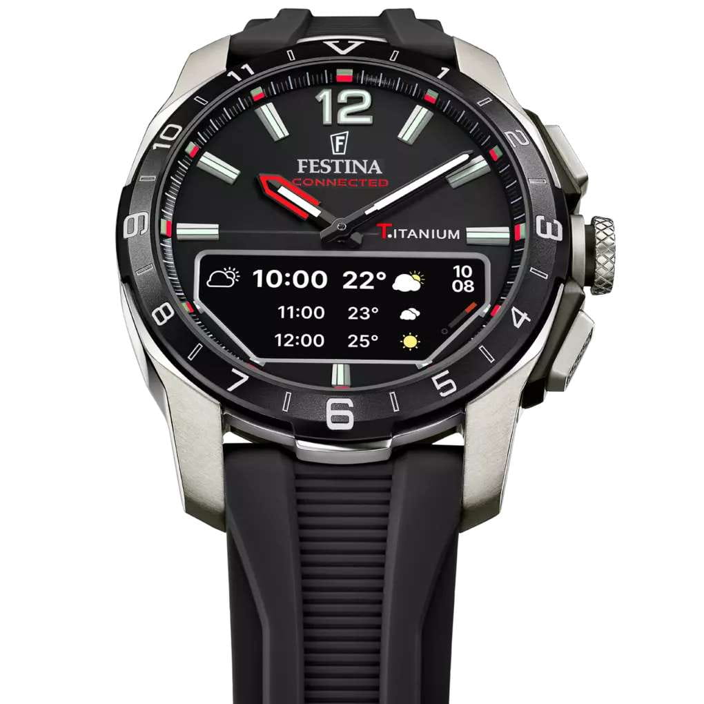 Мужские гибридные умные часы Festina Connected D — это современный аксессуар, сочетающий классический аналоговый дизайн и передовые технологии. Корпус диаметром 44 мм выполнен из лёгкого титана. БезельБезельВнешний ободок, закрепляющий стекло. В спортивных часах так называется поворотное кольцо с делениями на циферблате, выполняет роль таймера – замеряет отрезки времени на шкале. Неподвижный безель – элемент декора. Однонаправленно вращающийся безель на дайверских часах позволяет фиксировать моменты погружения и выныривания на поверхность. с IP-покрытиемIP-покрытиеМетод ионного напыления. Демонстрирует повышенную устойчивость к истиранию, окислению и химическим веществам. Под воздействием высокого давления и температуры около 1500°C молекулы металла надёжно соединяются с частицами корпуса часов.. Циферблат чёрного цвета оформлен штрихами и стрелками. В центре циферблата расположен небольшой OLED-дисплей для отображения цифровой информации. Циферблат защищён сапфировым стекломСапфировое стеклоПрочный и надёжный материал из кристалла сапфира синтетического происхождения, характеризующийся особой твёрдостью и устойчивостью к царапинам и повреждениям.. Часы оснащены функциями BluetoothBluetoothСовременная технология, позволяющая синхронизировать часы с телефоном и переносить данные. Часы с Bluetooth расширяют возможности вашего смартфона и делают его использование ещё более удобным., мирового времениМировое время Полезное часовое усложнение, отображающее время в основных городах и известных областях по всему миру, оно связано с часовыми поясами, удобно для путешественников и бизнесменов. , будильника, таймера обратного отсчёта, секундомера, а также уведомлений о звонках, сообщениях и напоминаниях. Стрелки и метки с люминесцентным покрытиемЛюминесцентное покрытиеПозволяет считывать показания времени в темноте. Производители наносят на стрелки, часовые индексы, безель или поверхность циферблата светонакопительный состав, дающий холодное свечение. обеспечивают читаемость в темноте. Часы оснащены силиконовым ремешком чёрного цвета на стандартной пряжке. Водонепроницаемость 30 м позволяет использовать часы в повседневных условиях. Идеальный выбор для тех, кто ценит стиль, точность и интеллектуальные функции.