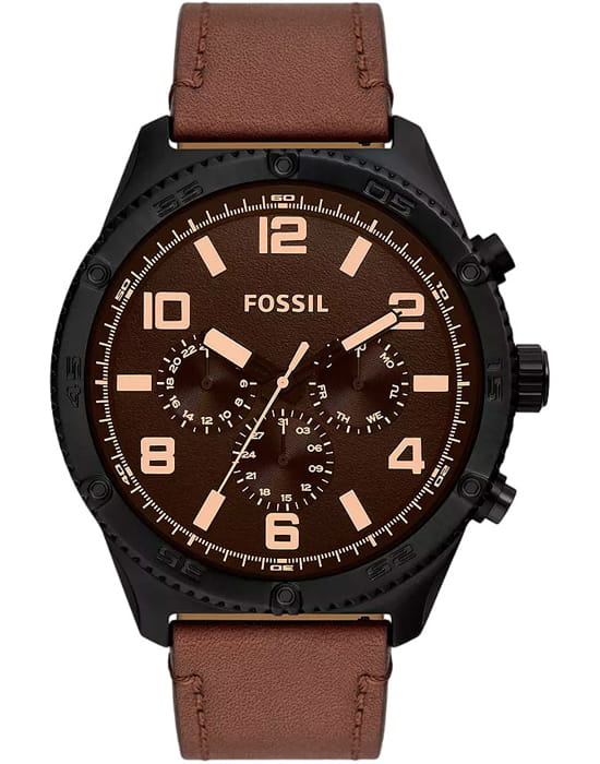 Часы Fossil BQ2802, кварцевый механизм с высокой точностью. Минеральное стеклоМинеральное стеклоМинеральное стекло представляет собой искусственно выращенный минерал кварца. Такое стекло отличается особой устойчивостью к повреждениям и царапинам. Уступает по некоторым качествам сапфировому стеклу. устойчивое к мелким механическим повреждениям. Класс водозащиты: 50 метров, позволит защитить корпус от случайных брызг или капель дождя. Корпус часов изготовлен из стали с IP-покрытиемIP-покрытиеМетод ионного напыления. Демонстрирует повышенную устойчивость к истиранию, окислению и химическим веществам. Под воздействием высокого давления и температуры около 1500°C молекулы металла надёжно соединяются с частицами корпуса часов.. Стрелки и метки с люминесцентным покрытиемЛюминесцентное покрытиеПозволяет считывать показания времени в темноте. Производители наносят на стрелки, часовые индексы, безель или поверхность циферблата светонакопительный состав, дающий холодное свечение.. Функции даты, дня недели и 24 часового формата времени вынесены на отдельные циферблаты. Кожаный ремешок на стандартной застёжке.