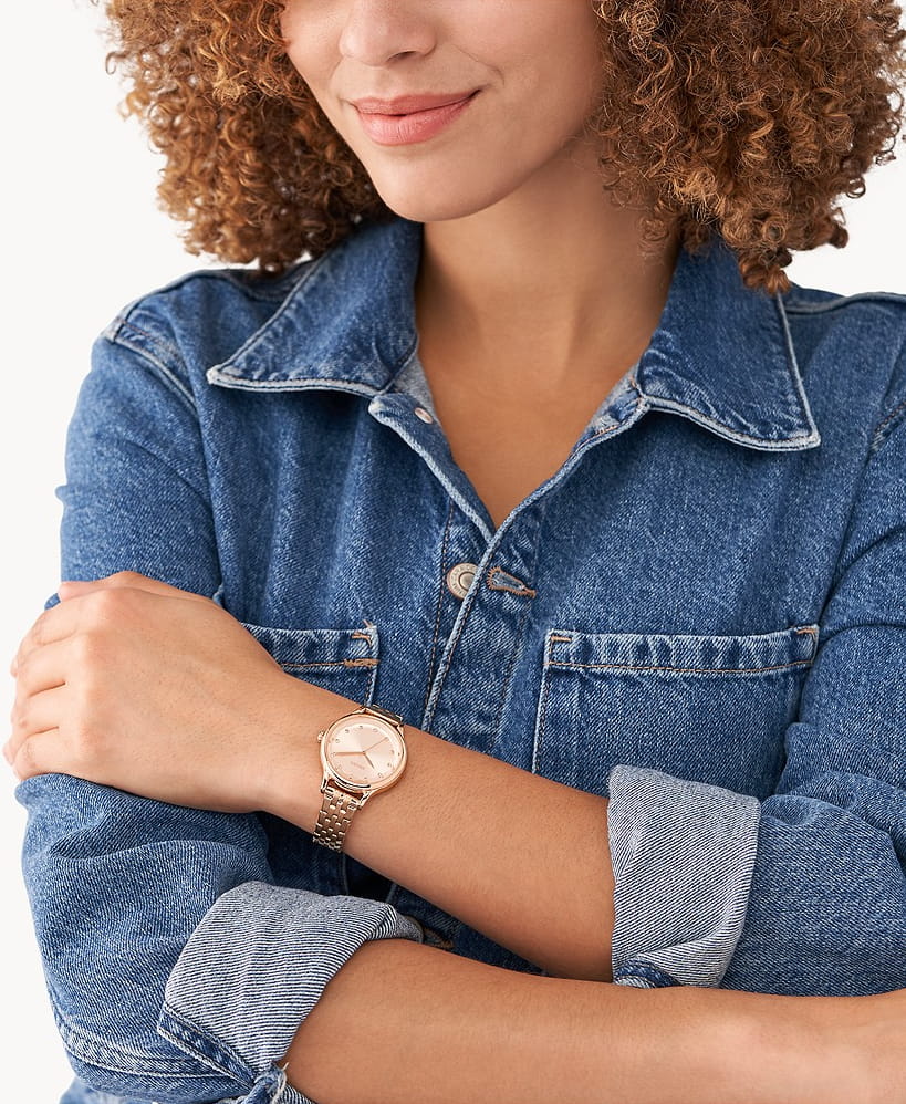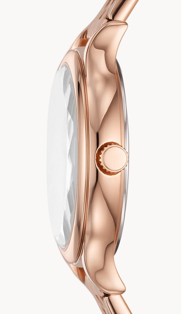 Женские наручные часы с минеральным стекломМинеральное стеклоМинеральное стекло представляет собой искусственно выращенный минерал кварца. Такое стекло отличается особой устойчивостью к повреждениям и царапинам. Уступает по некоторым качествам сапфировому стеклу. Fossil Laney BQ3862, кварцевый механизм с высокой точностью. Класс водозащиты: 50 метров, позволит защитить корпус от случайных брызг или капель дождя. БезельБезельВнешний ободок, закрепляющий стекло. В спортивных часах так называется поворотное кольцо с делениями на циферблате, выполняет роль таймера – замеряет отрезки времени на шкале. Неподвижный безель – элемент декора. Однонаправленно вращающийся безель на дайверских часах позволяет фиксировать моменты погружения и выныривания на поверхность. и браслет часов изготовлен из стали IP-покрытиемIP-покрытиеМетод ионного напыления. Демонстрирует повышенную устойчивость к истиранию, окислению и химическим веществам. Под воздействием высокого давления и температуры около 1500°C молекулы металла надёжно соединяются с частицами корпуса часов.. Метки в виде кристаллов. Рифленая заводная головка. Корпус из стали с IP-покрытиемIP-покрытиеМетод ионного напыления. Демонстрирует повышенную устойчивость к истиранию, окислению и химическим веществам. Под воздействием высокого давления и температуры около 1500°C молекулы металла надёжно соединяются с частицами корпуса часов.. Браслет с раскладной застёжкойРаскладная застёжкаТакой тип застёжки используется только на браслетах из металла. Она никогда не раскрывается полностью, происходит разделение на 2 и более частей. Раскладывающая застёжка снизит вероятность потери часов к минимуму..