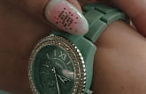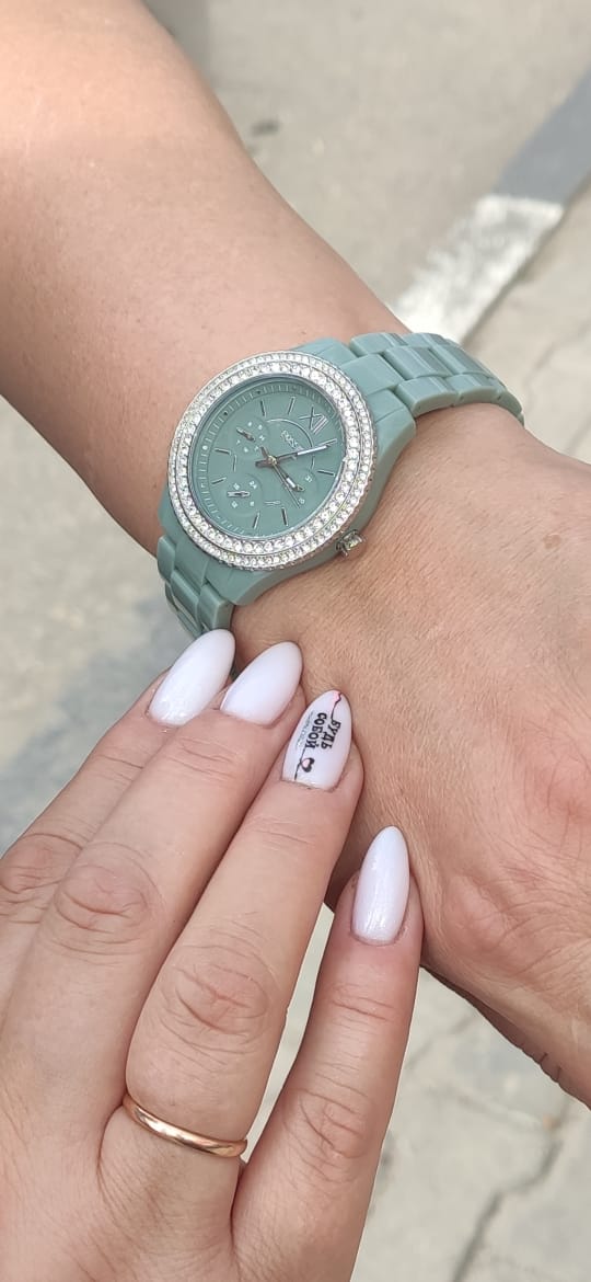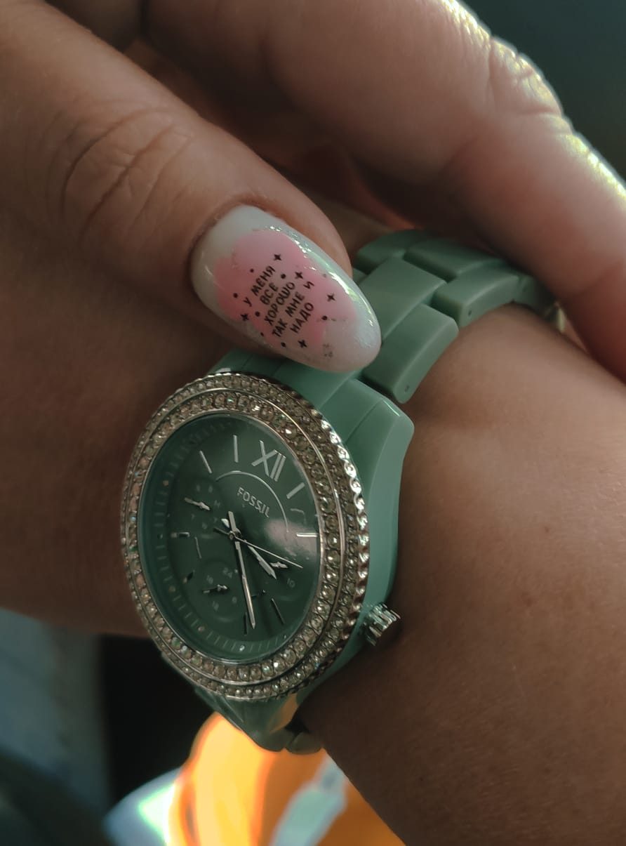 Модель элегантная ,приятного мятного цвета,  безель украшен кристаллами. Стрелки светятся в темноте. Дата и день недели отображаются на отдельных циферблатах. Часы шли в брендовой коробке, гарантийный талон был вложен. Доставили быстро.
