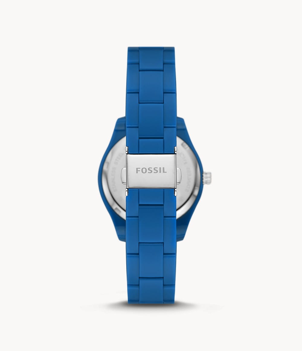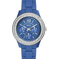 Женские американские часы с паве из кристаллов Fossil Stella ES5193, кварцевый механизм с высокой точностью. Класс водозащиты: 50 метров, позволит защитить корпус от случайных брызг или капель дождя. Круглый корпус часов изготовлен из пластика синего цвета. БезельБезельВнешний ободок, закрепляющий стекло. В спортивных часах так называется поворотное кольцо с делениями на циферблате, выполняет роль таймера – замеряет отрезки времени на шкале. Неподвижный безель – элемент декора. Однонаправленно вращающийся безель на дайверских часах позволяет фиксировать моменты погружения и выныривания на поверхность. украшен паве из кристаллов. Метки в виде штрихов, 12-ти часовая метка в виде римской цифры. 24 индикация, дата и день недели вынесены на малые циферблаты. Рифленая заводная головка. Браслет пластиковый синего цвета.