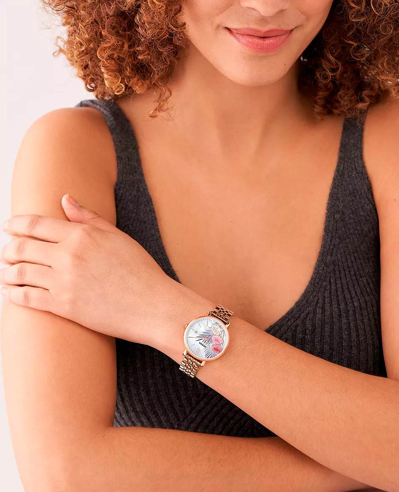 Женские американские часы с минеральным стекломМинеральное стеклоМинеральное стекло представляет собой искусственно выращенный минерал кварца. Такое стекло отличается особой устойчивостью к повреждениям и царапинам. Уступает по некоторым качествам сапфировому стеклу. Fossil Jacqueline ES5275, кварцевый механизм с высокой точностью. Корпус и браслет часов изготовлены из нержавеющей стали с IP-покрытиемIP-покрытиеМетод ионного напыления. Демонстрирует повышенную устойчивость к истиранию, окислению и химическим веществам. Под воздействием высокого давления и температуры около 1500°C молекулы металла надёжно соединяются с частицами корпуса часов.. Перламутровый циферблат украшен объемным изображением цветов. Метки в виде штрихов и римской цифры XII. Окошко даты находится в положении 3 часа. Рифленая заводная головка с защитой. Класс водозащиты: 30 метров, позволит защитить корпус от случайных брызг или капель дождя. Стальной браслет на раскладной застёжкеРаскладная застёжкаТакой тип застёжки используется только на браслетах из металла. Она никогда не раскрывается полностью, происходит разделение на 2 и более частей. Раскладывающая застёжка снизит вероятность потери часов к минимуму..