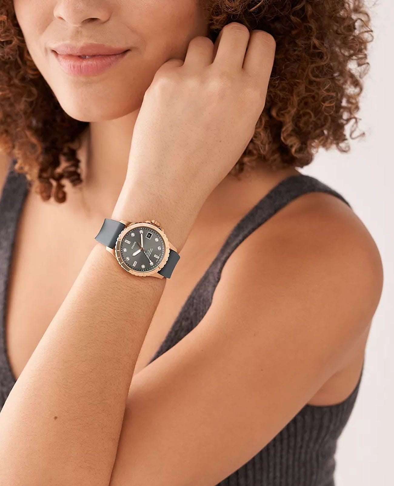 Женские американские часы с минеральным стекломМинеральное стеклоМинеральное стекло представляет собой искусственно выращенный минерал кварца. Такое стекло отличается особой устойчивостью к повреждениям и царапинам. Уступает по некоторым качествам сапфировому стеклу. Fossil Fossil FB-01 ES5293, кварцевый механизм с высокой точностью. Корпус часов изготовлен из нержавеющей стали. Метки в виде штрихов и точек с кристаллами. Окошко даты находится в положении 3 часа. Стрелки с люминесцентным покрытиемЛюминесцентное покрытиеПозволяет считывать показания времени в темноте. Производители наносят на стрелки, часовые индексы, безель или поверхность циферблата светонакопительный состав, дающий холодное свечение.. Рифленая заводная головка с защитой. Класс водозащиты: 100 метров, позволит плавать, нырять и заниматься другими водными видами спорта. Силиконовый ремешок на стандартной застежке.