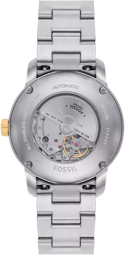 Наручные часы Fossil Heritage ME3230 с надёжным автоматическим механизмом. Корпус и браслет часов изготовлены из нержавеющей стали с частичным IP-покрытиемIP-покрытиеМетод ионного напыления. Демонстрирует повышенную устойчивость к истиранию, окислению и химическим веществам. Под воздействием высокого давления и температуры около 1500°C молекулы металла надёжно соединяются с частицами корпуса часов.. Минеральное стеклоМинеральное стеклоМинеральное стекло представляет собой искусственно выращенный минерал кварца. Такое стекло отличается особой устойчивостью к повреждениям и царапинам. Уступает по некоторым качествам сапфировому стеклу. устойчивое к мелким механическим повреждениям. Стальной браслет на раскладной застёжкеРаскладная застёжкаТакой тип застёжки используется только на браслетах из металла. Она никогда не раскрывается полностью, происходит разделение на 2 и более частей. Раскладывающая застёжка снизит вероятность потери часов к минимуму.. Класс водозащиты: 50 метров, позволит защитить корпус от случайных брызг или капель дождя. Стрелки и метки с люминесцентным покрытиемЛюминесцентное покрытиеПозволяет считывать показания времени в темноте. Производители наносят на стрелки, часовые индексы, безель или поверхность циферблата светонакопительный состав, дающий холодное свечение.. Окошко даты находится в положении 3 часа.