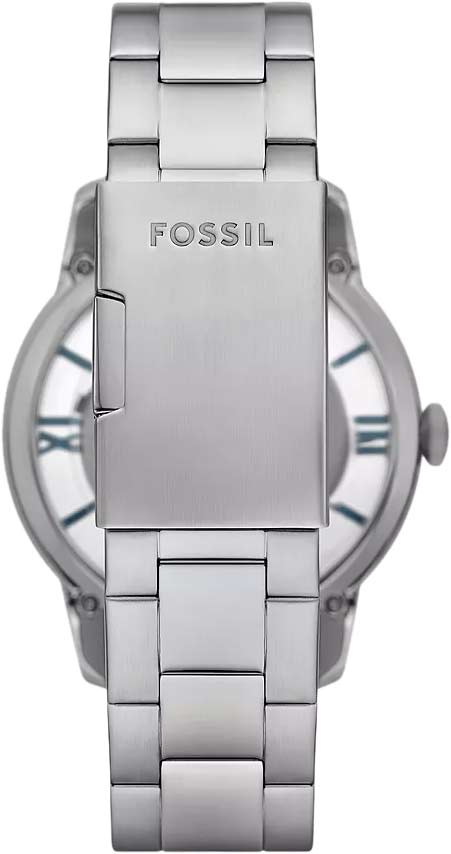 Мужские механические часы-скелетоны с минеральным стекломМинеральное стеклоМинеральное стекло представляет собой искусственно выращенный минерал кварца. Такое стекло отличается особой устойчивостью к повреждениям и царапинам. Уступает по некоторым качествам сапфировому стеклу. Fossil Townsman ME3260, механический механизм (автоматический калибр) с высокой точностью. Класс водозащиты: 50 метров, позволит защитить корпус от случайных брызг или капель дождя. Корпус часов изготовлен из стали с IP-покрытиемIP-покрытиеМетод ионного напыления. Демонстрирует повышенную устойчивость к истиранию, окислению и химическим веществам. Под воздействием высокого давления и температуры около 1500°C молекулы металла надёжно соединяются с частицами корпуса часов.. Метки выполнены в виде римских цифр. Рифленая заводная головка расположена с правой стороны корпуса. Циферблат в виде скелета с бронзовыми элементами. Стальной браслет на раскладной застёжкеРаскладная застёжкаТакой тип застёжки используется только на браслетах из металла. Она никогда не раскрывается полностью, происходит разделение на 2 и более частей. Раскладывающая застёжка снизит вероятность потери часов к минимуму..