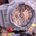 Серый корпус с матовой поверхностью отлично гармонирует с металлизированным циферблатом, представленным в цвете розового золота. Аксессуар станет подходящим вариантом для ежедневного ношения. Отдельно стоит выделить наличие противоударного корпусаУдаропрочный корпусМеханизм заключён в корпус, выполненный из современных материалов, устойчивых к ударам, механическим повреждениям и падению с высоты: инновационный пластик, карбон, нержавеющая сталь, титан. из полимерного пластика, который обеспечивает японский кварцевый механизм максимальной защитой. Батарейка обеспечивает механизм энергией на протяжении 3 лет. Циферблат подсвечивается ярким светодиодомСветодиодная подсветкаСветодиодная или LED-подсветка обеспечивает появление яркого холодного свечения за счёт LED-элементов - маленьких лампочек. Они потребляют минимальное количество энергии, чаще всего можно встретить 1 светодиод, в нижней части циферблата.. Минеральное стекло препятствует образованию царапин. Сохранение водостойкости конструкции при давлении до 20 бар. Устойчивость к негативному воздействию магнитных полей. Автоматический календарь до 2099 года, 5 ежедневных будильников, хронографХронографФункция позволяет измерять отрезки времени с особой точностью: часы, минуты, секунды. Верным признаком хронографа является наличие на циферблате 3 дополнительных окошек-счётчиков., секундомер с точностью в 1/100 секунды, мировое времяМировое время Полезное часовое усложнение, отображающее время в основных городах и известных областях по всему миру, оно связано с часовыми поясами, удобно для путешественников и бизнесменов. , таймер, UTCUTCВсемирное кординационное время, не имеющее привязки к географическому положению Гринвича, основывается на атомном отсчёте времени. Регулировка времени осуществляется более точно, чем устаревшее GMT.