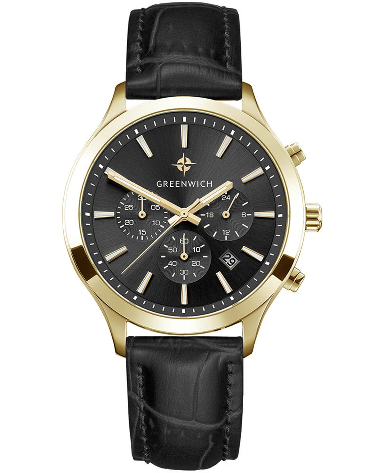 Мужские наручные часы-хронографХронографФункция позволяет измерять отрезки времени с особой точностью: часы, минуты, секунды. Верным признаком хронографа является наличие на циферблате 3 дополнительных окошек-счётчиков. Greenwich Skipper GW 043.21.31 представляют собой классический вариант для повседневной носки. Циферблат украшается брендовым логотипом, изображающим Розу Ветров. Эмблема мореплавательского духа символизирует удачу, стремление достигнуть поставленной цели. Часы характеризуются традиционными формами, лаконичным исполнением, что делает модель элегантным дополнением к деловому костюму. Надёжный корпус из нержавеющей стали с PVD-покрытиемPVDУльтратонкое покрытие наносится в технике вакуумного напыления, сочетает в себе нитрид титана особой прочности со слоем золота или оксида хрома. Несёт в себе декоративную или защитную функцию. спасает японский механизм от повреждений и ударов. Минеральное стеклоМинеральное стеклоМинеральное стекло представляет собой искусственно выращенный минерал кварца. Такое стекло отличается особой устойчивостью к повреждениям и царапинам. Уступает по некоторым качествам сапфировому стеклу. отличается устойчивостью к образованию царапин на поверхности. СекундомерСекундомерСекундоме́р — прибор, способный измерять интервалы времени с точностью до долей секунды.. Стрелки и метки с люминесцентным покрытиемЛюминесцентное покрытиеПозволяет считывать показания времени в темноте. Производители наносят на стрелки, часовые индексы, безель или поверхность циферблата светонакопительный состав, дающий холодное свечение.. Кожаный ремешок на стандартной застёжке. Окошко даты находится в положении между 4 и 5 часов. Класс водозащиты: 100 метров, позволит плавать, нырять и заниматься другими водными видами спорта.