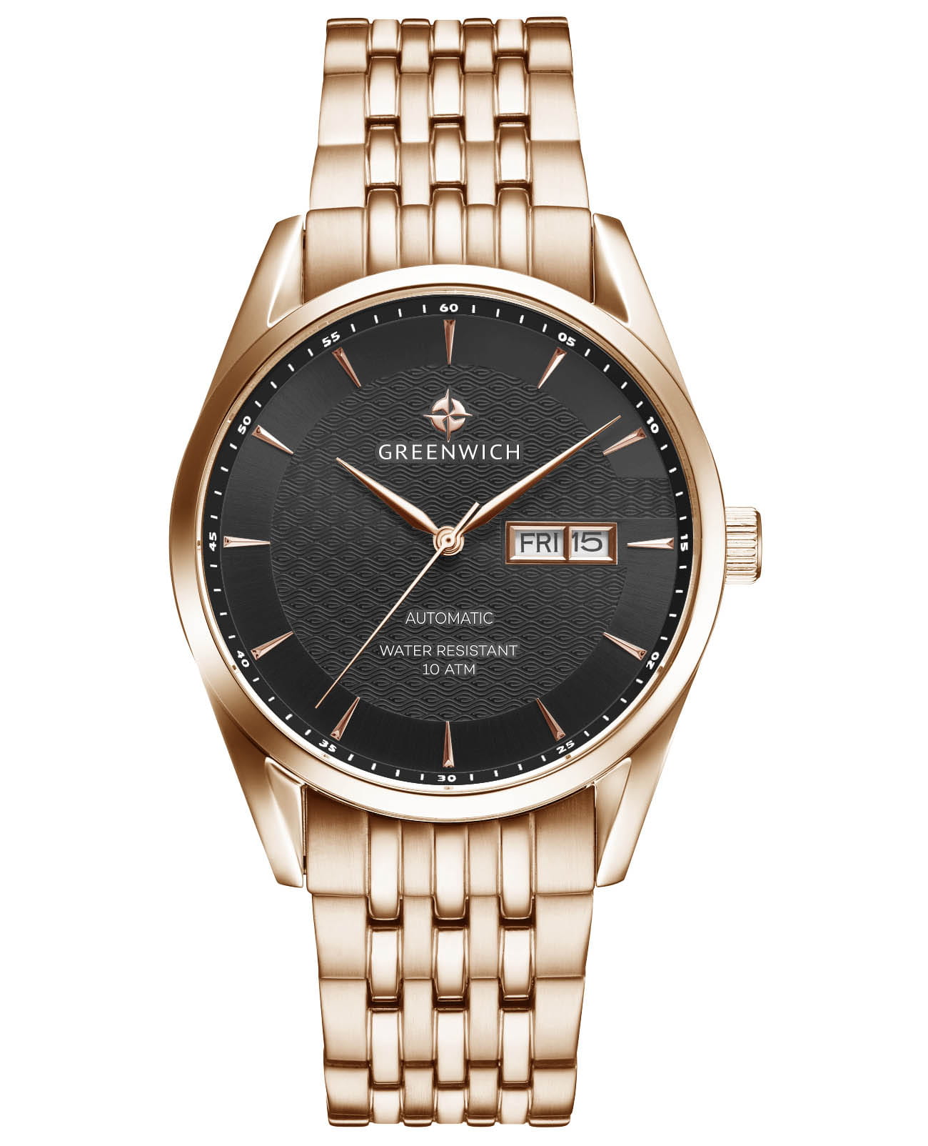 Мужские часы с минеральным стекломМинеральное стеклоМинеральное стекло представляет собой искусственно выращенный минерал кварца. Такое стекло отличается особой устойчивостью к повреждениям и царапинам. Уступает по некоторым качествам сапфировому стеклу. Greenwich Good Luck Classic GW 074.40.31, представляют собой классический вариант для повседневной носки. В центральной части циферблата — отличительная черта моделей этой серии: гильоше, объемные линии которого напоминают волны. Обратите внимание на форму пластины, где крепятся накладные риски: она сделана в форме латинской буквы G, первой буквы в названии бренда. Часы характеризуются традиционными формами, лаконичным исполнением, что делает модель элегантным дополнением к деловому костюму. Сквозь прозрачную заднюю крышку вы увидите детали механизма TMI с декорированным ротором: на нем выгравировано изображение символа английских моряков — парусника. Корпус, браслет и раскладная застёжкаРаскладная застёжкаТакой тип застёжки используется только на браслетах из металла. Она никогда не раскрывается полностью, происходит разделение на 2 и более частей. Раскладывающая застёжка снизит вероятность потери часов к минимуму. выполнены из гипоаллергенной нержавеющей стали с PVD-покрытиемPVDУльтратонкое покрытие наносится в технике вакуумного напыления, сочетает в себе нитрид титана особой прочности со слоем золота или оксида хрома. Несёт в себе декоративную или защитную функцию.. Дизайн, актуальный для любого современного образа, и надежность используемых материалов делают автоматические часы Greenwich удобным и стильным аксессуаром на каждый день. Окошко даты и дня недели находится в положении 3 часа. Класс водозащиты: 100 метров, позволит плавать, нырять и заниматься другими водными видами спорта.