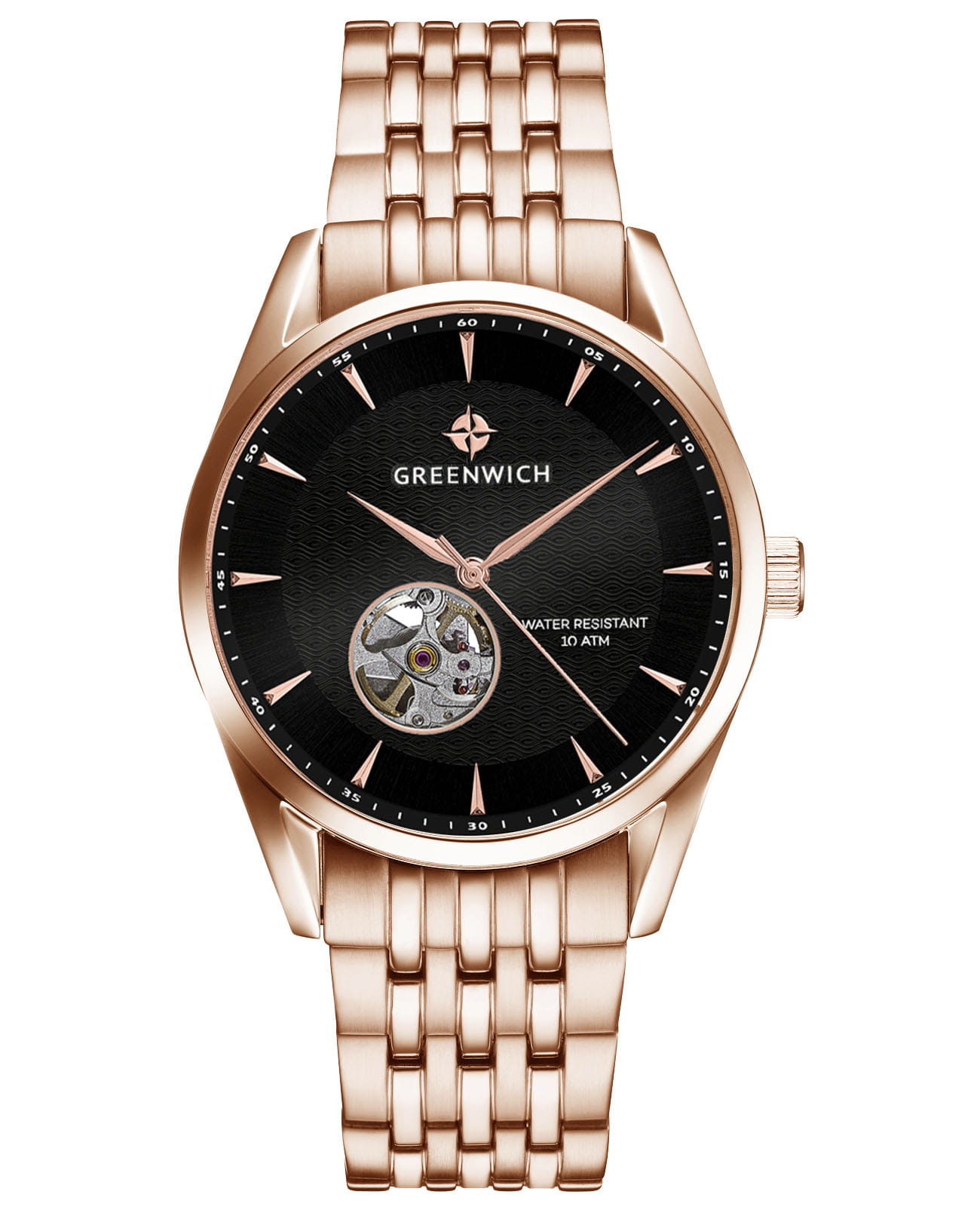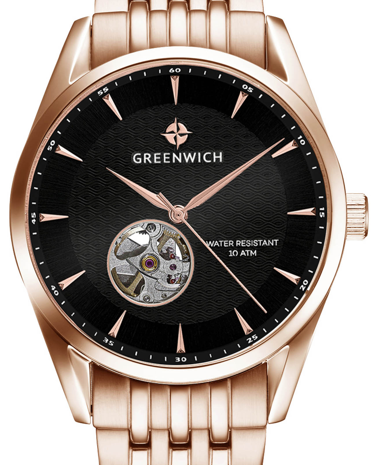 Водозащита до 10 ATM (100 метров) делает часы подходящими для плавания и других водных активностей. Литой браслет из нержавеющей стали с PVD-покрытиемPVDУльтратонкое покрытие наносится в технике вакуумного напыления, сочетает в себе нитрид титана особой прочности со слоем золота или оксида хрома. Несёт в себе декоративную или защитную функцию. розового золота оснащён застёжкой-клипсой с логотипом Greenwich, обеспечивающей комфортное ношение и надёжную фиксацию.