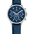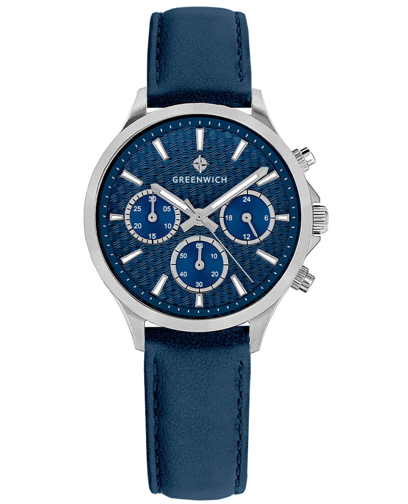 Женские кварцевые часы Greenwich из коллекции Mermaid — это сочетание элегантности и функциональности. Корпус диаметром 35 мм выполнен из нержавеющей стали. Циферблат синего цвета оформлен с эффектом гильоше в виде волнообразных линий, придающим ему объём и глубину. На циферблате расположены субциферблаты хронографа (секундомер на 60 секунд и 30 минут) и индикатор 24-часового формата. Все индикаторы выделены рамками с зеркальной полировкой. Стрелки и метки с люминесцентным покрытиемЛюминесцентное покрытиеПозволяет считывать показания времени в темноте. Производители наносят на стрелки, часовые индексы, безель или поверхность циферблата светонакопительный состав, дающий холодное свечение., обеспечивающим хорошую читаемость в темноте. Циферблат защищён минеральным стекломМинеральное стеклоМинеральное стекло представляет собой искусственно выращенный минерал кварца. Такое стекло отличается особой устойчивостью к повреждениям и царапинам. Уступает по некоторым качествам сапфировому стеклу.. Механизм — кварцевый калибр Miyota с функцией хронографа. Часы оснащены кожаным ремешком синего цвета с классической пряжкой из нержавеющей стали. Водонепроницаемость 100 м позволяет использовать часы для плавания и повседневного ношения. Гарантия — 24 месяца. Идеальный выбор для тех, кто ценит стиль, точность и надёжность.