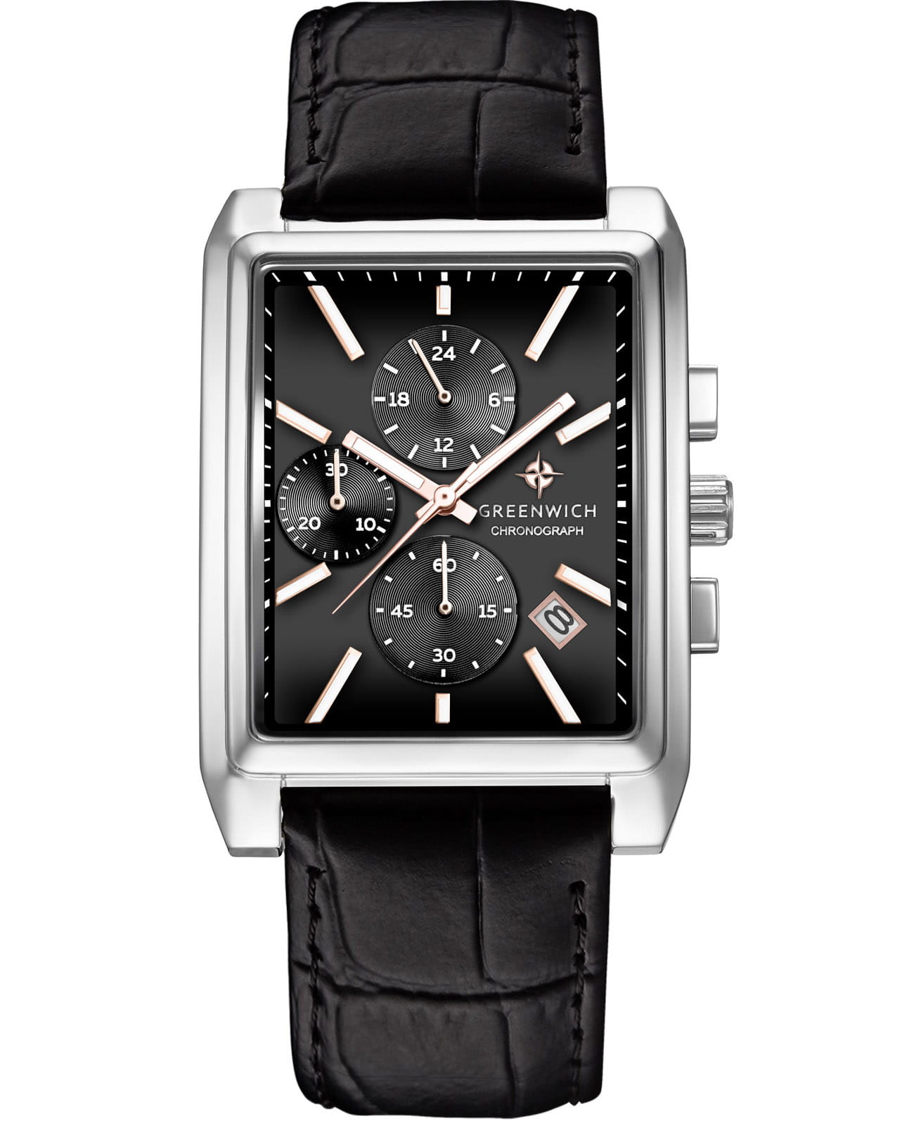 Часы Greenwich GW 553.11.15 из коллекции Galeon Chrono — элегантная мужская модель, сочетающая классический дизайн и функциональность. Корпус размером 33 x 40 мм выполнен из нержавеющей стали. Чёрный циферблат с люминесцентными стрелками и метками оснащён индикатором 24-х часов и окошком даты в позиции «4 часа». Циферблат защищён минеральным стекломМинеральное стеклоМинеральное стекло представляет собой искусственно выращенный минерал кварца. Такое стекло отличается особой устойчивостью к повреждениям и царапинам. Уступает по некоторым качествам сапфировому стеклу..