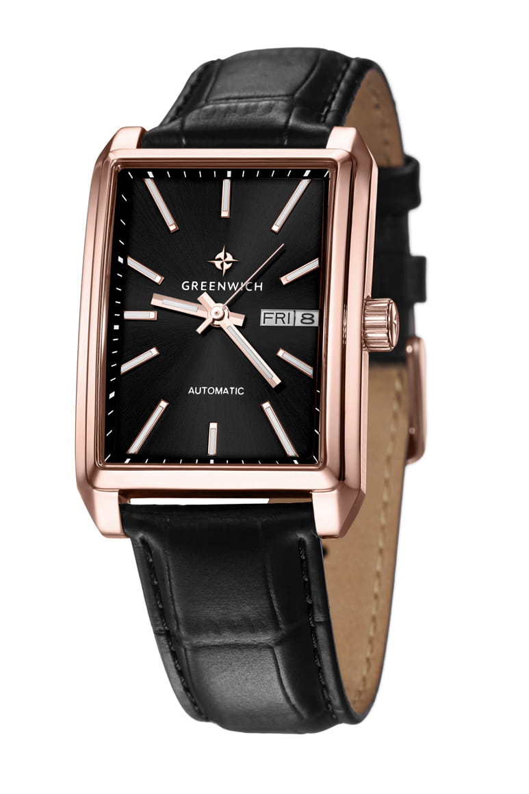 Мужские часы с минеральным стекломМинеральное стеклоМинеральное стекло представляет собой искусственно выращенный минерал кварца. Такое стекло отличается особой устойчивостью к повреждениям и царапинам. Уступает по некоторым качествам сапфировому стеклу. Greenwich Caravel GW 564.41.11, представляют собой классический вариант для повседневной носки. Корпус часов выполнен из нержавеющей стали с PVD-покрытиемPVDУльтратонкое покрытие наносится в технике вакуумного напыления, сочетает в себе нитрид титана особой прочности со слоем золота или оксида хрома. Несёт в себе декоративную или защитную функцию.. Окошко даты и дня недели находится в положении 3 часа. Стрелки с люминесцентным покрытиемЛюминесцентное покрытиеПозволяет считывать показания времени в темноте. Производители наносят на стрелки, часовые индексы, безель или поверхность циферблата светонакопительный состав, дающий холодное свечение.. Кожаный ремешок на стандартной застежке.