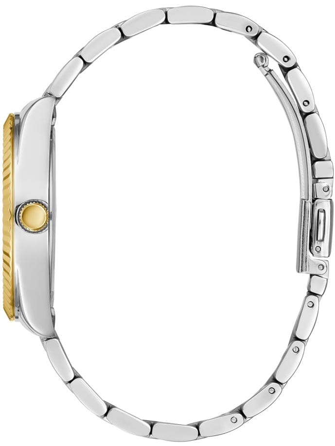 Женские наручные часы Guess Dress Steel GW0308L5 с минеральным стекломМинеральное стеклоМинеральное стекло представляет собой искусственно выращенный минерал кварца. Такое стекло отличается особой устойчивостью к повреждениям и царапинам. Уступает по некоторым качествам сапфировому стеклу., кварцевый механизм с высокой точностью. Циферблат выполнен по технологии Sunray (солнечные лучи). Метки в виде штрихов и римских цифр. Окошко даты с увеличительным стеклом. День недели отображается в положении 12 часов. Класс водозащиты: 30 метров, позволит защитить корпус от случайных брызг или капель дождя. Корпус часов изготовлен из стали. Браслет с раскладной застёжкойРаскладная застёжкаТакой тип застёжки используется только на браслетах из металла. Она никогда не раскрывается полностью, происходит разделение на 2 и более частей. Раскладывающая застёжка снизит вероятность потери часов к минимуму.