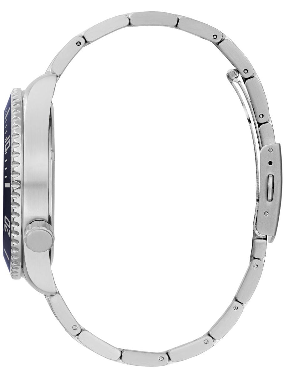 Кварцевый механизм с высокой точностью. Минеральное стеклоМинеральное стеклоМинеральное стекло представляет собой искусственно выращенный минерал кварца. Такое стекло отличается особой устойчивостью к повреждениям и царапинам. Уступает по некоторым качествам сапфировому стеклу. устойчивое к появлению царапин, обладающее высокой прозрачностью. Стрелки с люминесцентным покрытиемЛюминесцентное покрытиеПозволяет считывать показания времени в темноте. Производители наносят на стрелки, часовые индексы, безель или поверхность циферблата светонакопительный состав, дающий холодное свечение.. Класс водозащиты: 50 метров, позволит защитить корпус от случайных брызг или капель дождя. Корпус часов изготовлен из нержавеющей стали. Браслет с раскладной застёжкойРаскладная застёжкаТакой тип застёжки используется только на браслетах из металла. Она никогда не раскрывается полностью, происходит разделение на 2 и более частей. Раскладывающая застёжка снизит вероятность потери часов к минимуму..