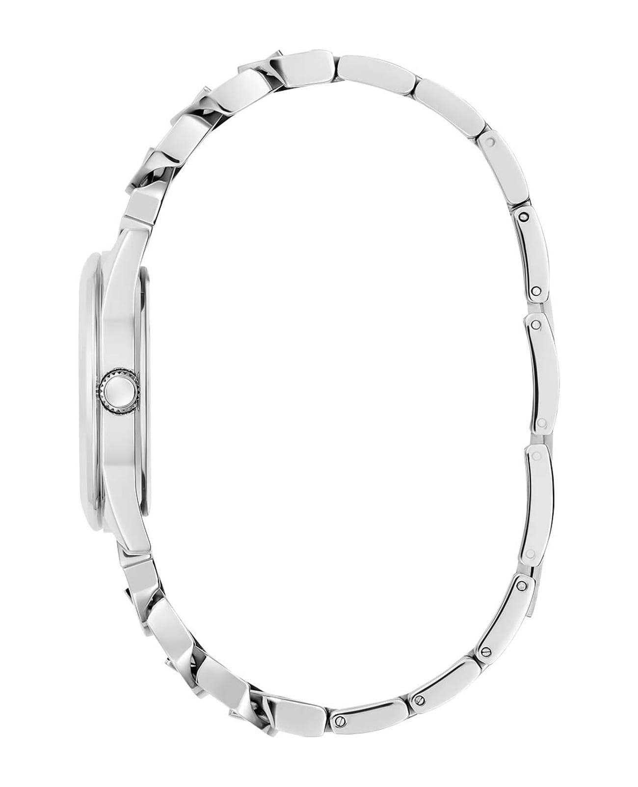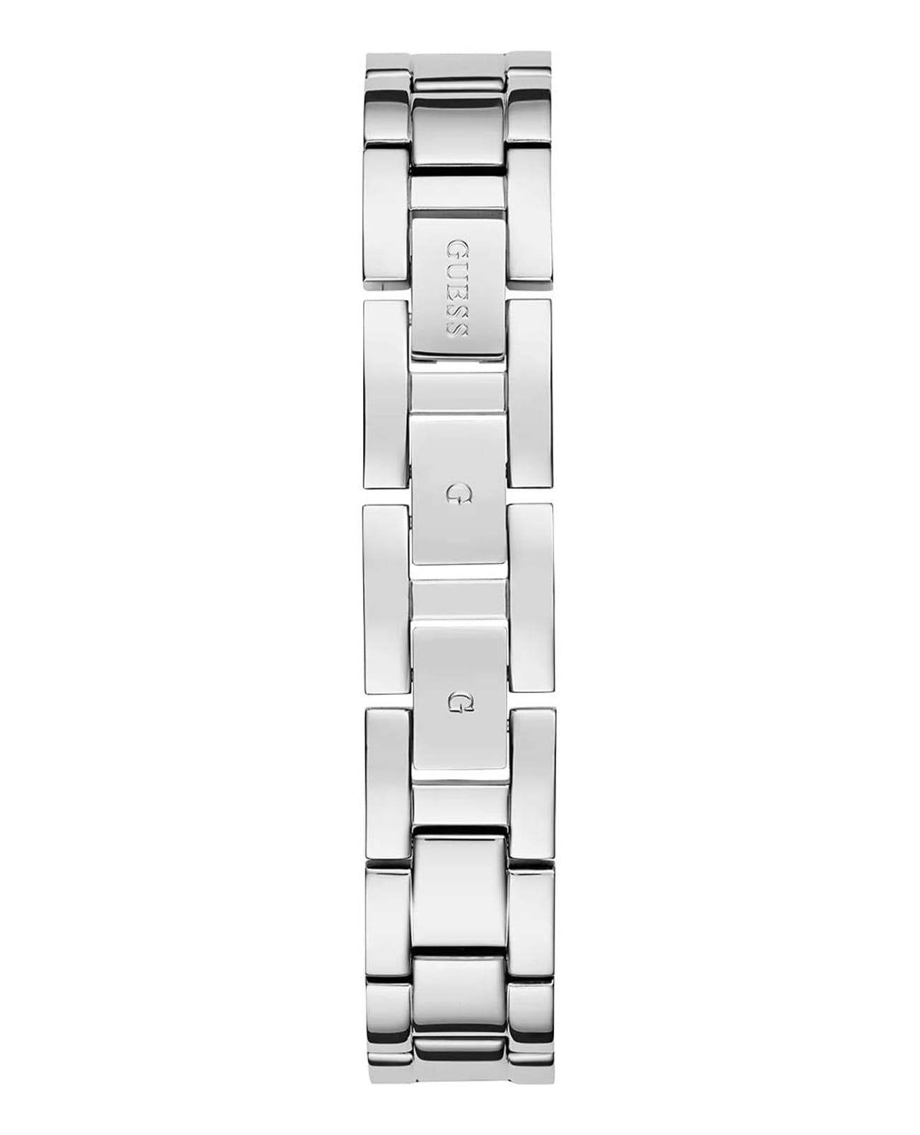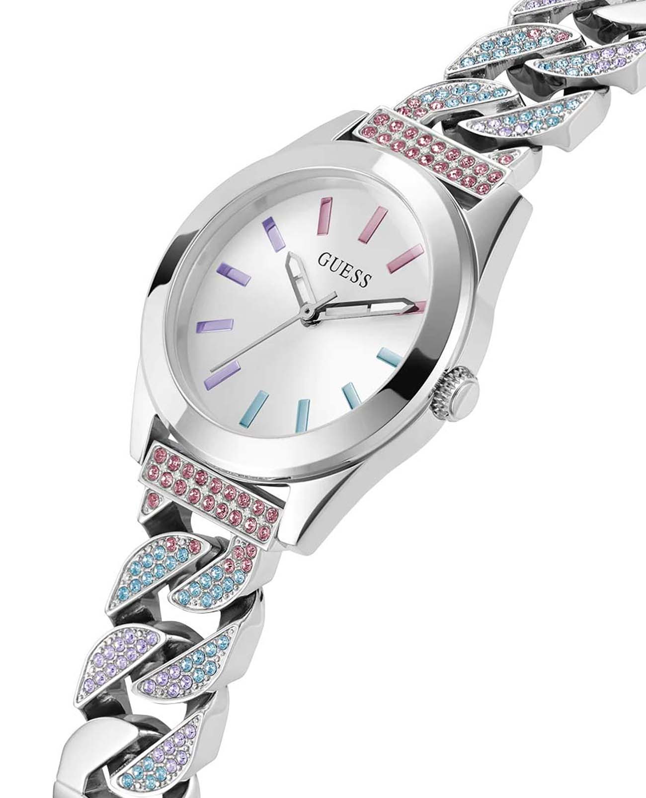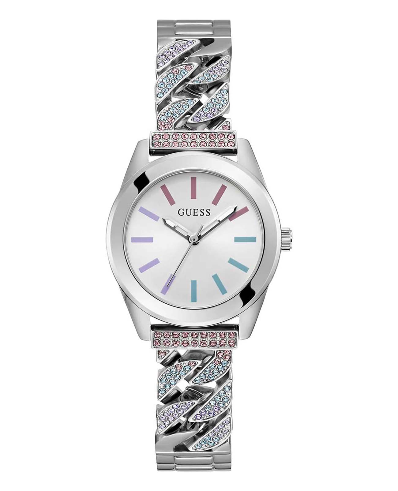 Женские наручные часы Guess Trend GW0546L4 с минеральным стекломМинеральное стеклоМинеральное стекло представляет собой искусственно выращенный минерал кварца. Такое стекло отличается особой устойчивостью к повреждениям и царапинам. Уступает по некоторым качествам сапфировому стеклу., кварцевый механизм с высокой точностью. Корпус часов и браслет изготовлены из стали. Стрелки с люминесцентным покрытиемЛюминесцентное покрытиеПозволяет считывать показания времени в темноте. Производители наносят на стрелки, часовые индексы, безель или поверхность циферблата светонакопительный состав, дающий холодное свечение.. Класс водозащиты: 30 метров, позволит защитить корпус от случайных брызг или капель дождя. Браслет из нержавеющей стали частично украшен кристаллами на ювелирной застежке.