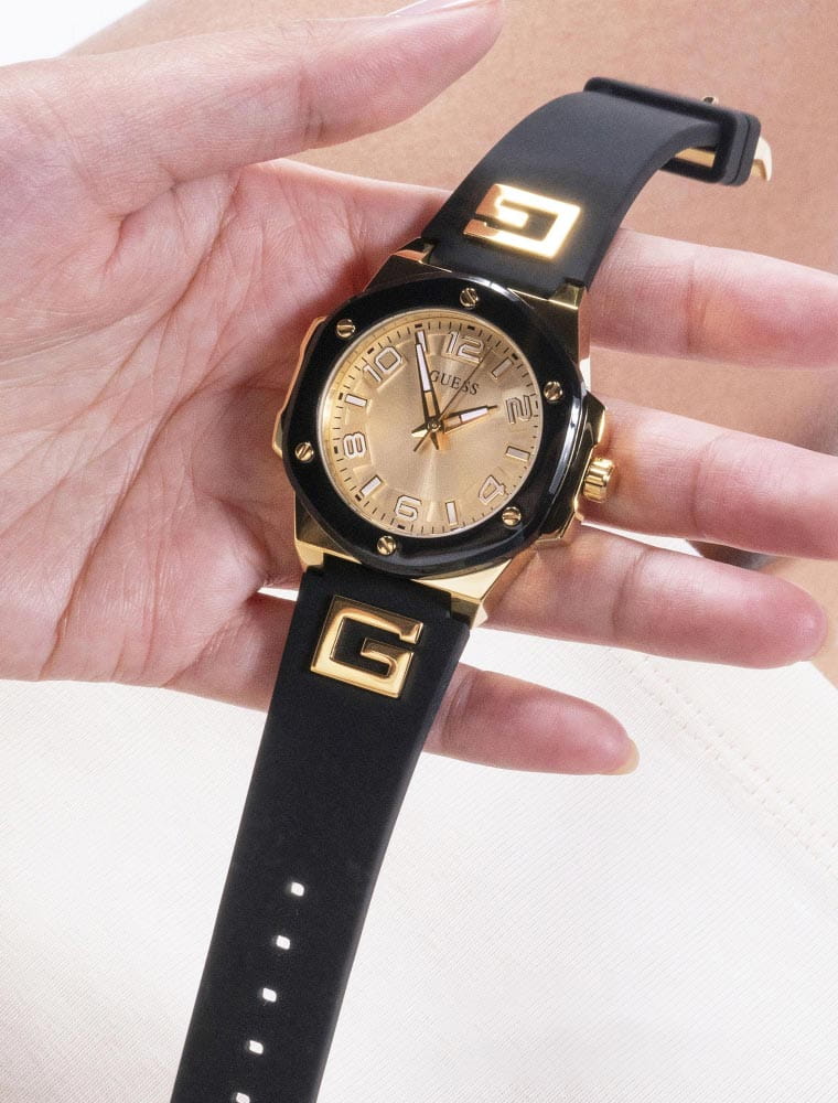Женские наручные часы Guess Sport Steel GW0555L2 с минеральным стекломМинеральное стеклоМинеральное стекло представляет собой искусственно выращенный минерал кварца. Такое стекло отличается особой устойчивостью к повреждениям и царапинам. Уступает по некоторым качествам сапфировому стеклу., кварцевый механизм с высокой точностью. Стрелки и метки с люминесцентным покрытиемЛюминесцентное покрытиеПозволяет считывать показания времени в темноте. Производители наносят на стрелки, часовые индексы, безель или поверхность циферблата светонакопительный состав, дающий холодное свечение.. Класс водозащиты: 50 метров, позволит защитить корпус от случайных брызг или капель дождя. Корпус часов и безельБезельВнешний ободок, закрепляющий стекло. В спортивных часах так называется поворотное кольцо с делениями на циферблате, выполняет роль таймера – замеряет отрезки времени на шкале. Неподвижный безель – элемент декора. Однонаправленно вращающийся безель на дайверских часах позволяет фиксировать моменты погружения и выныривания на поверхность. изготовлены из стали с IP-покрытиемIP-покрытиеМетод ионного напыления. Демонстрирует повышенную устойчивость к истиранию, окислению и химическим веществам. Под воздействием высокого давления и температуры около 1500°C молекулы металла надёжно соединяются с частицами корпуса часов.. Силиконовый ремешок с классической застежкой.