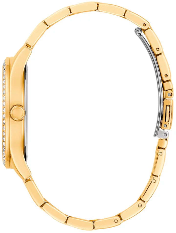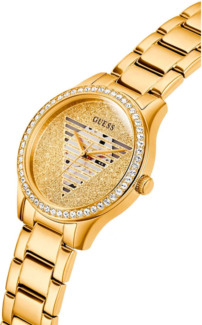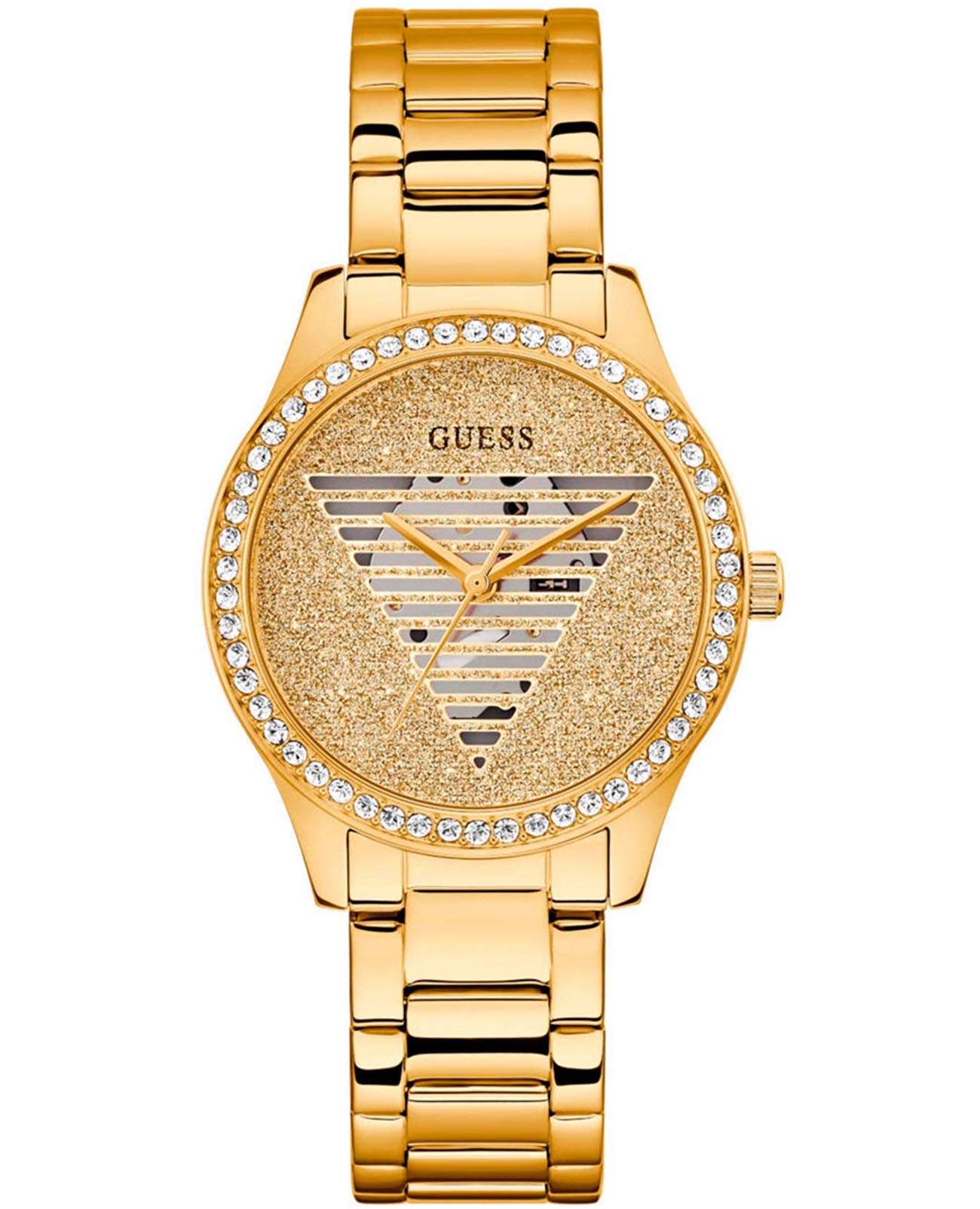 Женские наручные часы с минеральным стекломМинеральное стеклоМинеральное стекло представляет собой искусственно выращенный минерал кварца. Такое стекло отличается особой устойчивостью к повреждениям и царапинам. Уступает по некоторым качествам сапфировому стеклу. Guess Lady Idol GW0605L2, кварцевый механизм с высокой точностью. Класс водозащиты: 30 метров, позволит защитить корпус от случайных брызг или капель дождя. Корпус часов изготовлен из стали с IP-покрытиемIP-покрытиеМетод ионного напыления. Демонстрирует повышенную устойчивость к истиранию, окислению и химическим веществам. Под воздействием высокого давления и температуры около 1500°C молекулы металла надёжно соединяются с частицами корпуса часов.. Стальной браслет на раскладной застёжкеРаскладная застёжкаТакой тип застёжки используется только на браслетах из металла. Она никогда не раскрывается полностью, происходит разделение на 2 и более частей. Раскладывающая застёжка снизит вероятность потери часов к минимуму. с IP-покрытиемIP-покрытиеМетод ионного напыления. Демонстрирует повышенную устойчивость к истиранию, окислению и химическим веществам. Под воздействием высокого давления и температуры около 1500°C молекулы металла надёжно соединяются с частицами корпуса часов.. БезельБезельВнешний ободок, закрепляющий стекло. В спортивных часах так называется поворотное кольцо с делениями на циферблате, выполняет роль таймера – замеряет отрезки времени на шкале. Неподвижный безель – элемент декора. Однонаправленно вращающийся безель на дайверских часах позволяет фиксировать моменты погружения и выныривания на поверхность. инкрустирован кристаллами.