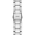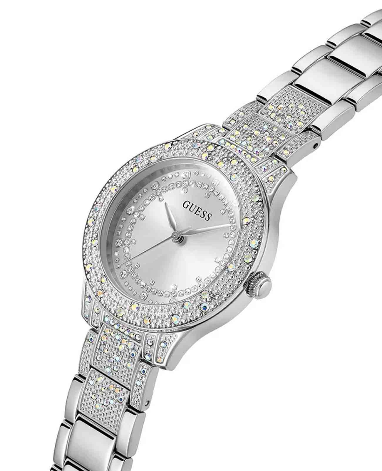Женские наручные часы с минеральным стекломМинеральное стеклоМинеральное стекло представляет собой искусственно выращенный минерал кварца. Такое стекло отличается особой устойчивостью к повреждениям и царапинам. Уступает по некоторым качествам сапфировому стеклу. Guess Trend GW0746L1, кварцевый механизм с высокой точностью. Корпус часов изготовлен из стали. БезельБезельВнешний ободок, закрепляющий стекло. В спортивных часах так называется поворотное кольцо с делениями на циферблате, выполняет роль таймера – замеряет отрезки времени на шкале. Неподвижный безель – элемент декора. Однонаправленно вращающийся безель на дайверских часах позволяет фиксировать моменты погружения и выныривания на поверхность., корпус и циферблат украшены кристаллами. Класс водозащиты: 30 метров, позволит защитить корпус от случайных брызг или капель дождя. Стальной браслет на раскладной застёжкеРаскладная застёжкаТакой тип застёжки используется только на браслетах из металла. Она никогда не раскрывается полностью, происходит разделение на 2 и более частей. Раскладывающая застёжка снизит вероятность потери часов к минимуму..