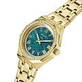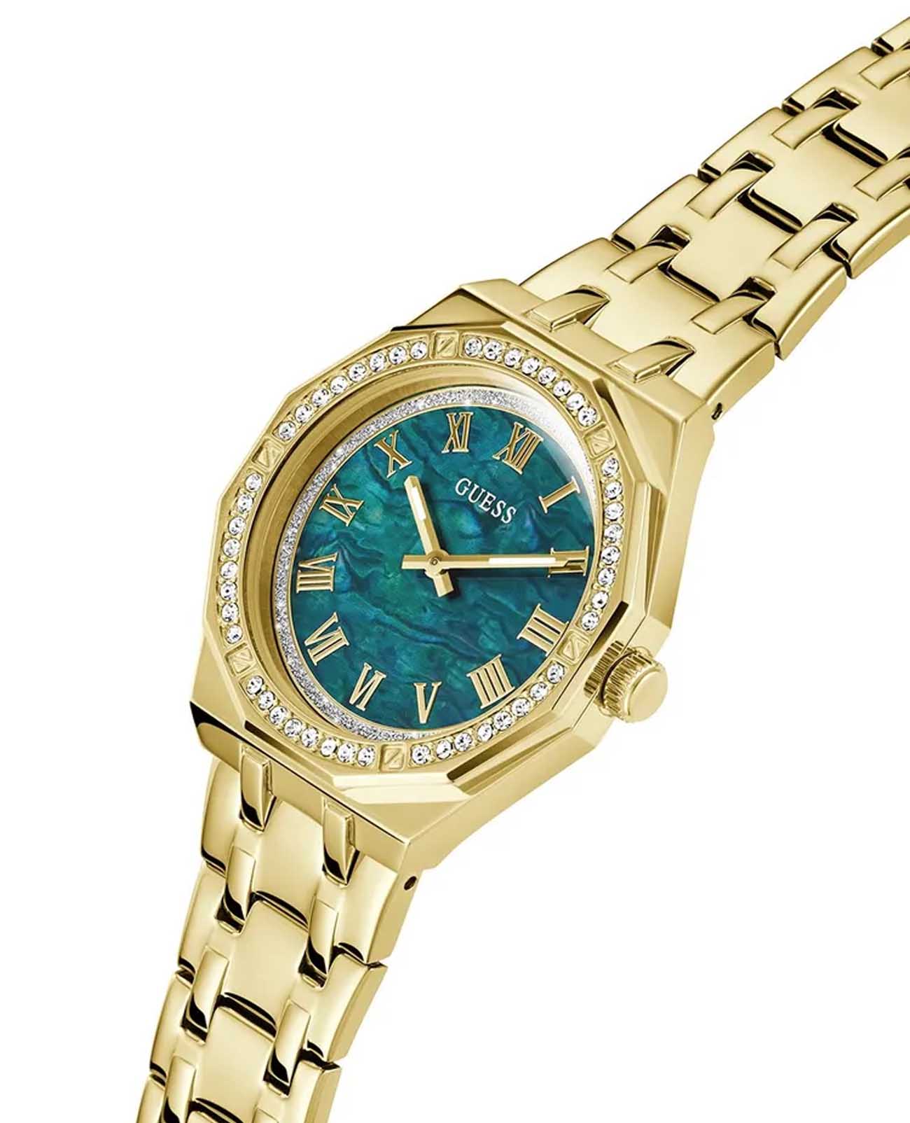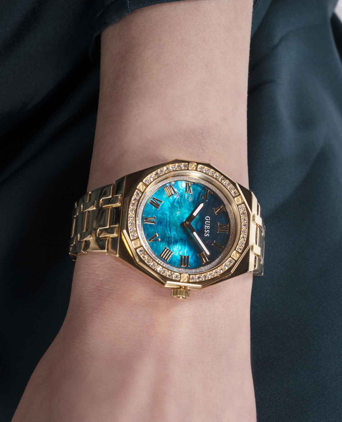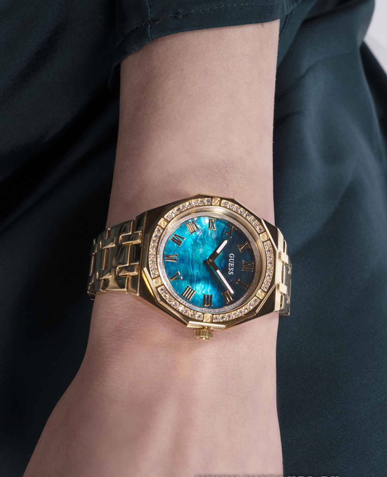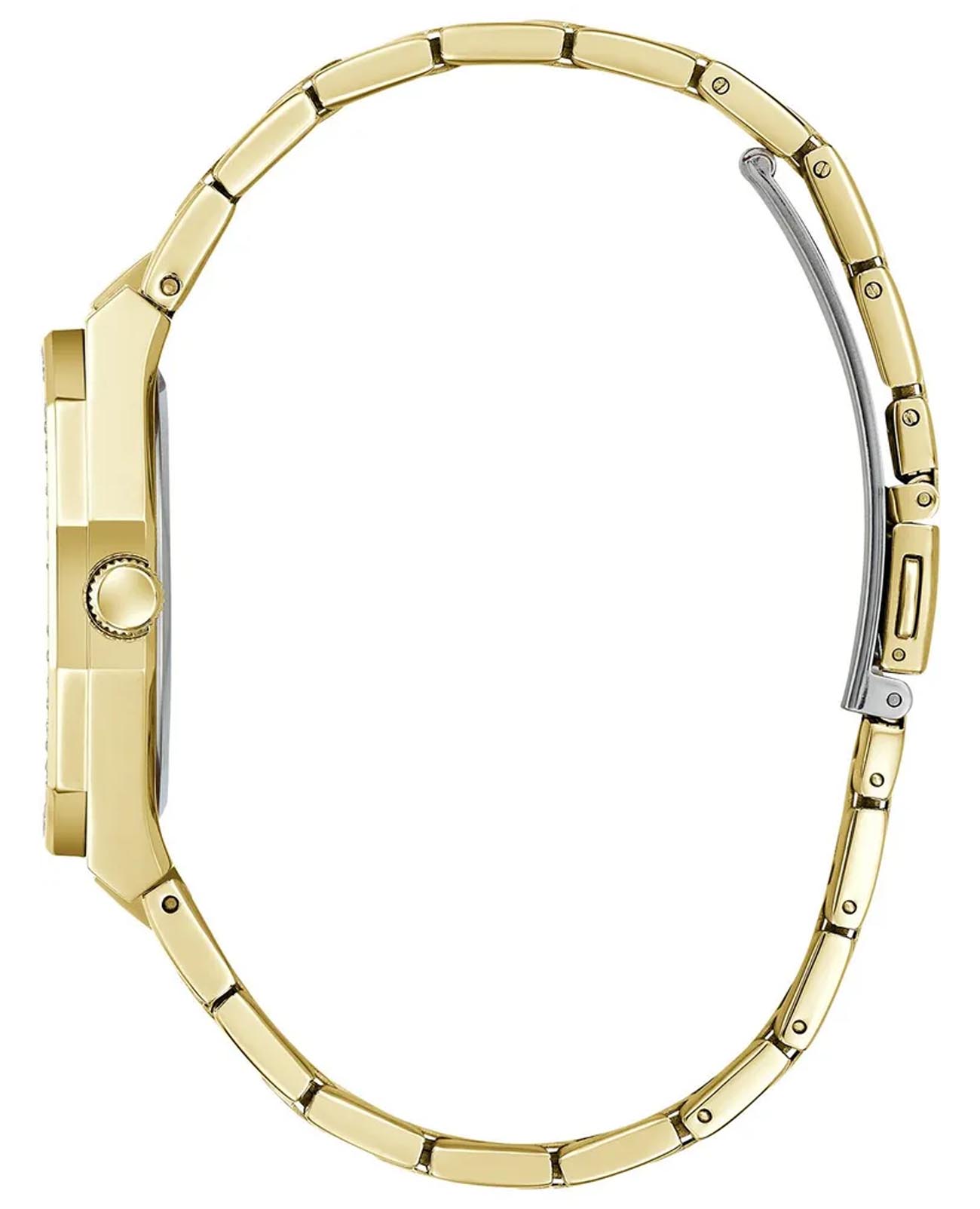Женские наручные часы Guess Dress GW0770L2 с минеральным стекломМинеральное стеклоМинеральное стекло представляет собой искусственно выращенный минерал кварца. Такое стекло отличается особой устойчивостью к повреждениям и царапинам. Уступает по некоторым качествам сапфировому стеклу., кварцевый механизм с высокой точностью. Корпус часов изготовлен из стали с IP-покрытиемIP-покрытиеМетод ионного напыления. Демонстрирует повышенную устойчивость к истиранию, окислению и химическим веществам. Под воздействием высокого давления и температуры около 1500°C молекулы металла надёжно соединяются с частицами корпуса часов.. БезельБезельВнешний ободок, закрепляющий стекло. В спортивных часах так называется поворотное кольцо с делениями на циферблате, выполняет роль таймера – замеряет отрезки времени на шкале. Неподвижный безель – элемент декора. Однонаправленно вращающийся безель на дайверских часах позволяет фиксировать моменты погружения и выныривания на поверхность. украшен кристаллами. Стрелки с люминесцентным покрытиемЛюминесцентное покрытиеПозволяет считывать показания времени в темноте. Производители наносят на стрелки, часовые индексы, безель или поверхность циферблата светонакопительный состав, дающий холодное свечение.. Класс водозащиты: 50 метров, позволит защитить корпус от случайных брызг или капель дождя. Стальной браслет с IP-покрытиемIP-покрытиеМетод ионного напыления. Демонстрирует повышенную устойчивость к истиранию, окислению и химическим веществам. Под воздействием высокого давления и температуры около 1500°C молекулы металла надёжно соединяются с частицами корпуса часов. на раскладной застёжкеРаскладная застёжкаТакой тип застёжки используется только на браслетах из металла. Она никогда не раскрывается полностью, происходит разделение на 2 и более частей. Раскладывающая застёжка снизит вероятность потери часов к минимуму..