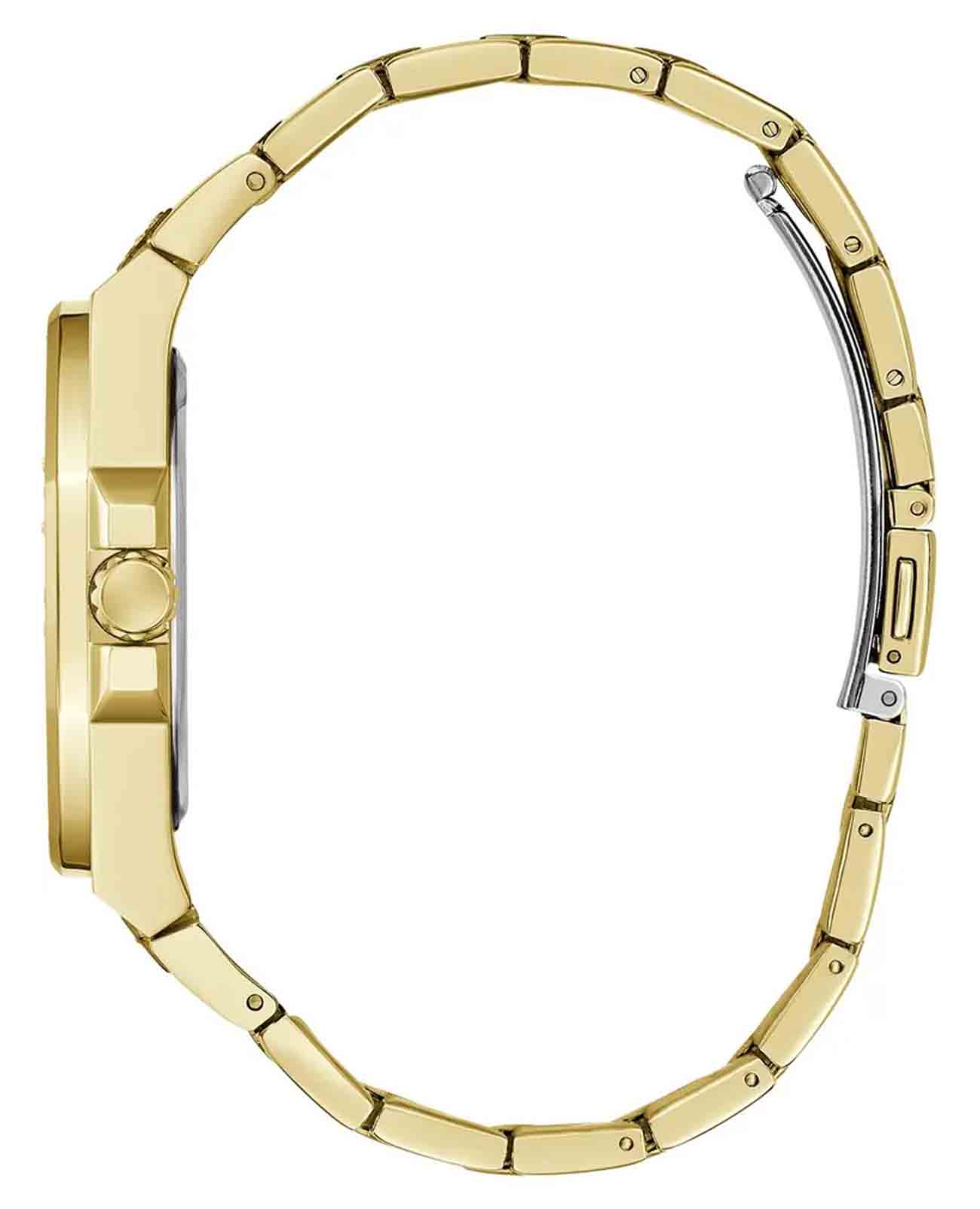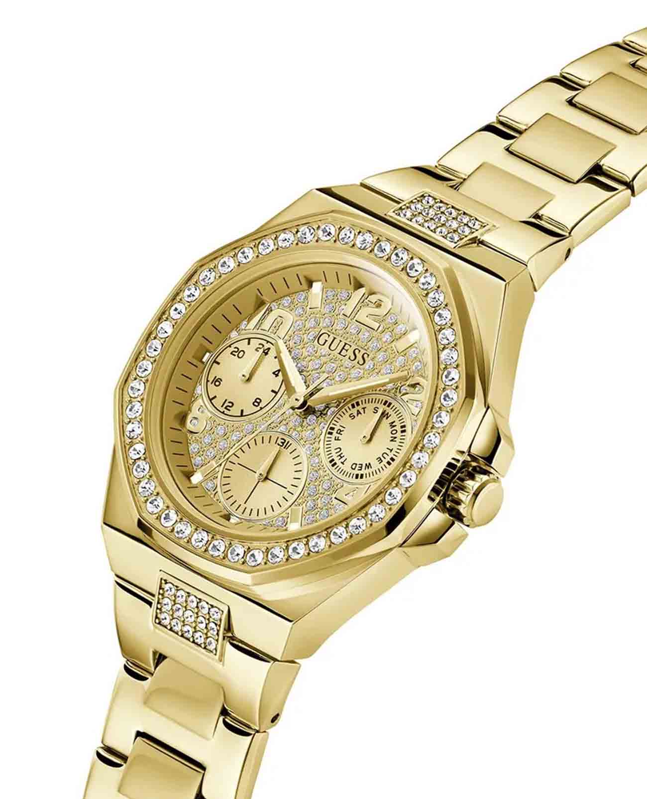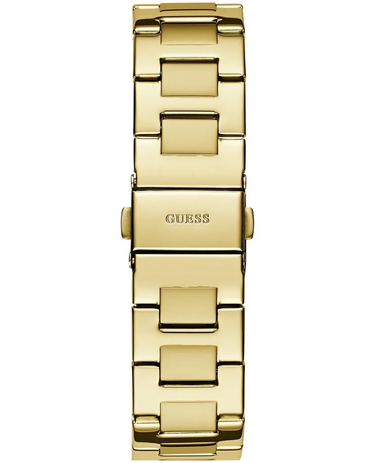 Женские наручные часы с минеральным стекломМинеральное стеклоМинеральное стекло представляет собой искусственно выращенный минерал кварца. Такое стекло отличается особой устойчивостью к повреждениям и царапинам. Уступает по некоторым качествам сапфировому стеклу. Guess Trend GW0777L2, кварцевый механизм с высокой точностью. Корпус часов изготовлен из стали с IP-покрытиемIP-покрытиеМетод ионного напыления. Демонстрирует повышенную устойчивость к истиранию, окислению и химическим веществам. Под воздействием высокого давления и температуры около 1500°C молекулы металла надёжно соединяются с частицами корпуса часов.. БезельБезельВнешний ободок, закрепляющий стекло. В спортивных часах так называется поворотное кольцо с делениями на циферблате, выполняет роль таймера – замеряет отрезки времени на шкале. Неподвижный безель – элемент декора. Однонаправленно вращающийся безель на дайверских часах позволяет фиксировать моменты погружения и выныривания на поверхность. с IP-покрытиемIP-покрытиеМетод ионного напыления. Демонстрирует повышенную устойчивость к истиранию, окислению и химическим веществам. Под воздействием высокого давления и температуры около 1500°C молекулы металла надёжно соединяются с частицами корпуса часов., корпус и циферблат украшены кристаллами. Стрелки с люминесцентным покрытиемЛюминесцентное покрытиеПозволяет считывать показания времени в темноте. Производители наносят на стрелки, часовые индексы, безель или поверхность циферблата светонакопительный состав, дающий холодное свечение.. Класс водозащиты: 50 метров, позволит защитить корпус от случайных брызг или капель дождя. Стальной браслет с IP-покрытиемIP-покрытиеМетод ионного напыления. Демонстрирует повышенную устойчивость к истиранию, окислению и химическим веществам. Под воздействием высокого давления и температуры около 1500°C молекулы металла надёжно соединяются с частицами корпуса часов. на раскладной застёжкеРаскладная застёжкаТакой тип застёжки используется только на браслетах из металла. Она никогда не раскрывается полностью, происходит разделение на 2 и более частей. Раскладывающая застёжка снизит вероятность потери часов к минимуму..