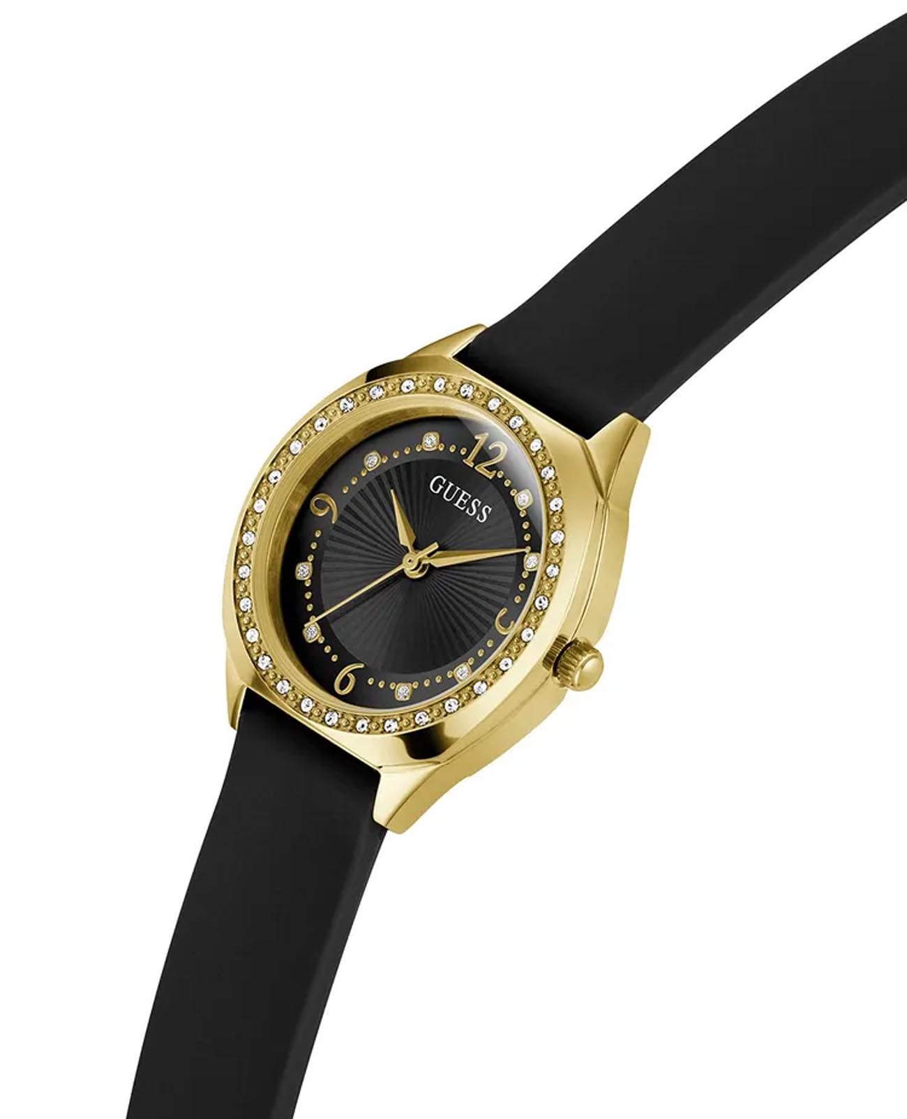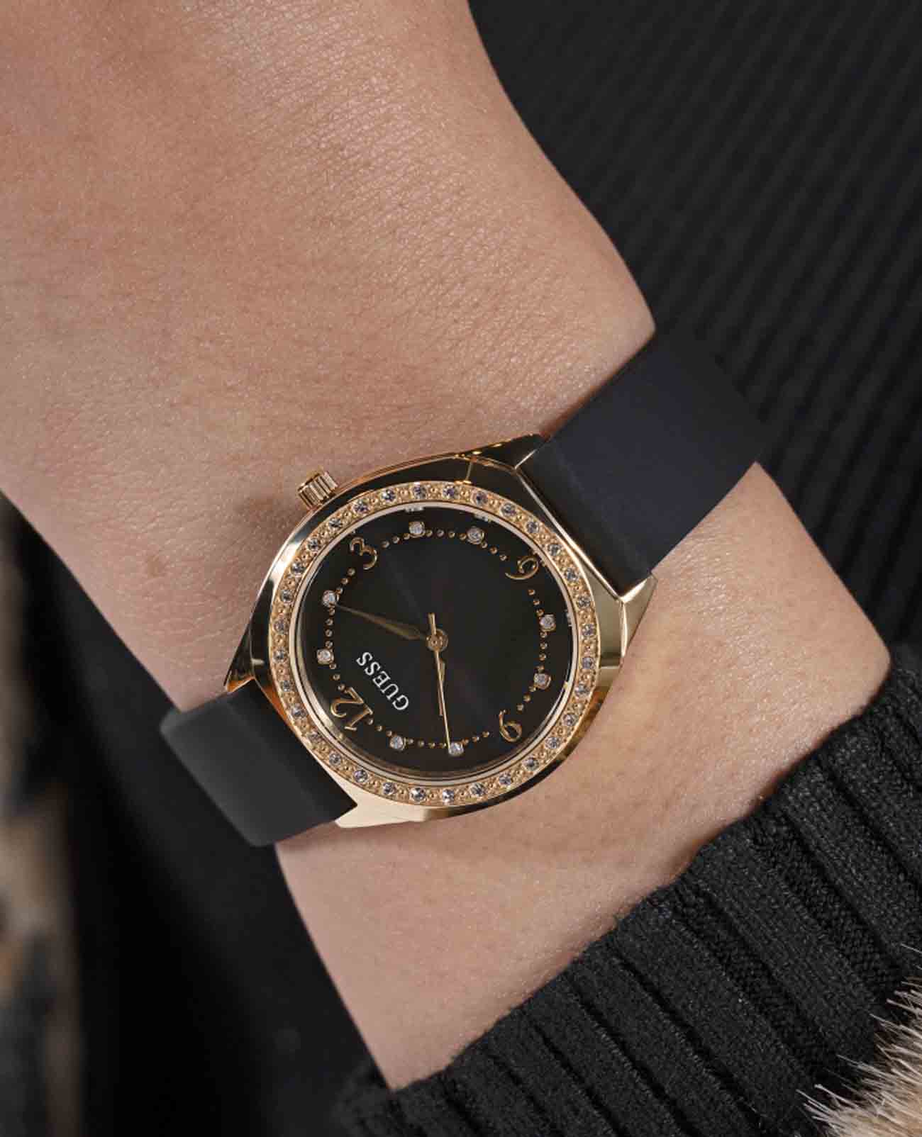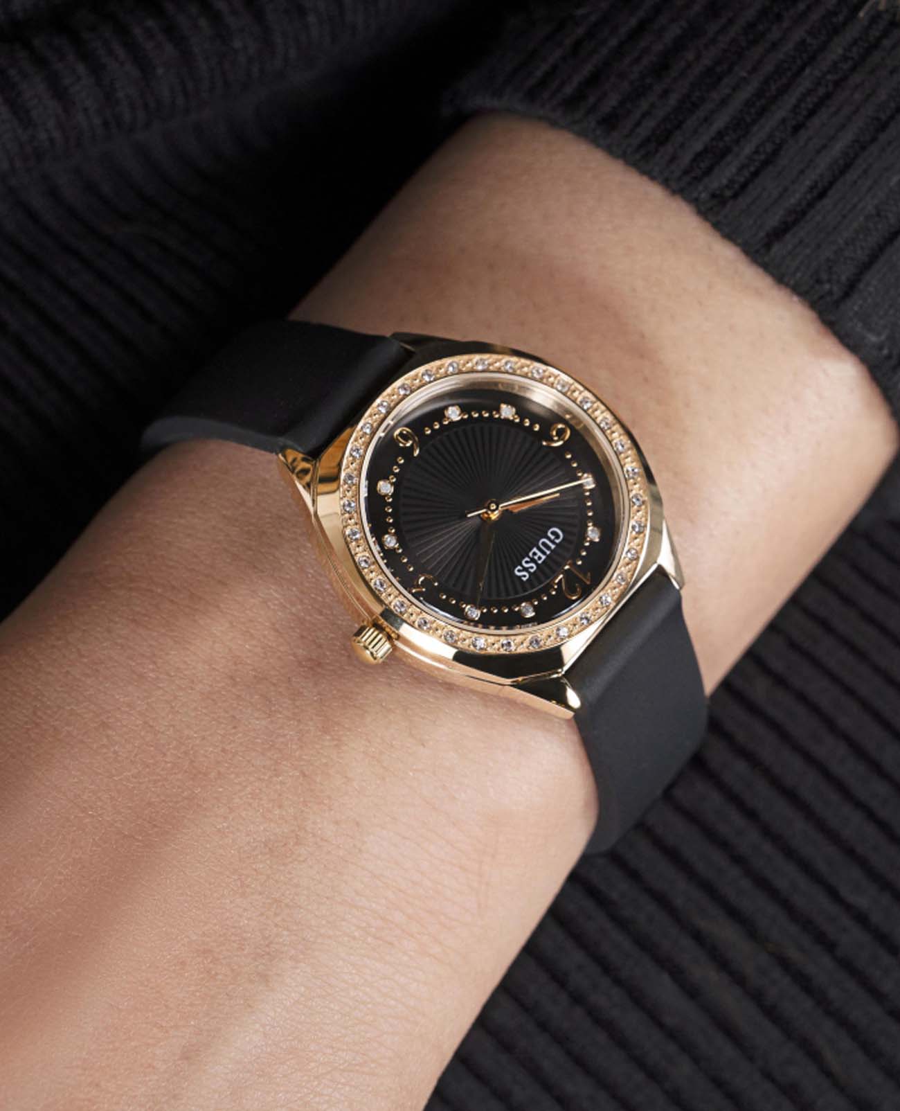 Женские наручные часы Guess Dress GW0820L1 с минеральным стекломМинеральное стеклоМинеральное стекло представляет собой искусственно выращенный минерал кварца. Такое стекло отличается особой устойчивостью к повреждениям и царапинам. Уступает по некоторым качествам сапфировому стеклу., кварцевый механизм с высокой точностью. Корпус часов изготовлен из стали с IP-покрытиемIP-покрытиеМетод ионного напыления. Демонстрирует повышенную устойчивость к истиранию, окислению и химическим веществам. Под воздействием высокого давления и температуры около 1500°C молекулы металла надёжно соединяются с частицами корпуса часов.. БезельБезельВнешний ободок, закрепляющий стекло. В спортивных часах так называется поворотное кольцо с делениями на циферблате, выполняет роль таймера – замеряет отрезки времени на шкале. Неподвижный безель – элемент декора. Однонаправленно вращающийся безель на дайверских часах позволяет фиксировать моменты погружения и выныривания на поверхность. с IP-покрытиемIP-покрытиеМетод ионного напыления. Демонстрирует повышенную устойчивость к истиранию, окислению и химическим веществам. Под воздействием высокого давления и температуры около 1500°C молекулы металла надёжно соединяются с частицами корпуса часов. и циферблат украшены кристаллами. Класс водозащиты: 50 метров, позволит защитить корпус от случайных брызг или капель дождя. Кожаный ремешок на стандартной застежке.