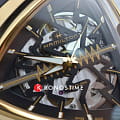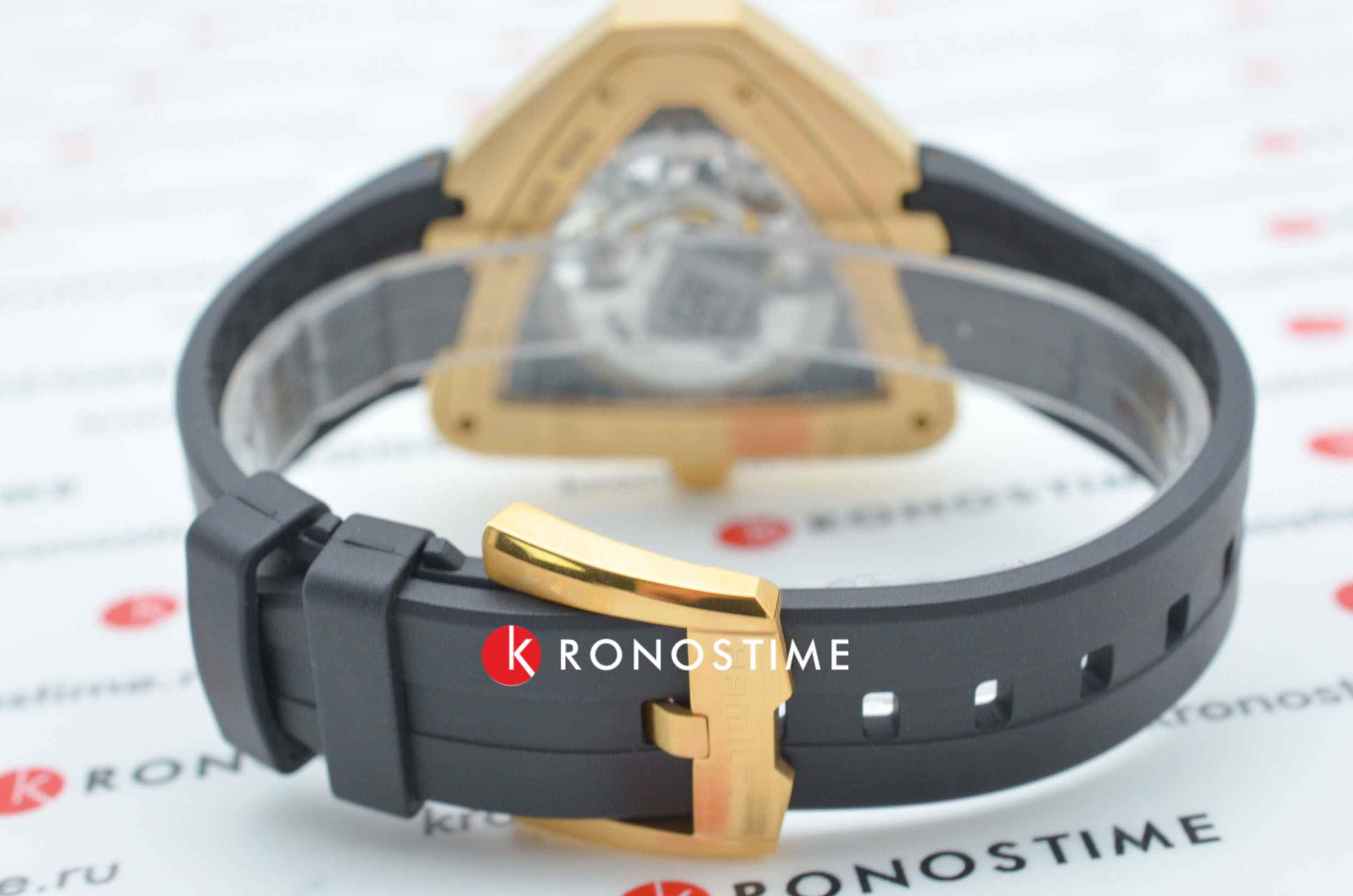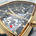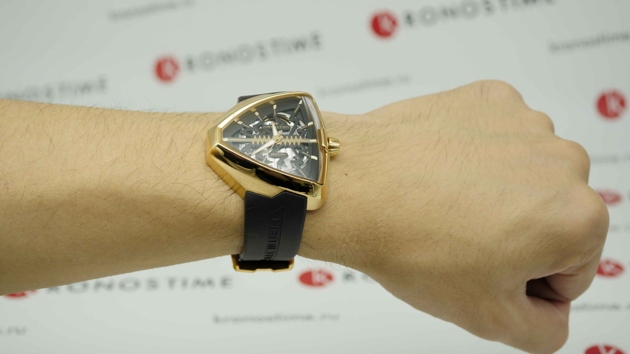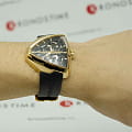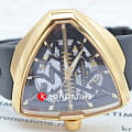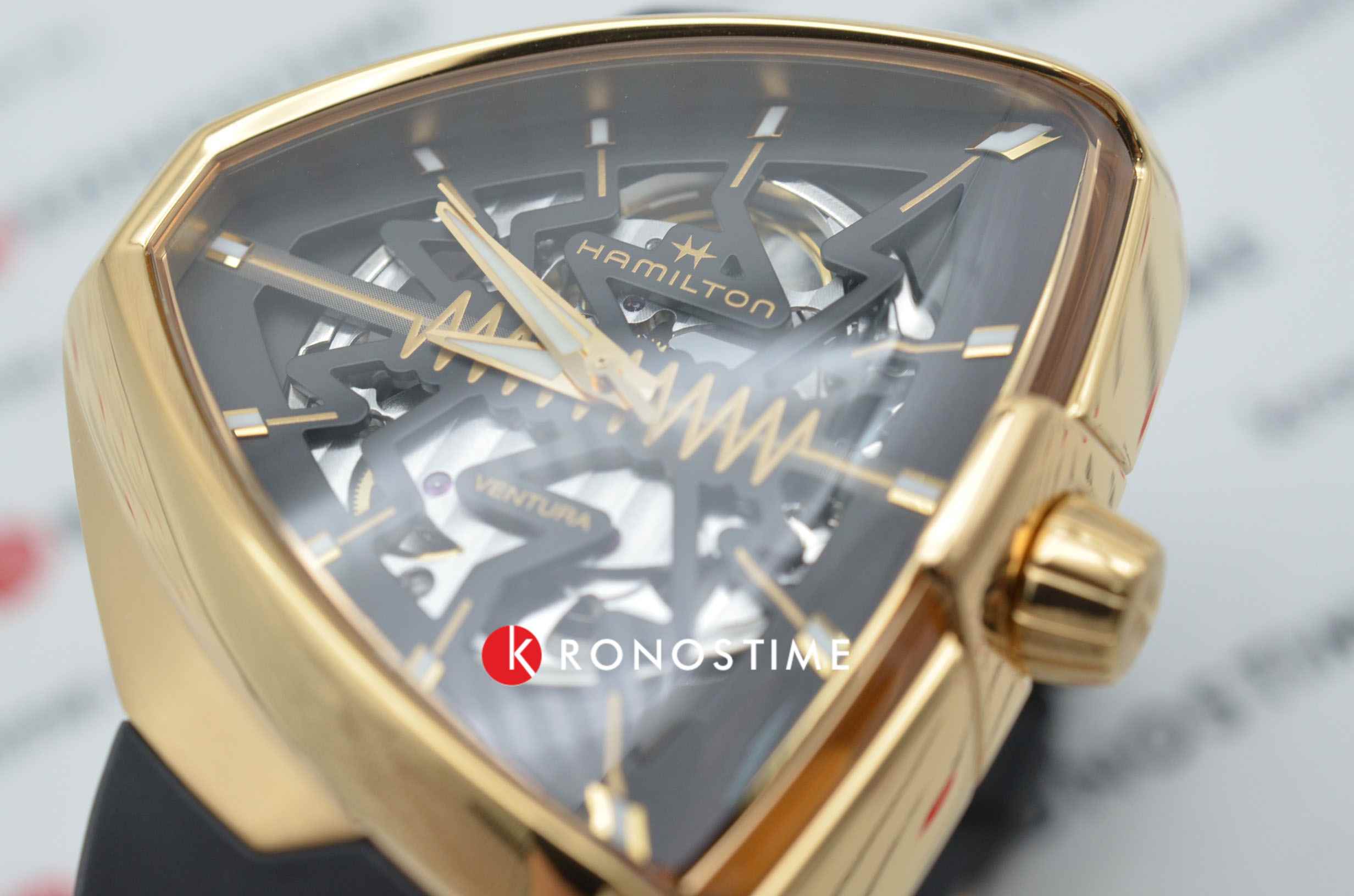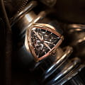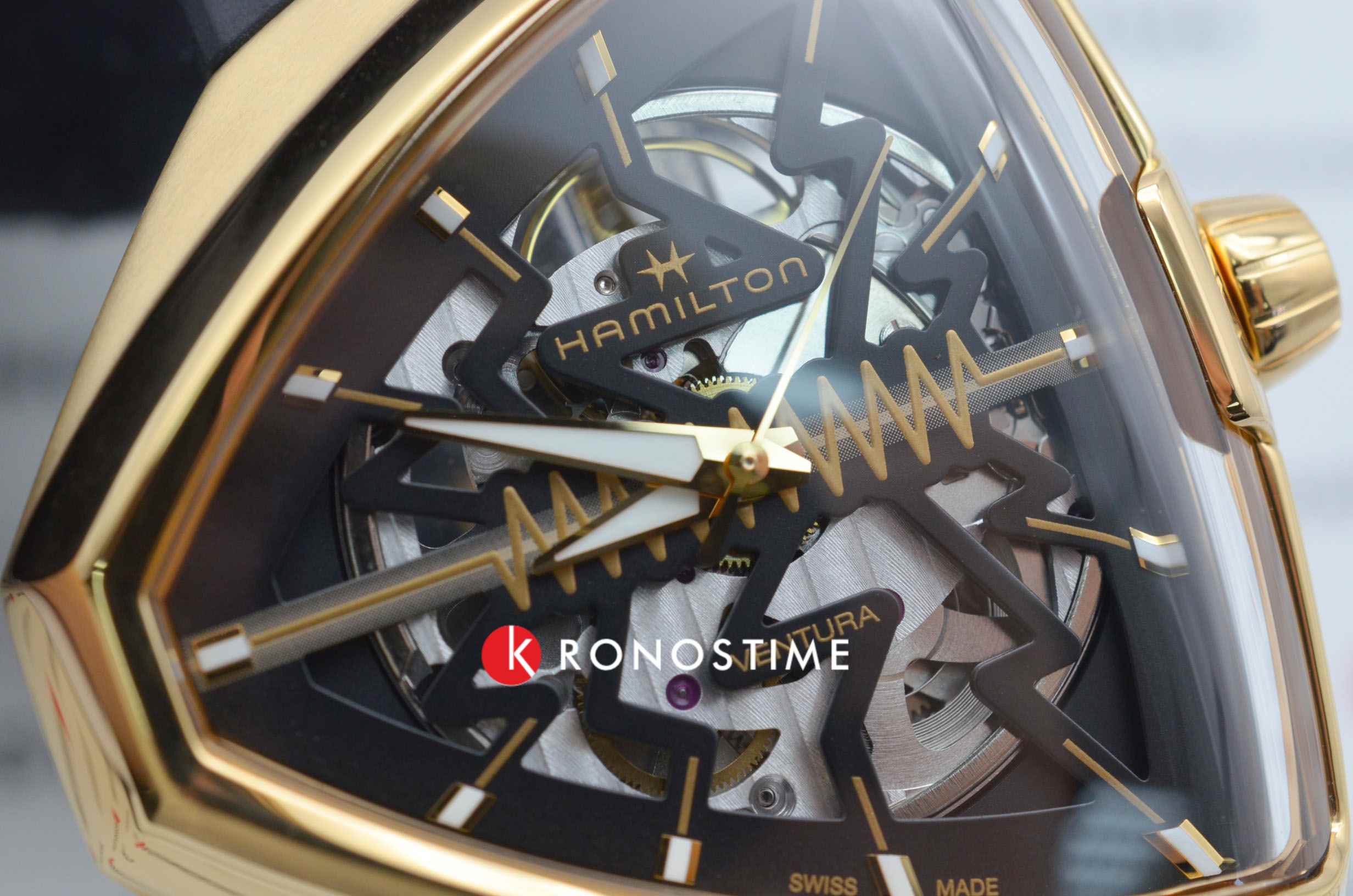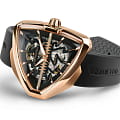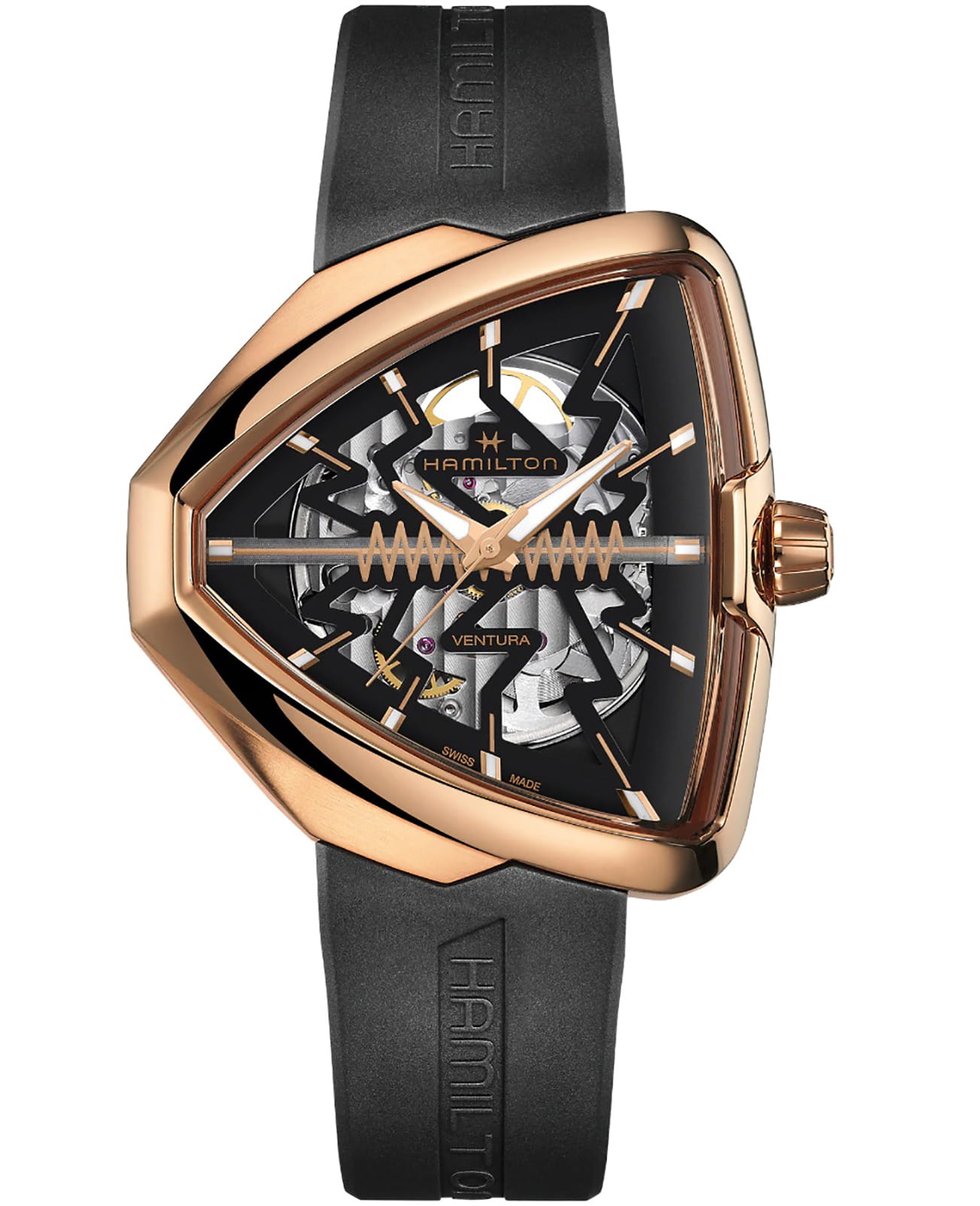 В смелом дизайне Ventura Elvis80 Skeleton отражено прошлое, настоящее и будущее первых в мире электрических часов. Эффектная интерпретация революционной модели, эта модель имеет скелетонизированный циферблат с впечатляющим зигзагом в центре, который сочетается с сияющим треугольным корпусом из розового золота с PVD-покрытием. Деталь в форме молнии воспевает легендарный символ новаторства и привлекает внимание к расположенному ниже механизму с автоматическим подзаводом H-10-S.