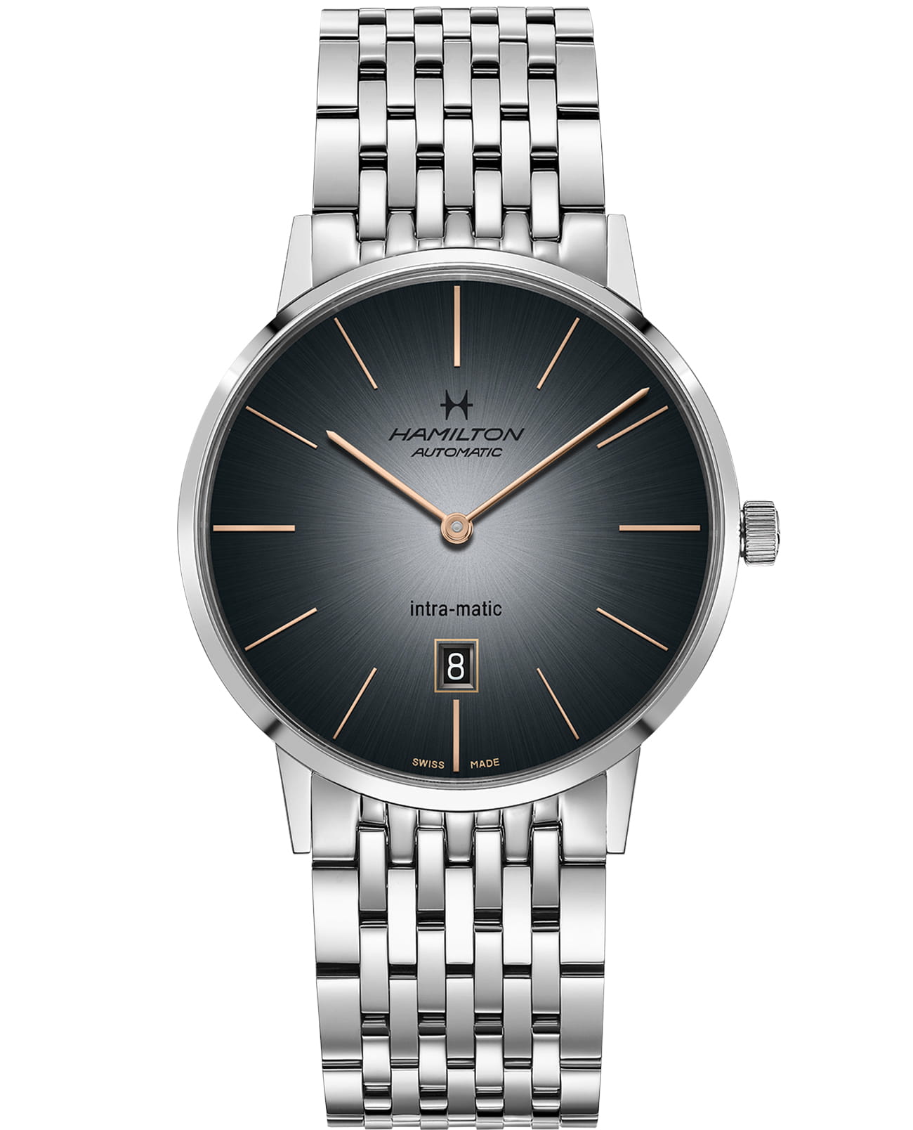 Мужские механические швейцарские часы Hamilton American Classic Intra-Matic Auto H38755181, автоматический механизм с высокой точностью. Сапфировое стеклоСапфировое стеклоПрочный и надёжный материал из кристалла сапфира синтетического происхождения, характеризующийся особой твёрдостью и устойчивостью к царапинам и повреждениям. устойчивое к появлению царапин, обладающее высокой прозрачностью. Класс водозащиты: 50 метров, позволит защитить корпус от случайных брызг или капель дождя. Корпус часов изготовлен из стали. Стальной браслет на застёжке-бабочке с кнопкамиЗастёжка "бабочка"Такой вид застёжки дополняется предохранителями, помогающими избежать случайного раскрытия браслета. Обладают изящным исполнением. .