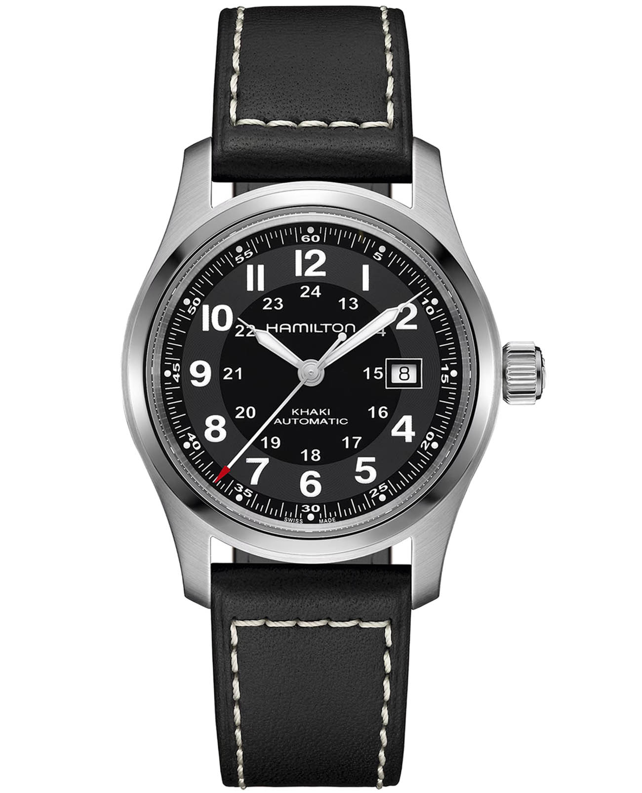 Часы Hamilton Khaki Field Automatic (модель H70605733) воплощают дух военных часов с современными технологиями. Модель с 42-мм корпусом из нержавеющей стали оснащена сапфировым стекломСапфировое стеклоПрочный и надёжный материал из кристалла сапфира синтетического происхождения, характеризующийся особой твёрдостью и устойчивостью к царапинам и повреждениям. с антибликовым покрытиемАнтибликовое покрытиеСлой оксида металла в 0,13-0,3 микрон, благодаря которому стекло часов не бликует и не отражает свет. Антибликовое покрытие уменьшает отражение света в 10 раз, обеспечивая отличную читаемость показателей циферблата. и демонстрационной задней крышкой, через которую виден автоматический механизм H-10 с 80-часовым запасом хода. Особенностью калибра стала система Nivachron™Nivachron™Специально разработанный инновационный сплав Nivachron™ повышает устойчивость часов к воздействию магнитных полей., обеспечивающая устойчивость к магнитным полям. Чёрный циферблат с эффектом sunray сочетает арабские цифры и метки с люминесцентным покрытиемЛюминесцентное покрытиеПозволяет считывать показания времени в темноте. Производители наносят на стрелки, часовые индексы, безель или поверхность циферблата светонакопительный состав, дающий холодное свечение., 24-часовой шкалой и окном даты. Водонепроницаемость 100 метров делает модель подходящей для плавания. Комплектация включает кожаный ремешок с классической застёжкойРаскладной замокДанный вариант застежки используется только на часах с металлическим браслетом. Отличительная особенность такого крепления в том, что длина браслета становится универсальной и вы можете самостоятельно отрегулировать нужный вам размер – застежка просто двигается по браслету часов..