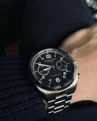 Выдержанные в стиле моделей, создаваемых в 1970-е годы для британских ВВС, часы Khaki Pilot Pioneer приводятся в действие с помощью современных технологий. Современные материалы и испытанный на практике дизайн позволили создать часы с поразительной индикацией показаний. Мужские механические швейцарские часы-хронографХронографФункция позволяет измерять отрезки времени с особой точностью: часы, минуты, секунды. Верным признаком хронографа является наличие на циферблате 3 дополнительных окошек-счётчиков. с секундомеромСекундомерСекундоме́р — прибор, способный измерять интервалы времени с точностью до долей секунды. и автоматическим подзаводом Hamilton Khaki Aviation H76416135, механический механизм (автоматический калибр) с высокой точностью. Сапфировое стеклоСапфировое стеклоПрочный и надёжный материал из кристалла сапфира синтетического происхождения, характеризующийся особой твёрдостью и устойчивостью к царапинам и повреждениям. устойчивое к появлению царапин, обладающее высокой прозрачностью. Класс водозащиты: 100 метров, позволит плавать, нырять и заниматься другими водными видами спорта. Корпус часов изготовлен из стали. Стальной браслет на раскладной застёжкеРаскладная застёжкаТакой тип застёжки используется только на браслетах из металла. Она никогда не раскрывается полностью, происходит разделение на 2 и более частей. Раскладывающая застёжка снизит вероятность потери часов к минимуму.. Прозрачная задняя крышка. Модель Auto Chrono оснащена новейшим механизмом хронографаХронографФункция позволяет измерять отрезки времени с особой точностью: часы, минуты, секунды. Верным признаком хронографа является наличие на циферблате 3 дополнительных окошек-счётчиков. H-31. H-31 - это мощный автоматический механизм хронографаХронографФункция позволяет измерять отрезки времени с особой точностью: часы, минуты, секунды. Верным признаком хронографа является наличие на циферблате 3 дополнительных окошек-счётчиков. с увеличенным 60-часовым запасом хода, что делает его идеальным для самых спортивных моделей. С декорированием «H» на инерционном мосту невозможно ошибиться в создателе данного калибра.
