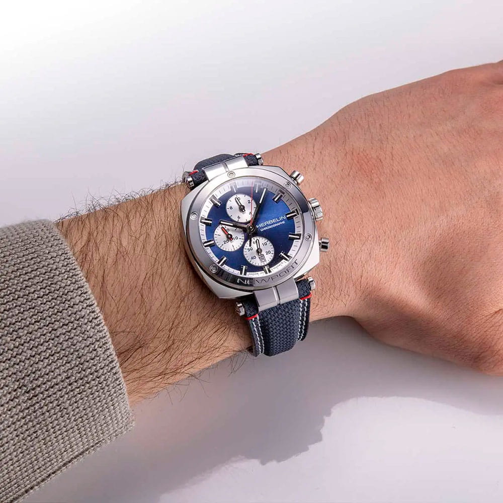 Мужские кварцевые часы-хронографХронографФункция позволяет измерять отрезки времени с особой точностью: часы, минуты, секунды. Верным признаком хронографа является наличие на циферблате 3 дополнительных окошек-счётчиков. Herbelin Newport Heritage 35664AP25 – отражающий идеальное сочетание современного дизайна, надёжности и функциональности. Элегантный облик станет превосходным завершением образа, наделив его индивидуальным характером. Корпус из нержавеющей стали серебристого цвета, диаметром 42 мм, идеально сбалансирован и элегантен. Сапфировое стеклоСапфировое стеклоПрочный и надёжный материал из кристалла сапфира синтетического происхождения, характеризующийся особой твёрдостью и устойчивостью к царапинам и повреждениям. защищает циферблат от царапин и устойчивое к механическим повреждениям. Стальной безельБезельВнешний ободок, закрепляющий стекло. В спортивных часах так называется поворотное кольцо с делениями на циферблате, выполняет роль таймера – замеряет отрезки времени на шкале. Неподвижный безель – элемент декора. Однонаправленно вращающийся безель на дайверских часах позволяет фиксировать моменты погружения и выныривания на поверхность. украшен винтами. Окошко даты находится в положении 6 часов. Стрелки и метки с люминесцентным покрытиемЛюминесцентное покрытиеПозволяет считывать показания времени в темноте. Производители наносят на стрелки, часовые индексы, безель или поверхность циферблата светонакопительный состав, дающий холодное свечение.. Тканевый ремешок на стандартной застежке обеспечивает комфортное ношение. Водозащита 100 метров позволит плавать, нырять и заниматься другими водными видами спорта. Эта модель – отличный выбор для тех, кто ищет сочетание стиля, качества и функциональности. Часы станут не только полезным аксессуаром, но и выразительным элементом вашего имиджа.