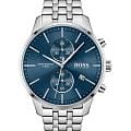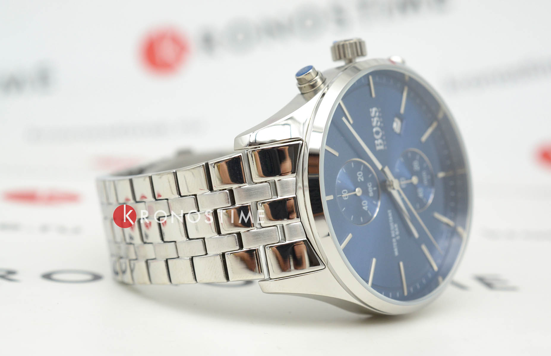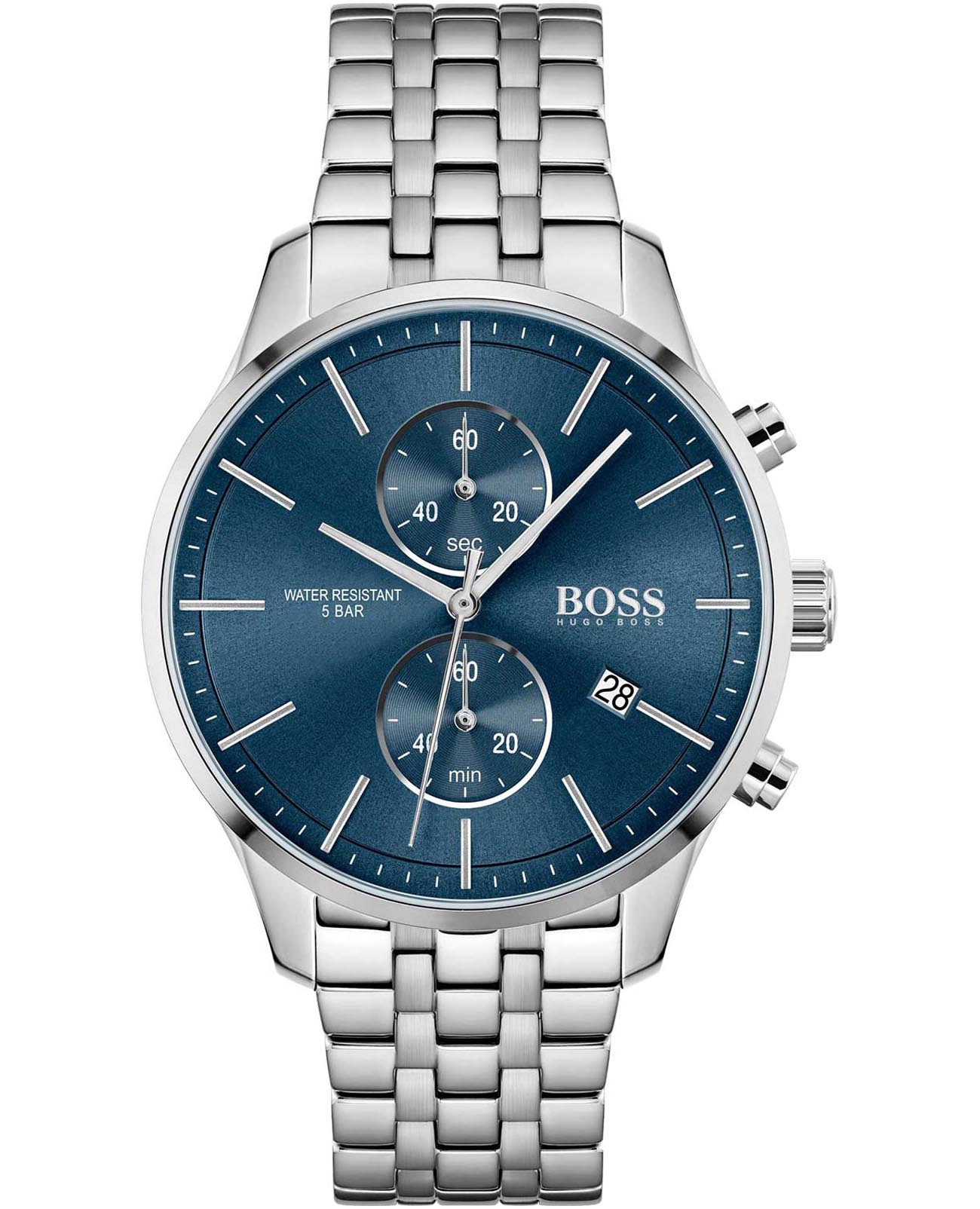 Мужские часы Hugo Boss Associate HB1513839 представлены в круглом 42-мм корпусе из нержавеющей стали 316L, оснащены кварцевым механизмом с функцией хронографаХронографФункция позволяет измерять отрезки времени с особой точностью: часы, минуты, секунды. Верным признаком хронографа является наличие на циферблате 3 дополнительных окошек-счётчиков. и секундомеромСекундомерСекундоме́р — прибор, способный измерять интервалы времени с точностью до долей секунды., а также окошком даты на позиции 4 часа. Синий циферблат со штриховыми метками и люминесцентными стрелками защищен устойчивым к царапинам минеральным стекломМинеральное стеклоМинеральное стекло представляет собой искусственно выращенный минерал кварца. Такое стекло отличается особой устойчивостью к повреждениям и царапинам. Уступает по некоторым качествам сапфировому стеклу., а стальной браслет дополнен раскладной застёжкойРаскладная застёжкаТакой тип застёжки используется только на браслетах из металла. Она никогда не раскрывается полностью, происходит разделение на 2 и более частей. Раскладывающая застёжка снизит вероятность потери часов к минимуму. для удобной регулировки. Водонепроницаемость 50 метров (5 ATM) обеспечивает защиту от брызг воды и дождя.
