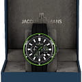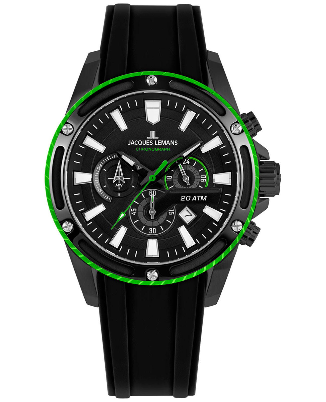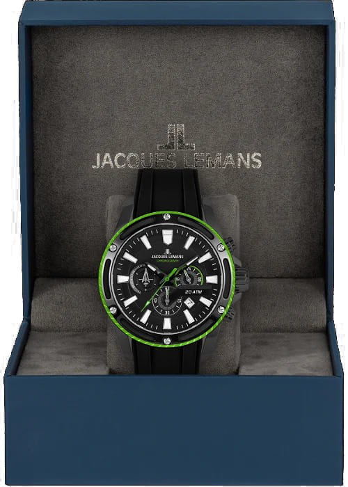 Мужские часы Jacques Lemans Liverpool 1-2141C с минеральным стекломМинеральное стеклоМинеральное стекло представляет собой искусственно выращенный минерал кварца. Такое стекло отличается особой устойчивостью к повреждениям и царапинам. Уступает по некоторым качествам сапфировому стеклу., кварцевый механизм с высокой точностью. Часы- хронографХронографФункция позволяет измерять отрезки времени с особой точностью: часы, минуты, секунды. Верным признаком хронографа является наличие на циферблате 3 дополнительных окошек-счётчиков. с секундомеромСекундомерСекундоме́р — прибор, способный измерять интервалы времени с точностью до долей секунды. представляют собой стильный аксессуар, отражающий идеальное сочетание современного дизайна, надёжности и функциональности. Корпус и безельБезельВнешний ободок, закрепляющий стекло. В спортивных часах так называется поворотное кольцо с делениями на циферблате, выполняет роль таймера – замеряет отрезки времени на шкале. Неподвижный безель – элемент декора. Однонаправленно вращающийся безель на дайверских часах позволяет фиксировать моменты погружения и выныривания на поверхность. из нержавеющей стали с PVDPVDУльтратонкое покрытие наносится в технике вакуумного напыления, сочетает в себе нитрид титана особой прочности со слоем золота или оксида хрома. Несёт в себе декоративную или защитную функцию. покрытием. БезельБезельВнешний ободок, закрепляющий стекло. В спортивных часах так называется поворотное кольцо с делениями на циферблате, выполняет роль таймера – замеряет отрезки времени на шкале. Неподвижный безель – элемент декора. Однонаправленно вращающийся безель на дайверских часах позволяет фиксировать моменты погружения и выныривания на поверхность. с декоративными прорезями крепится к корпусу шестью винтами. На циферблате расположены три дополнительных индикатора и окошко даты. Стрелки и метки с люминесцентным покрытиемЛюминесцентное покрытиеПозволяет считывать показания времени в темноте. Производители наносят на стрелки, часовые индексы, безель или поверхность циферблата светонакопительный состав, дающий холодное свечение.. Класс водозащиты: 200 метров, позволит плавать, нырять и заниматься другими водными видами спорта. Силиконовый ремешок на стандартной застёжке.