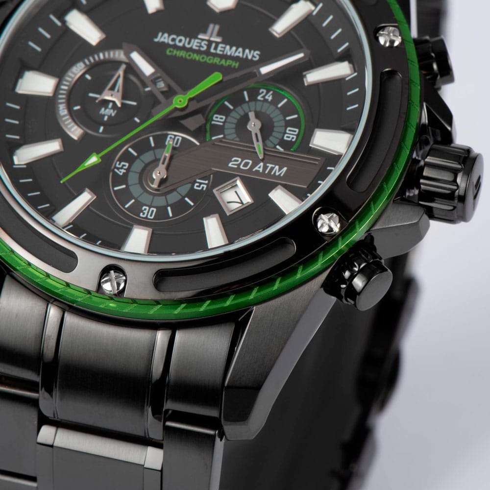 Мужские часы Jacques Lemans Liverpool 1-2141H с минеральным стекломМинеральное стеклоМинеральное стекло представляет собой искусственно выращенный минерал кварца. Такое стекло отличается особой устойчивостью к повреждениям и царапинам. Уступает по некоторым качествам сапфировому стеклу., кварцевый механизм с высокой точностью. Часы- хронографХронографФункция позволяет измерять отрезки времени с особой точностью: часы, минуты, секунды. Верным признаком хронографа является наличие на циферблате 3 дополнительных окошек-счётчиков. с секундомеромСекундомерСекундоме́р — прибор, способный измерять интервалы времени с точностью до долей секунды. представляют собой стильный аксессуар, отражающий идеальное сочетание современного дизайна, надёжности и функциональности. БезельБезельВнешний ободок, закрепляющий стекло. В спортивных часах так называется поворотное кольцо с делениями на циферблате, выполняет роль таймера – замеряет отрезки времени на шкале. Неподвижный безель – элемент декора. Однонаправленно вращающийся безель на дайверских часах позволяет фиксировать моменты погружения и выныривания на поверхность. из нержавеющей стали с PVDPVDУльтратонкое покрытие наносится в технике вакуумного напыления, сочетает в себе нитрид титана особой прочности со слоем золота или оксида хрома. Несёт в себе декоративную или защитную функцию. покрытием и с декоративными прорезями крепится к корпусу шестью винтами. На циферблате расположены три дополнительных индикатора и окошко даты. Стрелки и метки с люминесцентным покрытиемЛюминесцентное покрытиеПозволяет считывать показания времени в темноте. Производители наносят на стрелки, часовые индексы, безель или поверхность циферблата светонакопительный состав, дающий холодное свечение.. Класс водозащиты: 200 метров, позволит плавать, нырять и заниматься другими водными видами спорта.Корпус и браслет из нержавеющей стали с PVD-покрытиемPVDУльтратонкое покрытие наносится в технике вакуумного напыления, сочетает в себе нитрид титана особой прочности со слоем золота или оксида хрома. Несёт в себе декоративную или защитную функцию. на раскладной застёжкеРаскладная застёжкаТакой тип застёжки используется только на браслетах из металла. Она никогда не раскрывается полностью, происходит разделение на 2 и более частей. Раскладывающая застёжка снизит вероятность потери часов к минимуму..