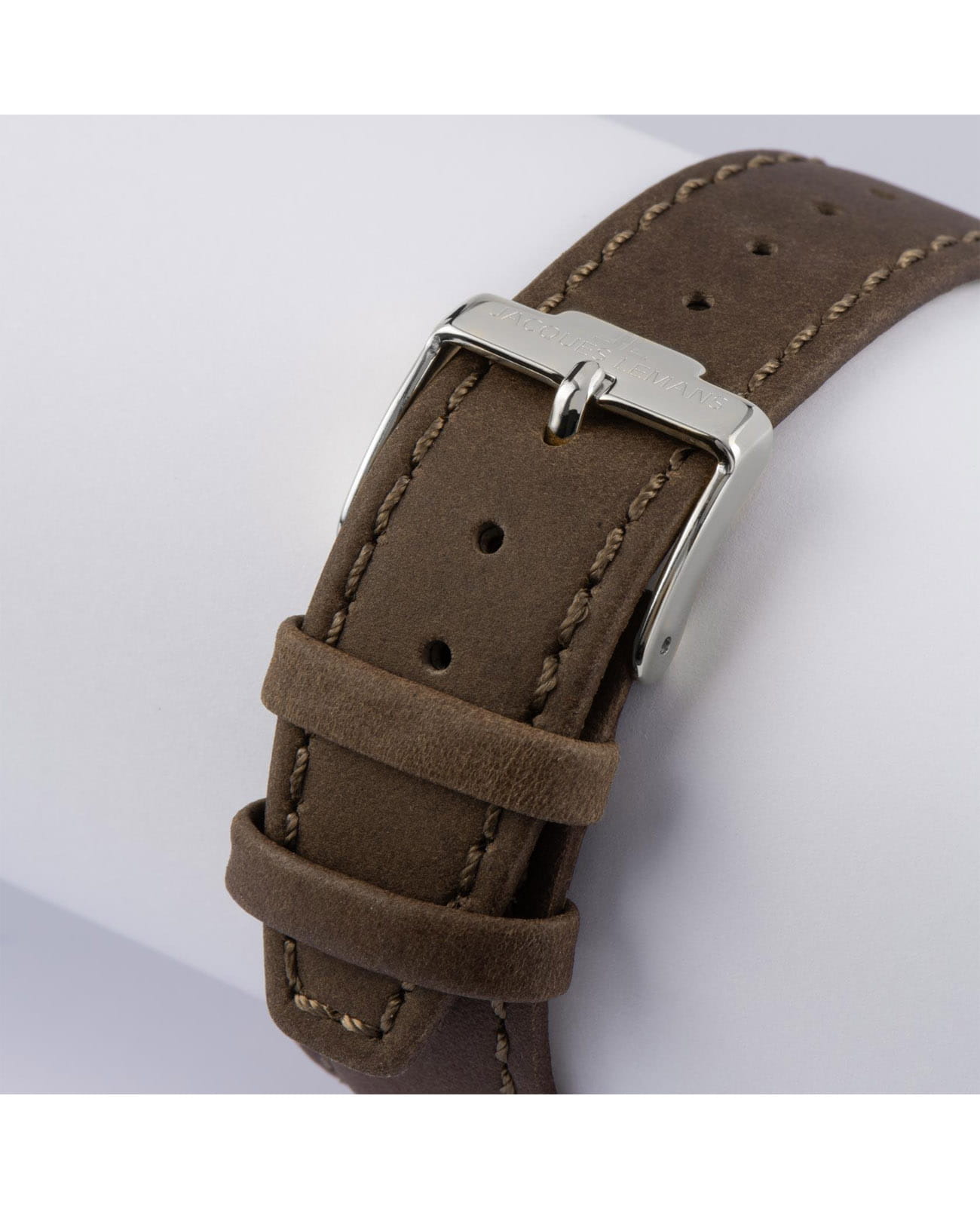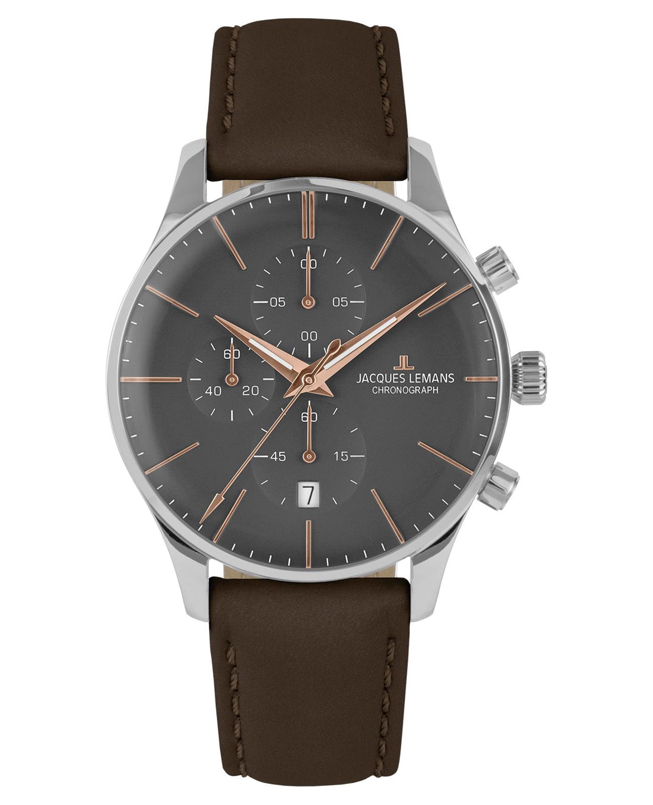 Мужские часы-хронографХронографФункция позволяет измерять отрезки времени с особой точностью: часы, минуты, секунды. Верным признаком хронографа является наличие на циферблате 3 дополнительных окошек-счётчиков. с секундомеромСекундомерСекундоме́р — прибор, способный измерять интервалы времени с точностью до долей секунды. Jacques Lemans Classic 1-2163E, кварцевый механизм с высокой точностью. Минеральное стеклоМинеральное стеклоМинеральное стекло представляет собой искусственно выращенный минерал кварца. Такое стекло отличается особой устойчивостью к повреждениям и царапинам. Уступает по некоторым качествам сапфировому стеклу. устойчивое к мелким механическим повреждениям. Корпус часов изготовлен из стали. Окошко даты находится в положении 6 часов. Стрелки с люминесцентным покрытиемЛюминесцентное покрытиеПозволяет считывать показания времени в темноте. Производители наносят на стрелки, часовые индексы, безель или поверхность циферблата светонакопительный состав, дающий холодное свечение.. Класс водозащиты: 50 метров, позволит плавать, нырять и заниматься другими водными видами спорта. Кожаный ремешок на стандартной застёжке.