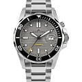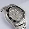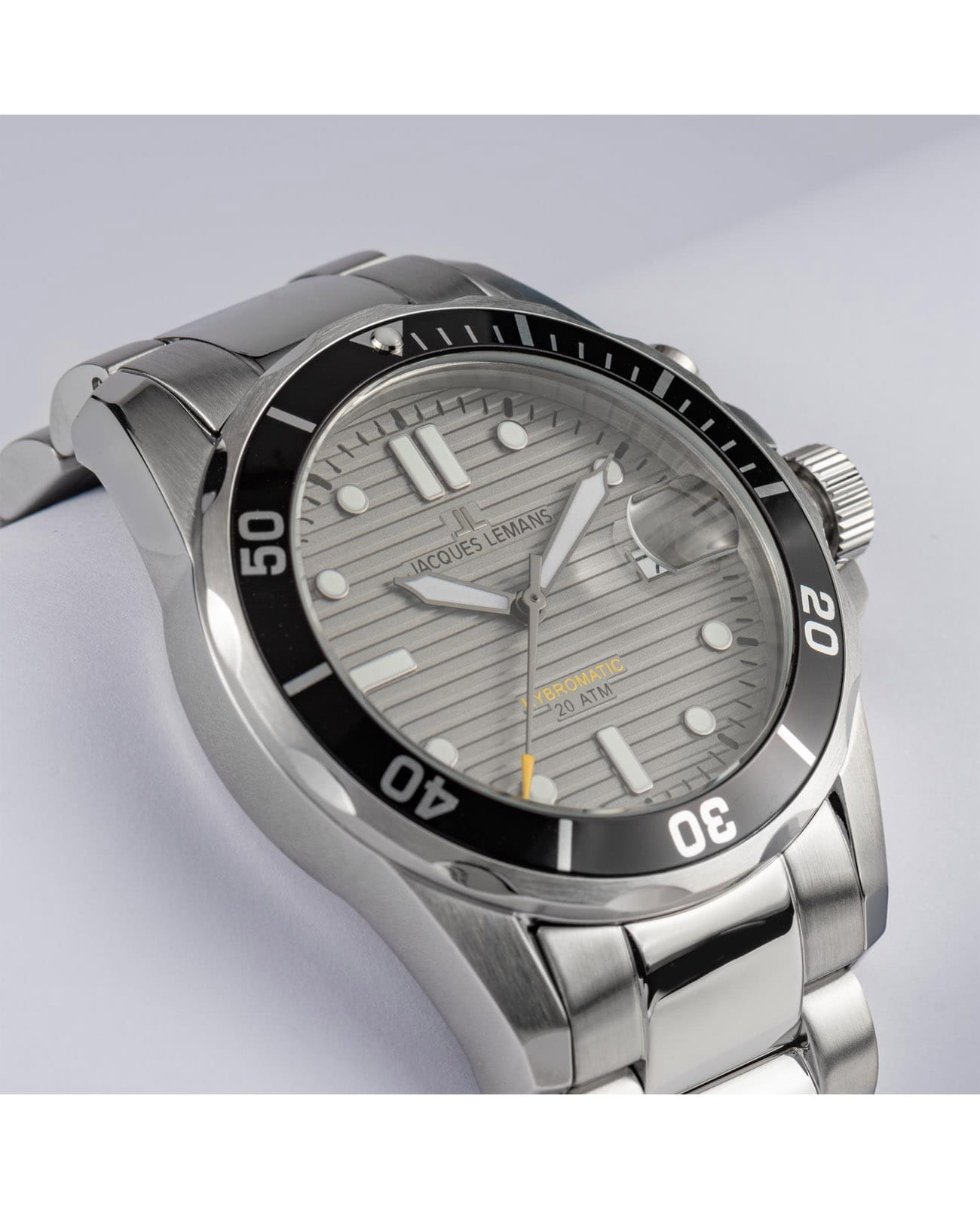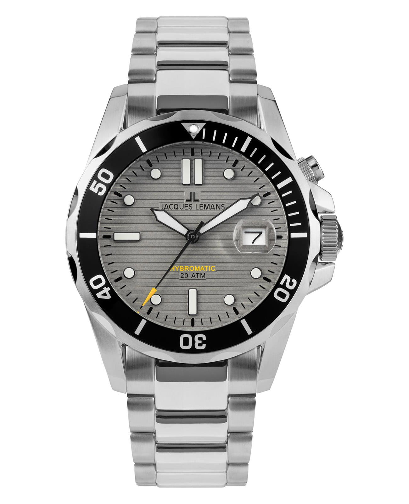 Мужские часы Jacques Lemans Hybromatic 1-2170H с минеральным стекломМинеральное стеклоМинеральное стекло представляет собой искусственно выращенный минерал кварца. Такое стекло отличается особой устойчивостью к повреждениям и царапинам. Уступает по некоторым качествам сапфировому стеклу., гибрид кварца и механики с автоподзаводом. Корпус выполенен из нержавеющей стали. Вращающийся безельБезельВнешний ободок, закрепляющий стекло. В спортивных часах так называется поворотное кольцо с делениями на циферблате, выполняет роль таймера – замеряет отрезки времени на шкале. Неподвижный безель – элемент декора. Однонаправленно вращающийся безель на дайверских часах позволяет фиксировать моменты погружения и выныривания на поверхность. из нержавеющей стали с PVDPVDУльтратонкое покрытие наносится в технике вакуумного напыления, сочетает в себе нитрид титана особой прочности со слоем золота или оксида хрома. Несёт в себе декоративную или защитную функцию. покрытием. Стрелки и метки с люминесцентным покрытиемЛюминесцентное покрытиеПозволяет считывать показания времени в темноте. Производители наносят на стрелки, часовые индексы, безель или поверхность циферблата светонакопительный состав, дающий холодное свечение.. Окошко даты находится в положении 3 часов. Класс водозащиты: 200 метров, позволит плавать, нырять и заниматься другими водными видами спорта. Стальной браслет на раскладной застёжкеРаскладная застёжкаТакой тип застёжки используется только на браслетах из металла. Она никогда не раскрывается полностью, происходит разделение на 2 и более частей. Раскладывающая застёжка снизит вероятность потери часов к минимуму..