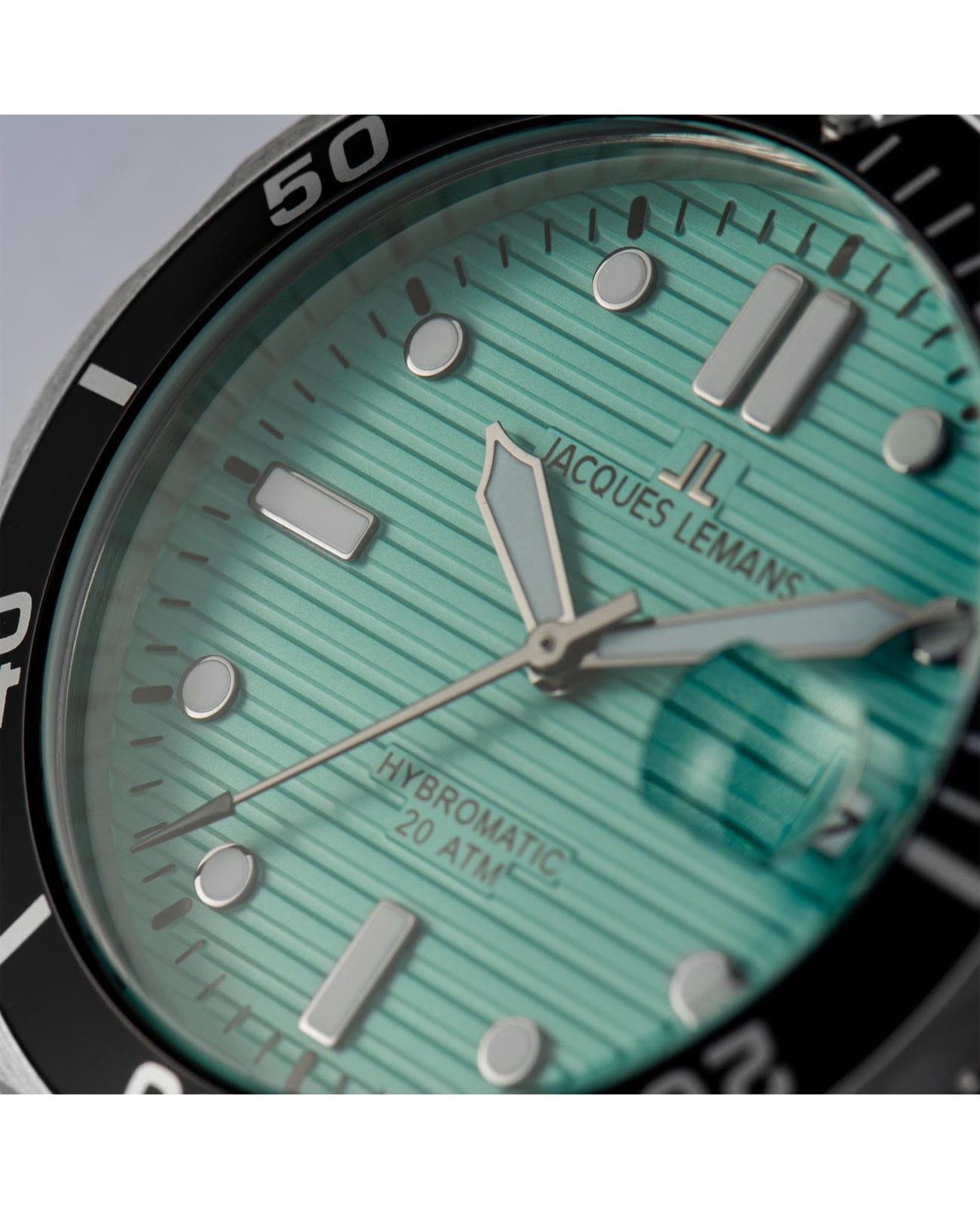 Мужские часы Jacques Lemans Hybromatic 1-2170i с минеральным стекломМинеральное стеклоМинеральное стекло представляет собой искусственно выращенный минерал кварца. Такое стекло отличается особой устойчивостью к повреждениям и царапинам. Уступает по некоторым качествам сапфировому стеклу., гибрид кварца и механики с автоподзаводом. Корпус выполенен из нержавеющей стали. Вращающийся безельБезельВнешний ободок, закрепляющий стекло. В спортивных часах так называется поворотное кольцо с делениями на циферблате, выполняет роль таймера – замеряет отрезки времени на шкале. Неподвижный безель – элемент декора. Однонаправленно вращающийся безель на дайверских часах позволяет фиксировать моменты погружения и выныривания на поверхность. из нержавеющей стали с PVDPVDУльтратонкое покрытие наносится в технике вакуумного напыления, сочетает в себе нитрид титана особой прочности со слоем золота или оксида хрома. Несёт в себе декоративную или защитную функцию. покрытием. Стрелки и метки с люминесцентным покрытиемЛюминесцентное покрытиеПозволяет считывать показания времени в темноте. Производители наносят на стрелки, часовые индексы, безель или поверхность циферблата светонакопительный состав, дающий холодное свечение.. Окошко даты находится в положении 3 часов. Класс водозащиты: 200 метров, позволит плавать, нырять и заниматься другими водными видами спорта. Стальной браслет на раскладной застёжкеРаскладная застёжкаТакой тип застёжки используется только на браслетах из металла. Она никогда не раскрывается полностью, происходит разделение на 2 и более частей. Раскладывающая застёжка снизит вероятность потери часов к минимуму..