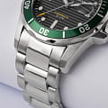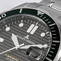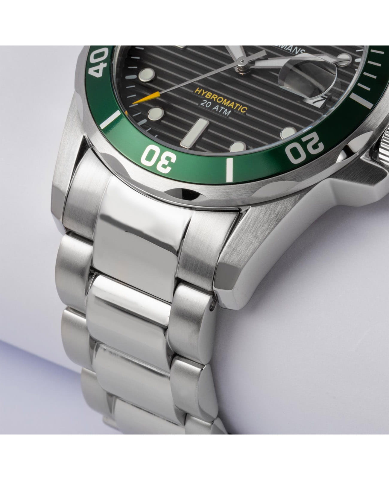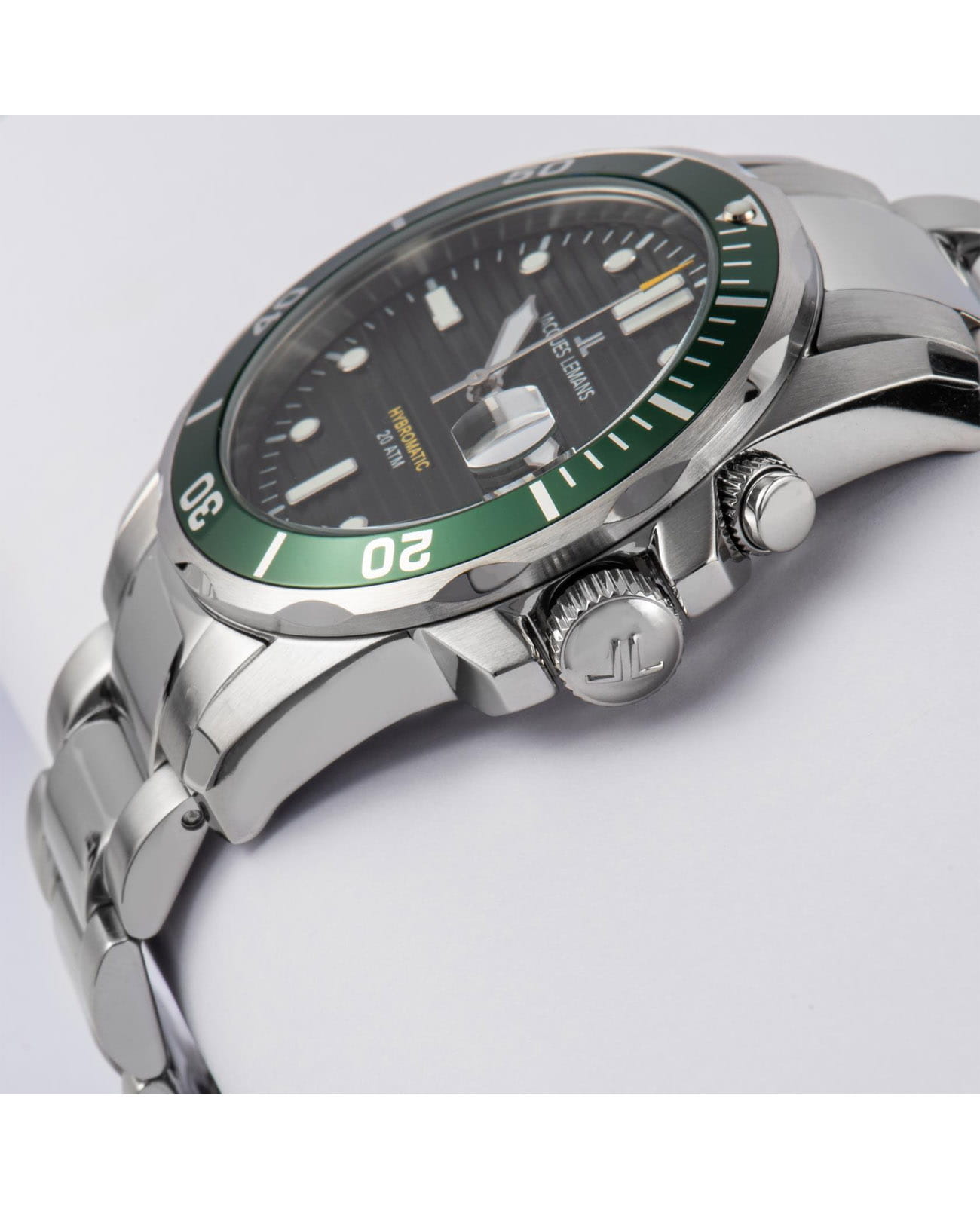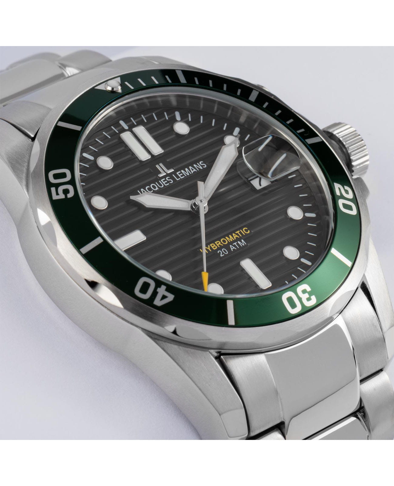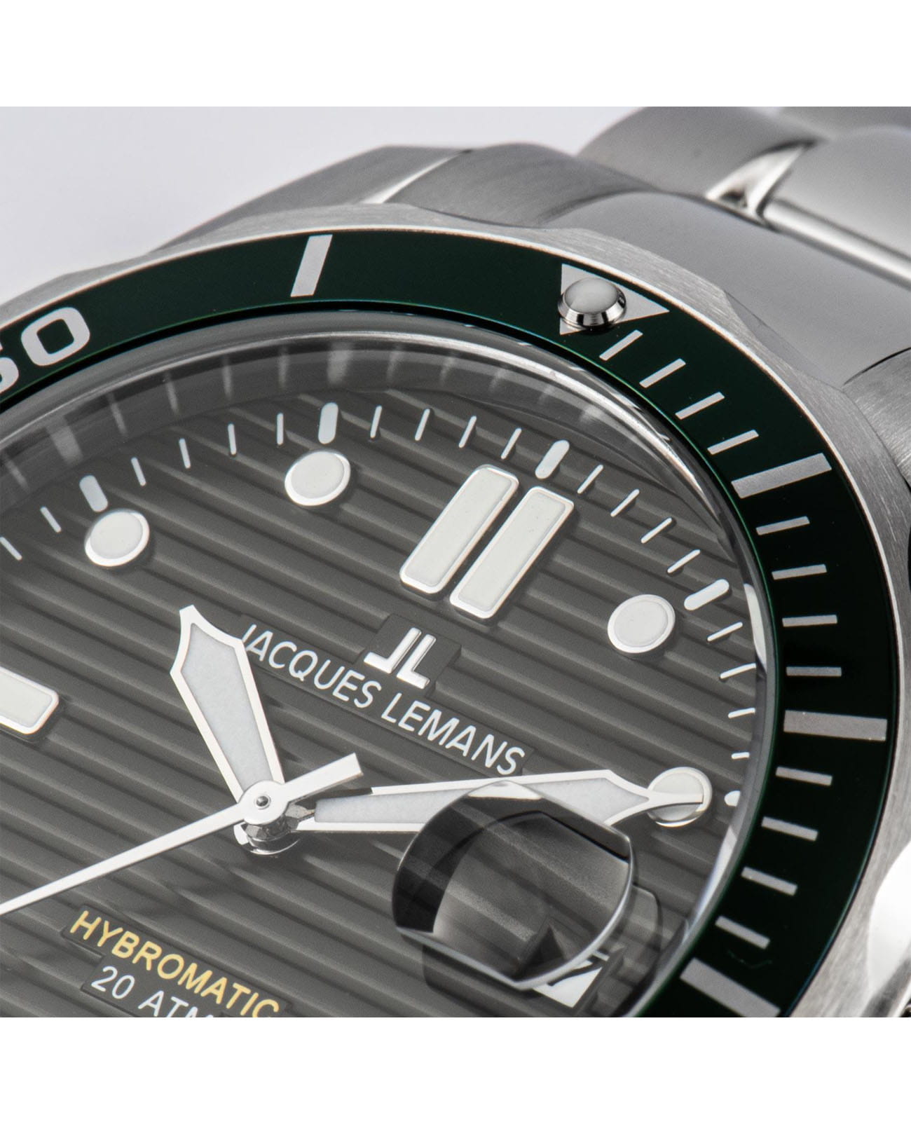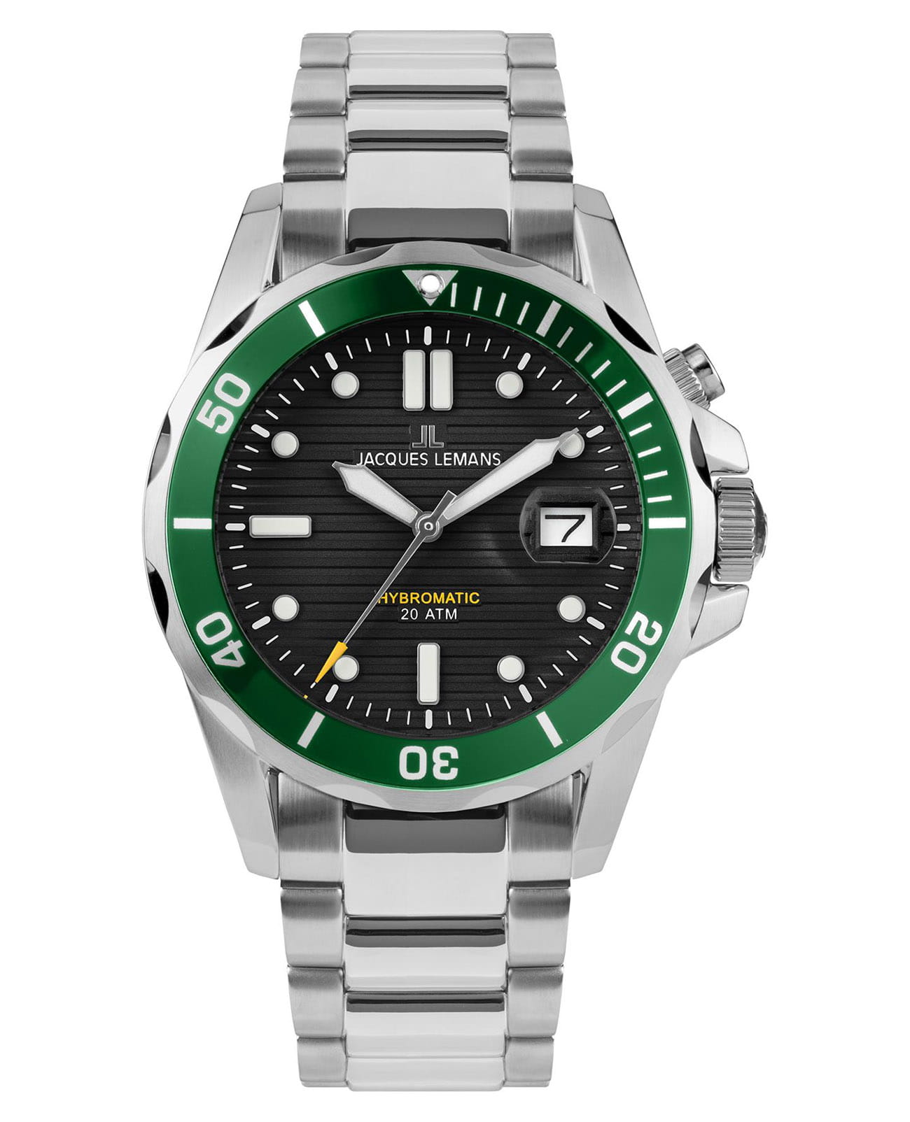 Мужские часы Jacques Lemans Hybromatic 1-2170K с минеральным стекломМинеральное стеклоМинеральное стекло представляет собой искусственно выращенный минерал кварца. Такое стекло отличается особой устойчивостью к повреждениям и царапинам. Уступает по некоторым качествам сапфировому стеклу., гибрид кварца и механики с автоподзаводом. Корпус выполенен из нержавеющей стали. Вращающийся безельБезельВнешний ободок, закрепляющий стекло. В спортивных часах так называется поворотное кольцо с делениями на циферблате, выполняет роль таймера – замеряет отрезки времени на шкале. Неподвижный безель – элемент декора. Однонаправленно вращающийся безель на дайверских часах позволяет фиксировать моменты погружения и выныривания на поверхность. из нержавеющей стали с PVDPVDУльтратонкое покрытие наносится в технике вакуумного напыления, сочетает в себе нитрид титана особой прочности со слоем золота или оксида хрома. Несёт в себе декоративную или защитную функцию. покрытием. Стрелки и метки с люминесцентным покрытиемЛюминесцентное покрытиеПозволяет считывать показания времени в темноте. Производители наносят на стрелки, часовые индексы, безель или поверхность циферблата светонакопительный состав, дающий холодное свечение.. Окошко даты находится в положении 3 часов. Класс водозащиты: 200 метров, позволит плавать, нырять и заниматься другими водными видами спорта. Стальной браслет на раскладной застёжкеРаскладная застёжкаТакой тип застёжки используется только на браслетах из металла. Она никогда не раскрывается полностью, происходит разделение на 2 и более частей. Раскладывающая застёжка снизит вероятность потери часов к минимуму..