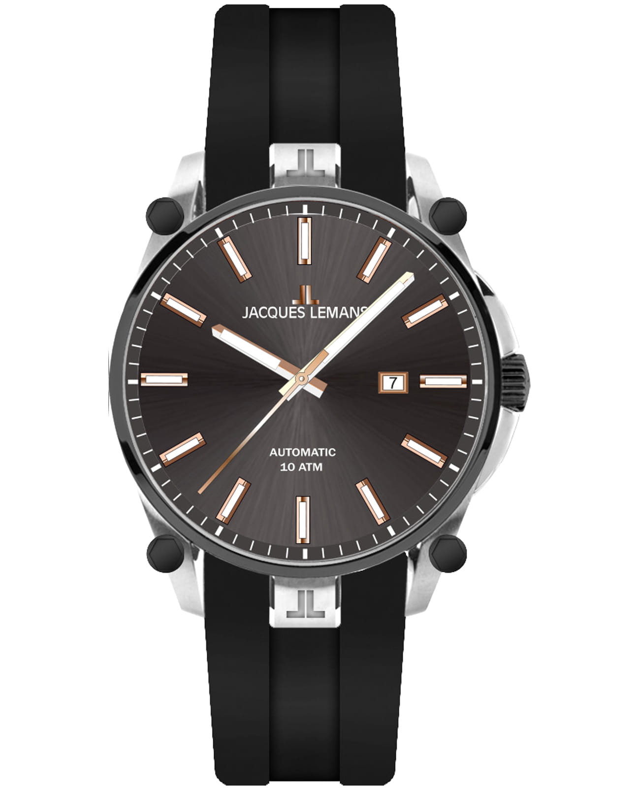 Мужские механические часы с автоподзаводом Jacques Lemans 1-2203A – лаконичная красота и изысканная элегантность. Оригинальная модель с классическим оформлением станет превосходным завершением образа, наделив его индивидуальным характером. Корпус выполнен из нержавеющей стали, диаметром 44 мм, что обеспечивает долговечность и утончённый внешний вид. Минеральное стеклоМинеральное стеклоМинеральное стекло представляет собой искусственно выращенный минерал кварца. Такое стекло отличается особой устойчивостью к повреждениям и царапинам. Уступает по некоторым качествам сапфировому стеклу. с сапфировым напылением защищает циферблат от царапин. Силиконовый ремешок на стандартной застёжке обеспечивает комфортное ношение. Неподвижный безельБезельВнешний ободок, закрепляющий стекло. В спортивных часах так называется поворотное кольцо с делениями на циферблате, выполняет роль таймера – замеряет отрезки времени на шкале. Неподвижный безель – элемент декора. Однонаправленно вращающийся безель на дайверских часах позволяет фиксировать моменты погружения и выныривания на поверхность. с PVD-покрытиемPVDУльтратонкое покрытие наносится в технике вакуумного напыления, сочетает в себе нитрид титана особой прочности со слоем золота или оксида хрома. Несёт в себе декоративную или защитную функцию. черного цвета. Водозащита 100 метров позволит плавать, нырять и заниматься другими водными видами спорта. Стрелки и метки с люминесцентным покрытиемЛюминесцентное покрытиеПозволяет считывать показания времени в темноте. Производители наносят на стрелки, часовые индексы, безель или поверхность циферблата светонакопительный состав, дающий холодное свечение. позволяющие легко определять время даже в темноте. Окошко даты находится в положении 3 часа. Рифленая заводная головка с защитой. Это аксессуар для мужчины, который ценит классический стиль и функциональность.