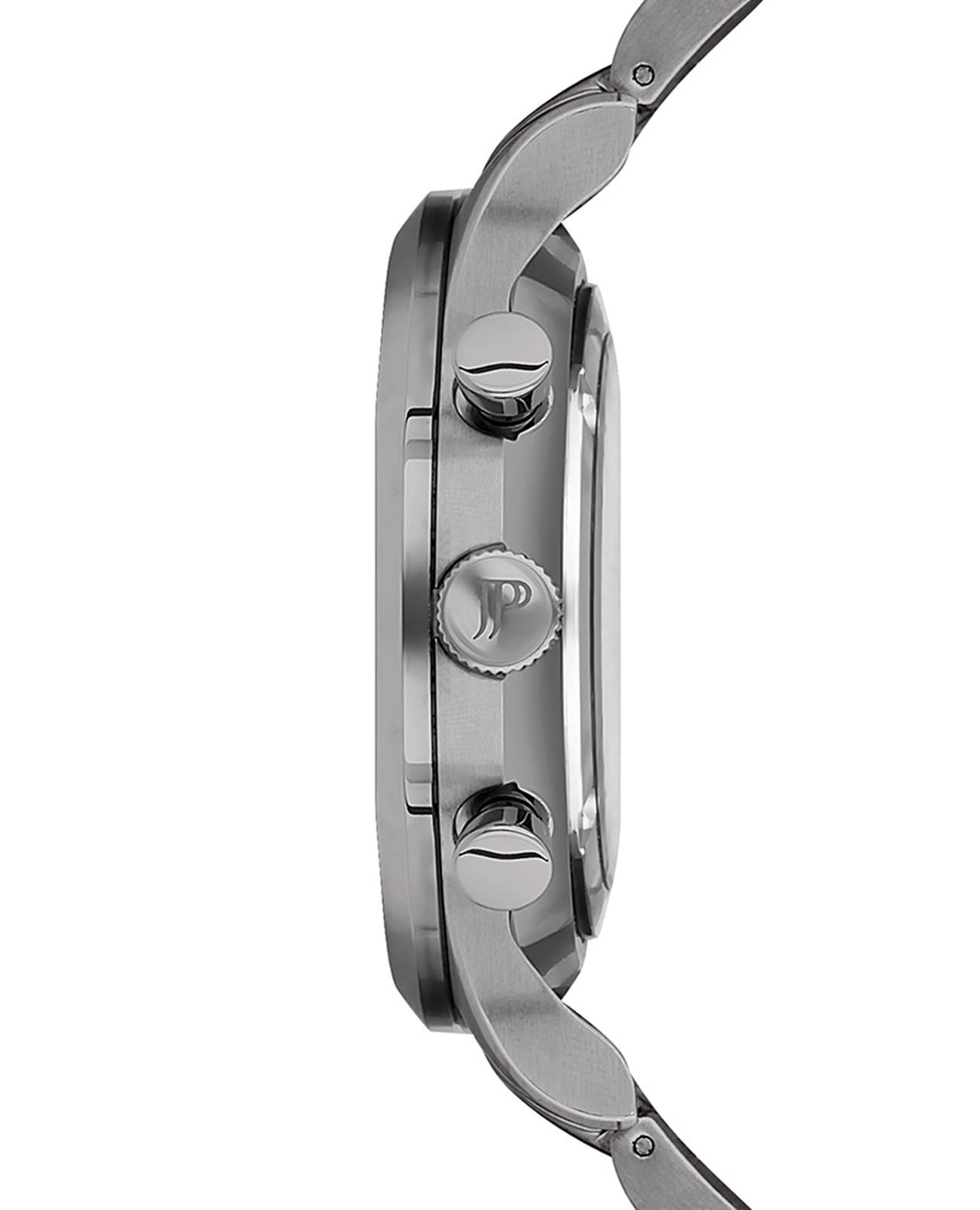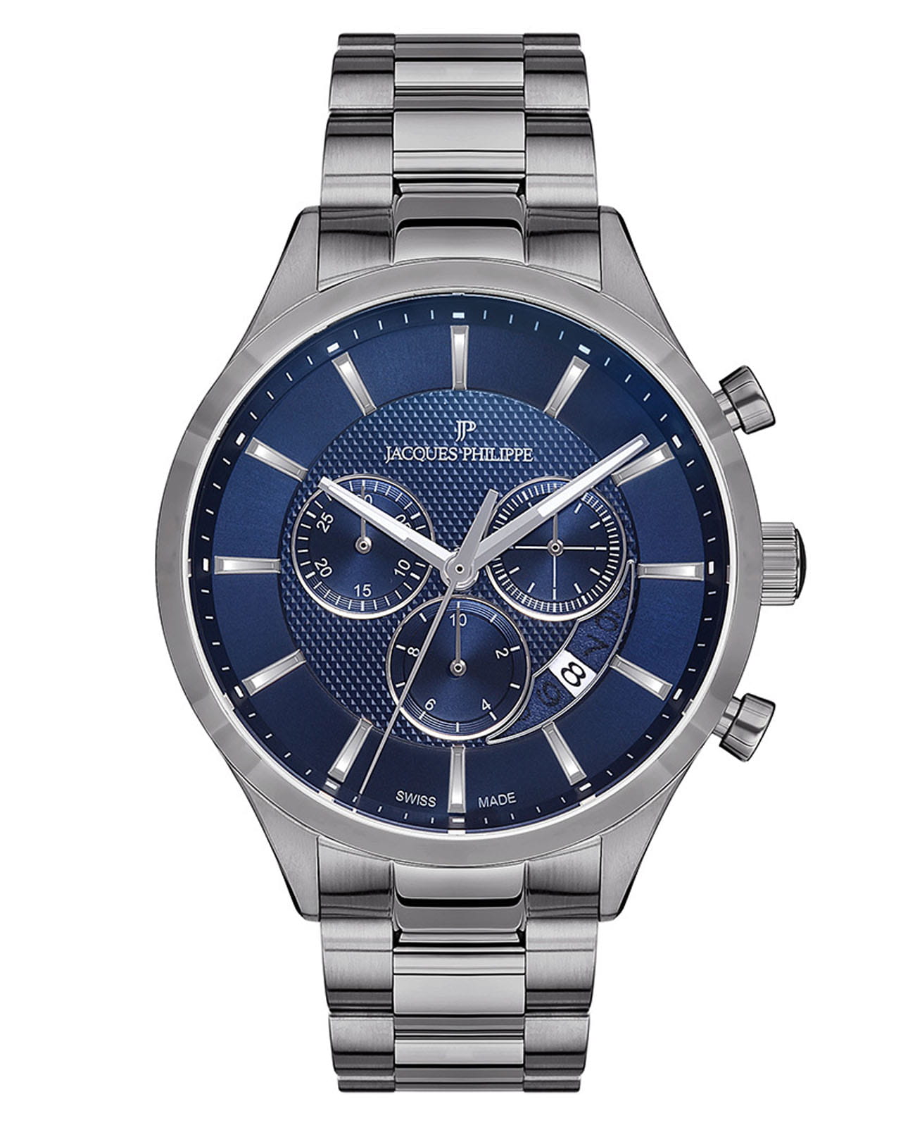 Швейцарские мужские часы-хронографХронографФункция позволяет измерять отрезки времени с особой точностью: часы, минуты, секунды. Верным признаком хронографа является наличие на циферблате 3 дополнительных окошек-счётчиков. с секундомеромСекундомерСекундоме́р — прибор, способный измерять интервалы времени с точностью до долей секунды. Jacques Philippe Gallant JPQGC038337, кварцевый механизм с высокой точностью. Сапфировое стеклоСапфировое стеклоПрочный и надёжный материал из кристалла сапфира синтетического происхождения, характеризующийся особой твёрдостью и устойчивостью к царапинам и повреждениям. устойчивое к появлению царапин, обладающее высокой прозрачностью. Корпус часов изготовлен из нержавеющей стали. На циферблате три дополнительных индикатора. Стрелки с люминесцентным покрытиемЛюминесцентное покрытиеПозволяет считывать показания времени в темноте. Производители наносят на стрелки, часовые индексы, безель или поверхность циферблата светонакопительный состав, дающий холодное свечение.. Окошко даты находится между 4 и 5 часами. Класс водозащиты: 50 метров, позволит защитить корпус от случайных брызг или капель дождя. Стальной браслет на застёжке «бабочка» с кнопкамиЗастёжка "бабочка"Такой вид застёжки дополняется предохранителями, помогающими избежать случайного раскрытия браслета. Обладают изящным исполнением. .