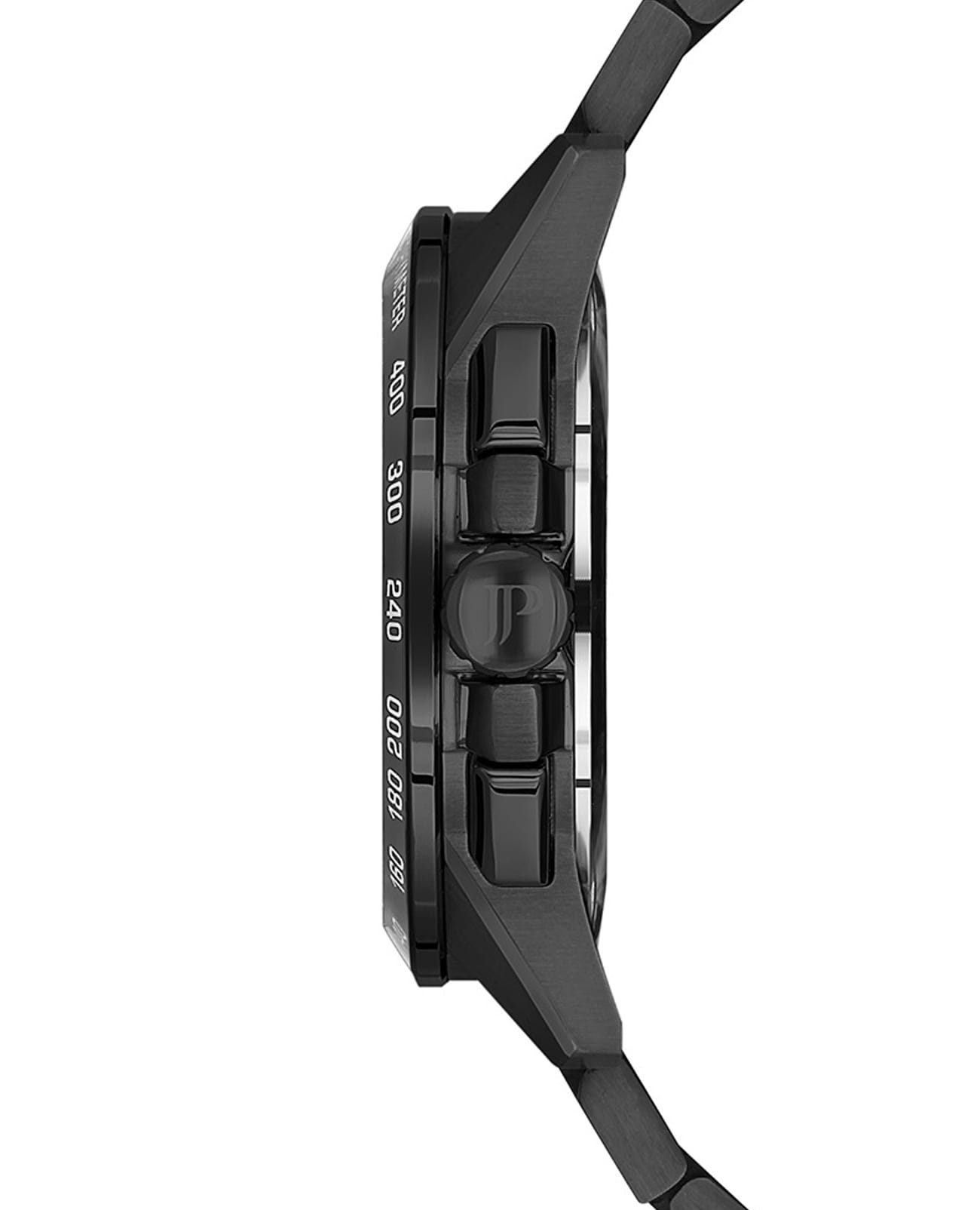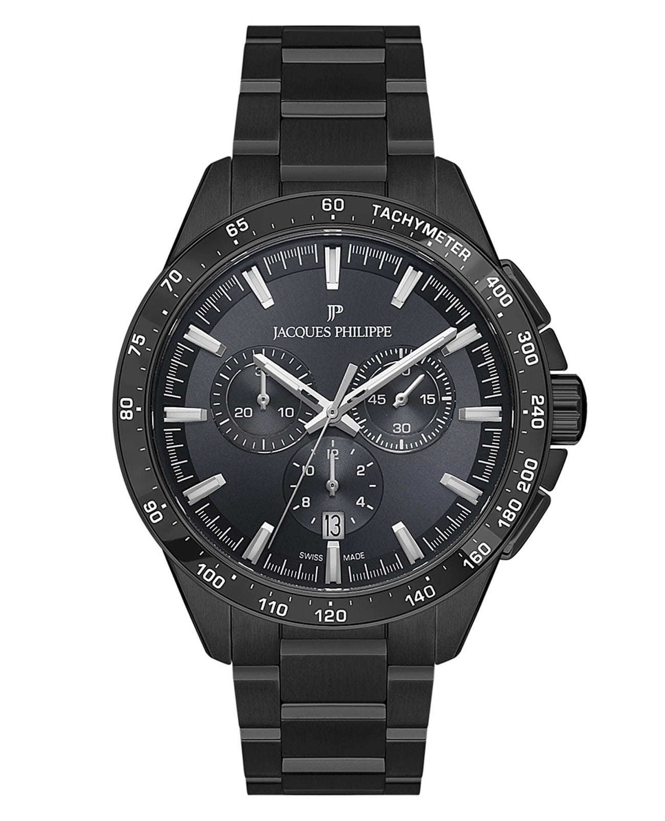 Швейцарские мужские часы-хронографХронографФункция позволяет измерять отрезки времени с особой точностью: часы, минуты, секунды. Верным признаком хронографа является наличие на циферблате 3 дополнительных окошек-счётчиков. с секундомеромСекундомерСекундоме́р — прибор, способный измерять интервалы времени с точностью до долей секунды. Jacques Philippe Magnificus JPQGC254341, кварцевый механизм с высокой точностью. Сапфировое стеклоСапфировое стеклоПрочный и надёжный материал из кристалла сапфира синтетического происхождения, характеризующийся особой твёрдостью и устойчивостью к царапинам и повреждениям. устойчивое к появлению царапин, обладающее высокой прозрачностью. Корпус часов изготовлен из нержавеющей стали с IP-покрытиемIP-покрытиеМетод ионного напыления. Демонстрирует повышенную устойчивость к истиранию, окислению и химическим веществам. Под воздействием высокого давления и температуры около 1500°C молекулы металла надёжно соединяются с частицами корпуса часов.. БезельБезельВнешний ободок, закрепляющий стекло. В спортивных часах так называется поворотное кольцо с делениями на циферблате, выполняет роль таймера – замеряет отрезки времени на шкале. Неподвижный безель – элемент декора. Однонаправленно вращающийся безель на дайверских часах позволяет фиксировать моменты погружения и выныривания на поверхность. с тахиметромТахиметрРазмеченная шкала, располагается на ободке или безеле часов. Тахиметр позволяет рассчитать скорость на определённом участке пути, расстояние измеряется в километрах или милях.. На циферблате три дополнительных индикатора. Окошко даты находится в положении 6 часов. Стрелки с люминесцентным покрытиемЛюминесцентное покрытиеПозволяет считывать показания времени в темноте. Производители наносят на стрелки, часовые индексы, безель или поверхность циферблата светонакопительный состав, дающий холодное свечение.. Класс водозащиты: 100 метров, позволит плавать, нырять и заниматься другими водными видами спорта. Стальной браслет с IP-покрытиемIP-покрытиеМетод ионного напыления. Демонстрирует повышенную устойчивость к истиранию, окислению и химическим веществам. Под воздействием высокого давления и температуры около 1500°C молекулы металла надёжно соединяются с частицами корпуса часов. на застёжке «бабочка» с кнопкамиЗастёжка "бабочка"Такой вид застёжки дополняется предохранителями, помогающими избежать случайного раскрытия браслета. Обладают изящным исполнением. .
