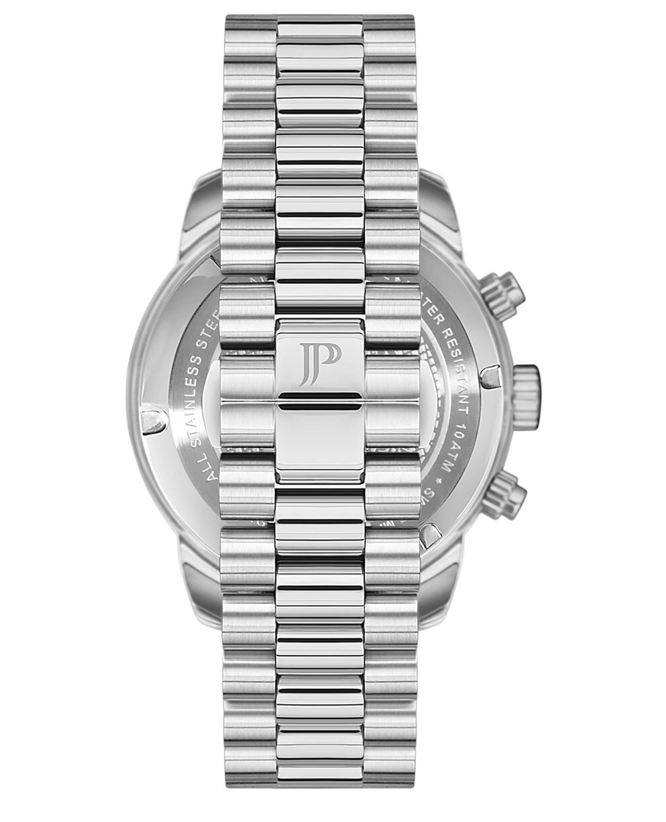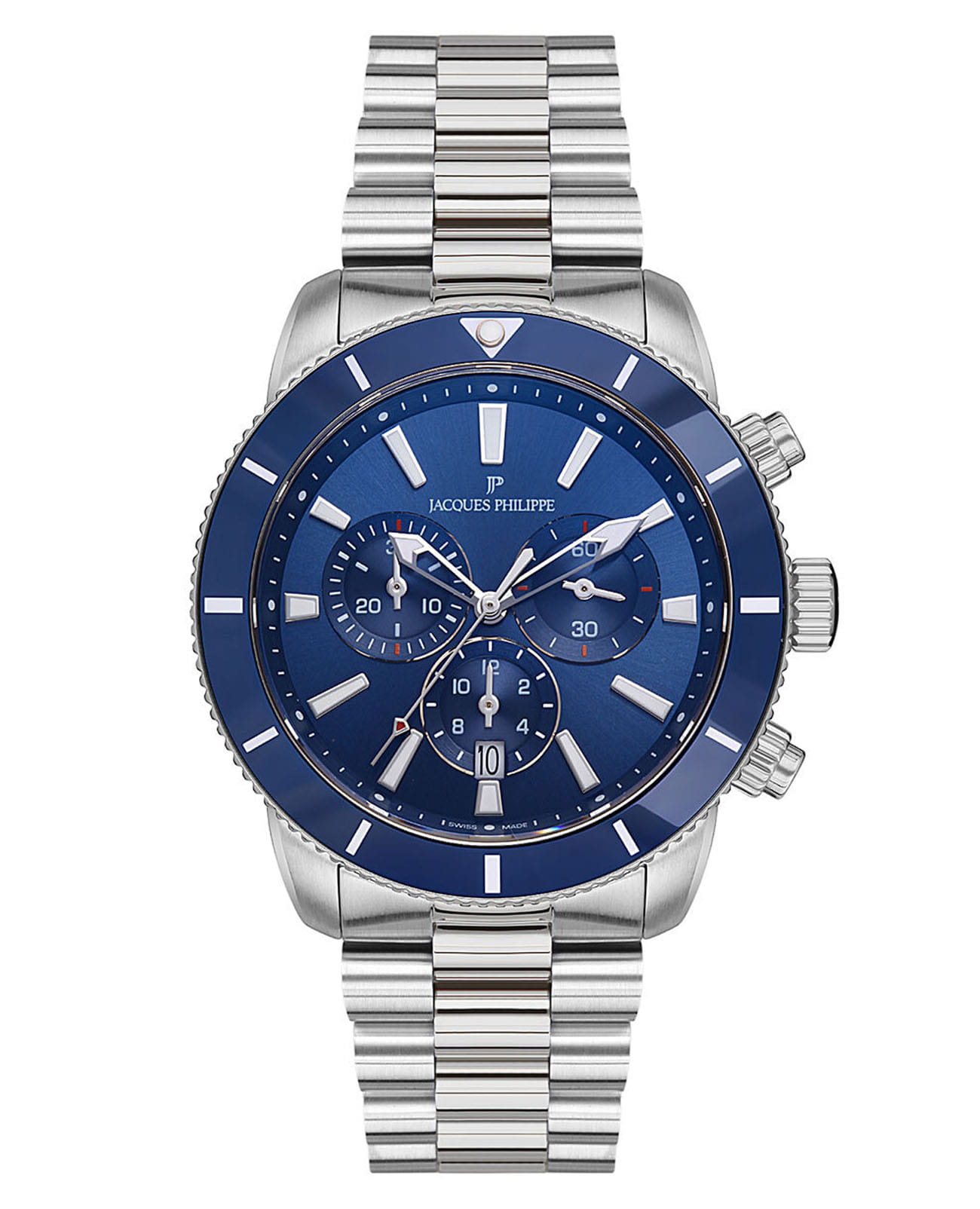 Швейцарские мужские часы-хронографХронографФункция позволяет измерять отрезки времени с особой точностью: часы, минуты, секунды. Верным признаком хронографа является наличие на циферблате 3 дополнительных окошек-счётчиков. с секундомеромСекундомерСекундоме́р — прибор, способный измерять интервалы времени с точностью до долей секунды. Jacques Philippe Victory JPQGC271336, кварцевый механизм с высокой точностью. Сапфировое стеклоСапфировое стеклоПрочный и надёжный материал из кристалла сапфира синтетического происхождения, характеризующийся особой твёрдостью и устойчивостью к царапинам и повреждениям. устойчивое к появлению царапин, обладающее высокой прозрачностью. Корпус часов изготовлен из нержавеющей стали. БезельБезельВнешний ободок, закрепляющий стекло. В спортивных часах так называется поворотное кольцо с делениями на циферблате, выполняет роль таймера – замеряет отрезки времени на шкале. Неподвижный безель – элемент декора. Однонаправленно вращающийся безель на дайверских часах позволяет фиксировать моменты погружения и выныривания на поверхность. из стали с IP-покрытиемIP-покрытиеМетод ионного напыления. Демонстрирует повышенную устойчивость к истиранию, окислению и химическим веществам. Под воздействием высокого давления и температуры около 1500°C молекулы металла надёжно соединяются с частицами корпуса часов.. На циферблате три дополнительных индикатора. Окошко даты находится в положении 6 часов. Стрелки с люминесцентным покрытиемЛюминесцентное покрытиеПозволяет считывать показания времени в темноте. Производители наносят на стрелки, часовые индексы, безель или поверхность циферблата светонакопительный состав, дающий холодное свечение.. Класс водозащиты: 100 метров, позволит плавать, нырять и заниматься другими водными видами спорта. Стальной браслет на застёжке «бабочка» с кнопкамиЗастёжка "бабочка"Такой вид застёжки дополняется предохранителями, помогающими избежать случайного раскрытия браслета. Обладают изящным исполнением. .