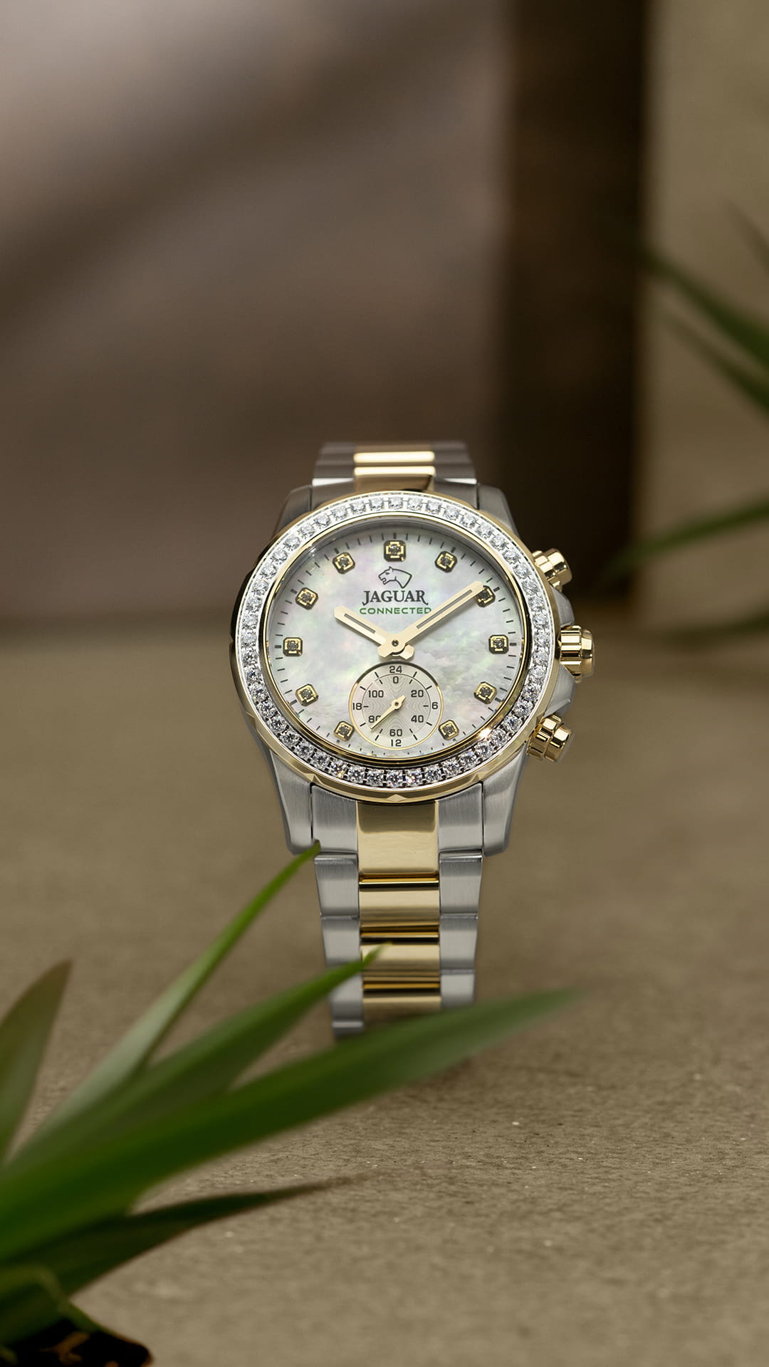 Женские швейцарские часы Jaguar Connected Lady J981/1. Сапфировое стеклоСапфировое стеклоПрочный и надёжный материал из кристалла сапфира синтетического происхождения, характеризующийся особой твёрдостью и устойчивостью к царапинам и повреждениям. устойчивое к мелким механическим повреждениям. Корпус часов изготовлен из нержавеющей стали. Стрелки и метки с люминесцентным покрытиемЛюминесцентное покрытиеПозволяет считывать показания времени в темноте. Производители наносят на стрелки, часовые индексы, безель или поверхность циферблата светонакопительный состав, дающий холодное свечение.. Класс водозащиты: 50 метров, позволит защитить корпус от случайных брызг или капель дождя. БезельБезельВнешний ободок, закрепляющий стекло. В спортивных часах так называется поворотное кольцо с делениями на циферблате, выполняет роль таймера – замеряет отрезки времени на шкале. Неподвижный безель – элемент декора. Однонаправленно вращающийся безель на дайверских часах позволяет фиксировать моменты погружения и выныривания на поверхность. с PVD-покрытиемPVDУльтратонкое покрытие наносится в технике вакуумного напыления, сочетает в себе нитрид титана особой прочности со слоем золота или оксида хрома. Несёт в себе декоративную или защитную функцию. и циферблат инкрустированы цирконием. Стальной браслет с частичным PVD-покрытиемPVDУльтратонкое покрытие наносится в технике вакуумного напыления, сочетает в себе нитрид титана особой прочности со слоем золота или оксида хрома. Несёт в себе декоративную или защитную функцию. на раскладной застёжкеРаскладная застёжкаТакой тип застёжки используется только на браслетах из металла. Она никогда не раскрывается полностью, происходит разделение на 2 и более частей. Раскладывающая застёжка снизит вероятность потери часов к минимуму.. За точный ход работы часов, из коллекции Connected, отвечает кварцевый гибридный механизм швейцарского производства со Смарт-Модулем. Данный тип механизма обеспечивает возможность подключить часы к телефону через Bluetooth и управлять большим рядом дополнительных функций на выбор с помошью приложения Jaguar. Дополнительные функции: отображение даты и дня недели, секундомер, таймер, GMT, шагомер, поиск телефона, включение/выключение звука телефона при входящих вызовах, переключение музыки, вибро-уведомления.